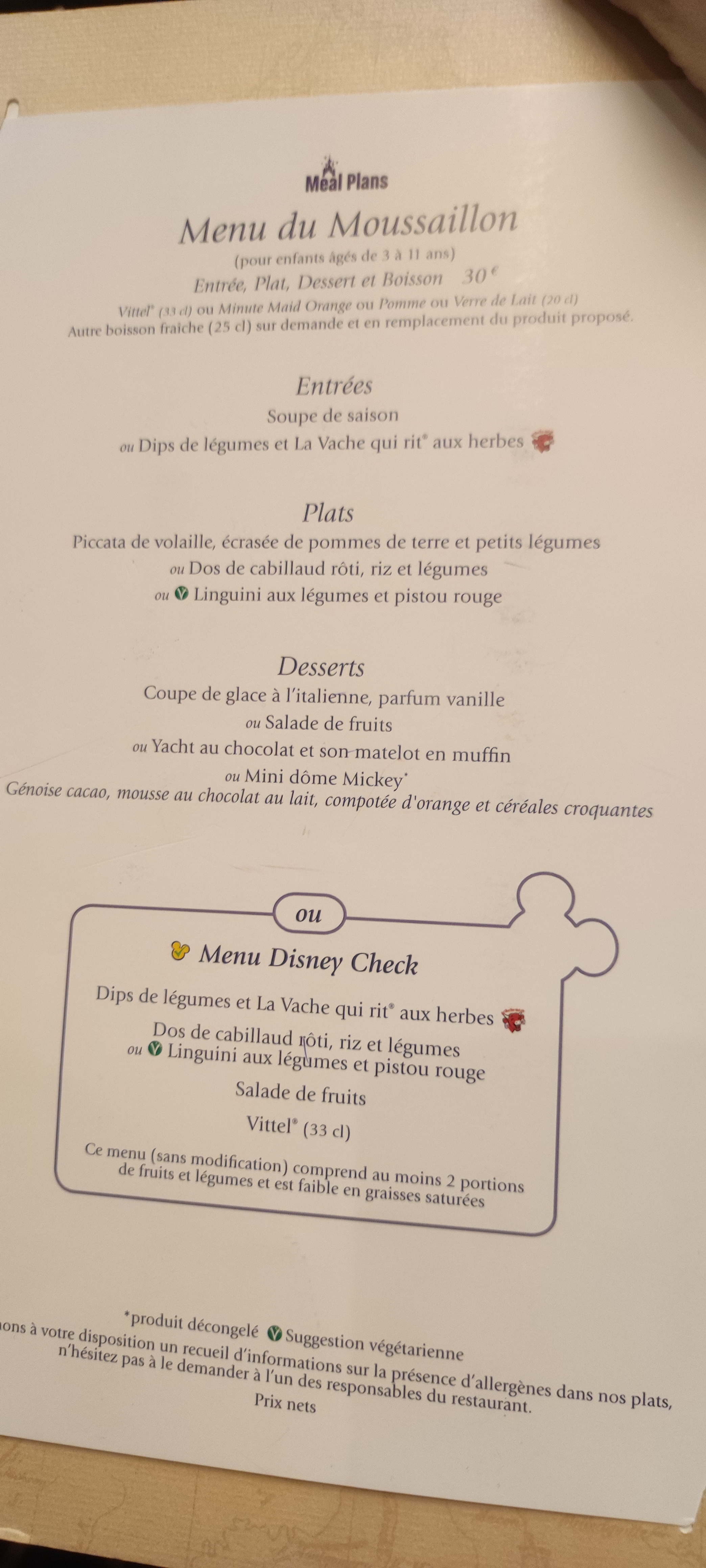 Que de Produits industriels style mc cain pour les frites, des légumes dips pas très frais pour les enfants. Les carrotes étaient décolorées, un peu blanchie. Poulet dur probablement du congelé. Glace provenant de machine industrielle style Ikea. Tout cela aux prix fort Disney. Bien décevant et hors de prix !