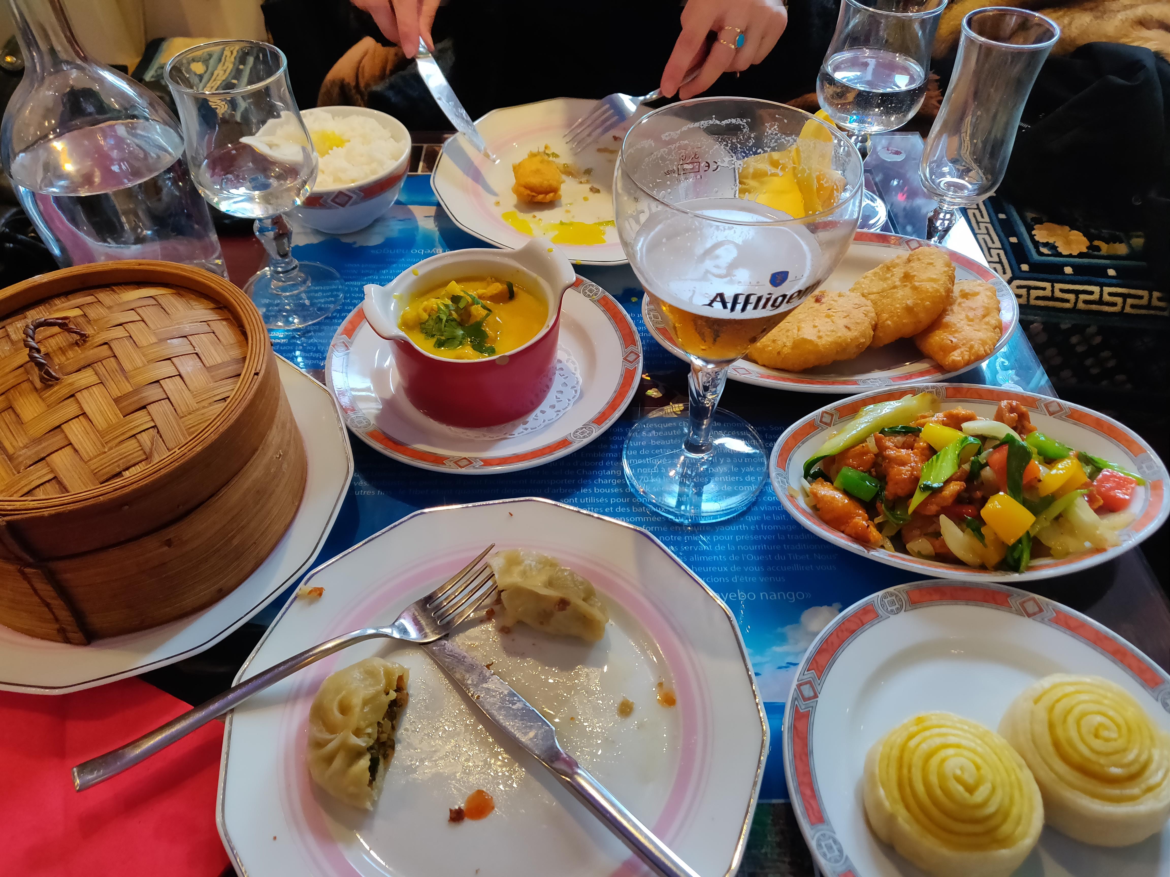 Choix d'un menu découverte très copieux et permet de goûter à tout un échantillon de la cuisine tibétaine. Serveuse qui nous a fait attendre avant de nous proposer les boissons mais qui a enchaîné très vite ensuite et bien expliqué les différents plats