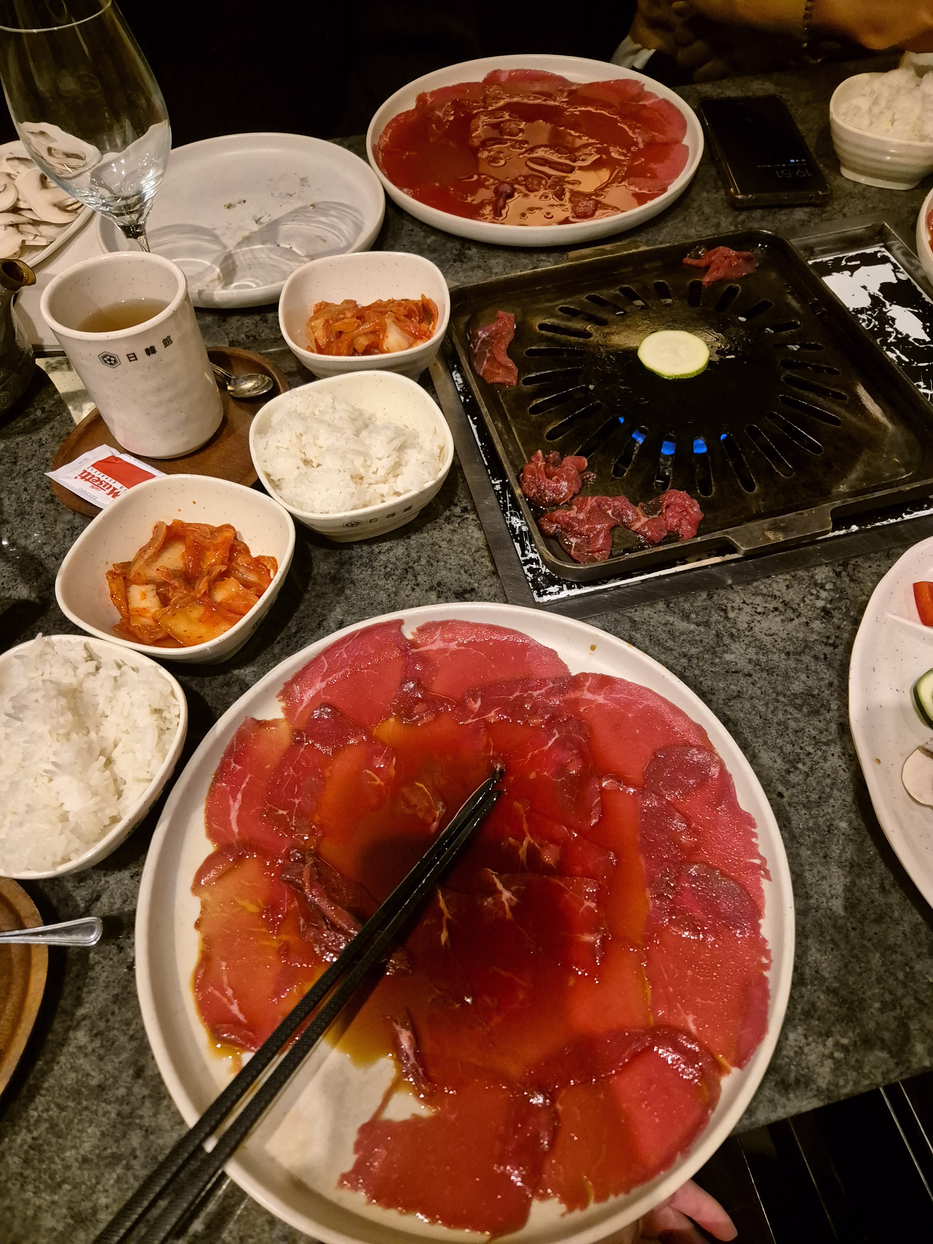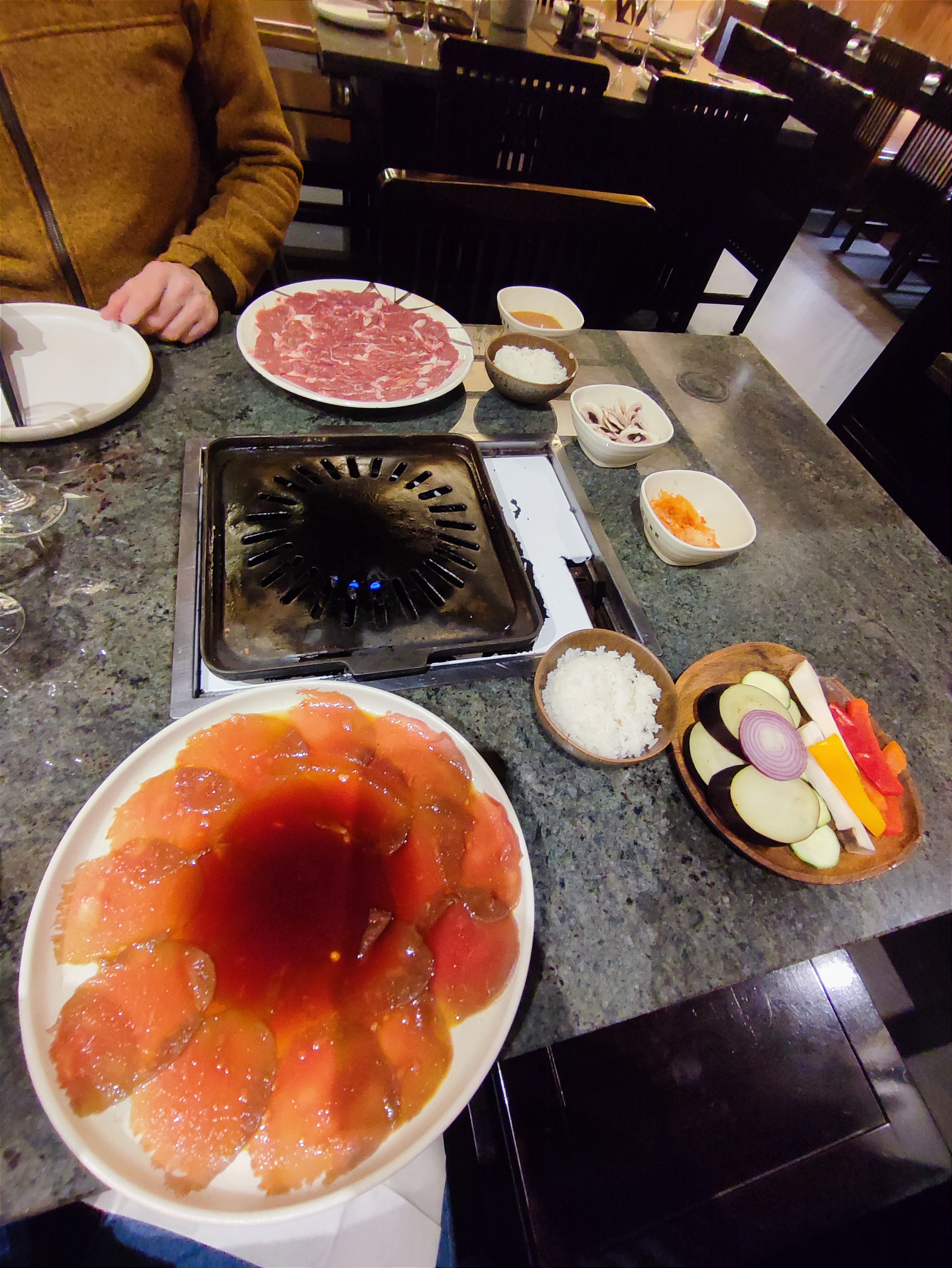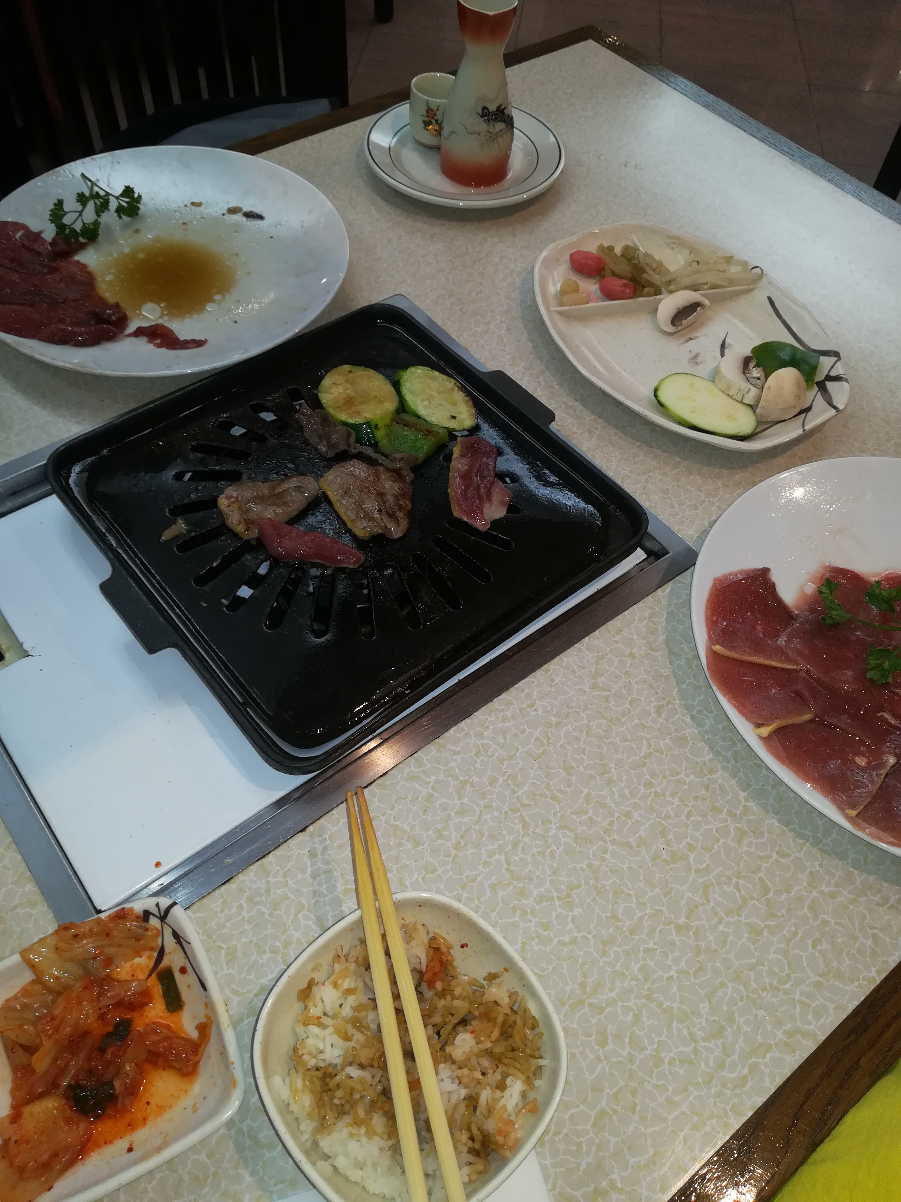 j'ai passé une bonne soirée, avec un personnel accueillant et une ambiance calme. le service était soigné et l'équipement propre (plaque de cuisson). mais le barbecue coréen n'a pas été satisfaisant : l'assiette de viande était composé de tranches très fines de boeuf (type carpaccio) mariné (bonne marinade à la sauce soja sucrée). du coup, ça reste éloigné de l'idée qu'on se fait d'un barbecue avec des tranches plus conséquentes et variées. les légumes d'accompagnement (courgette, champignon, poivron, aubergine) étaient ok même si j'aurai aimé des accompagnements typiques coréens ou japonais pas forcément à griller (par ex. kimchi, pickles de navet, etc), ainsi que plusieurs sauces pour varier les goûts sur les légumes et la viande. la soupe et la salade de choux étaient ok