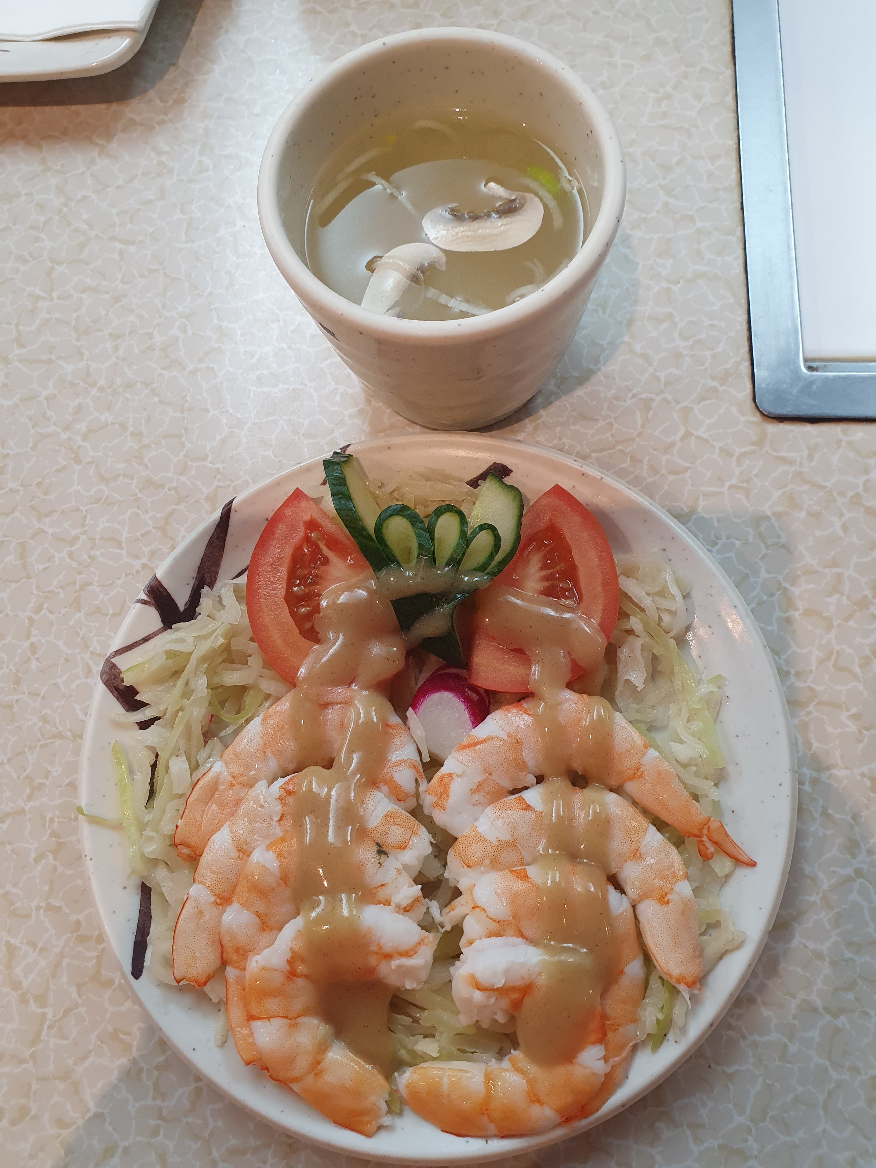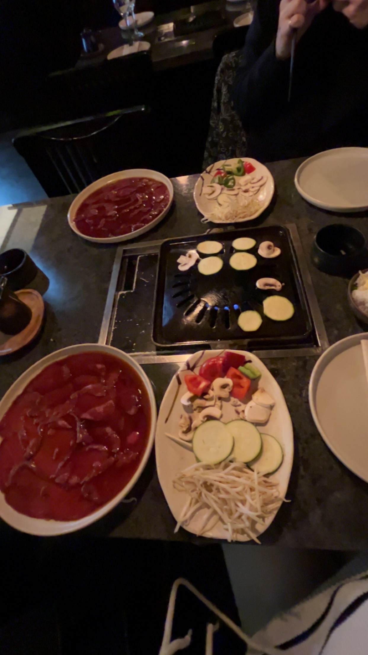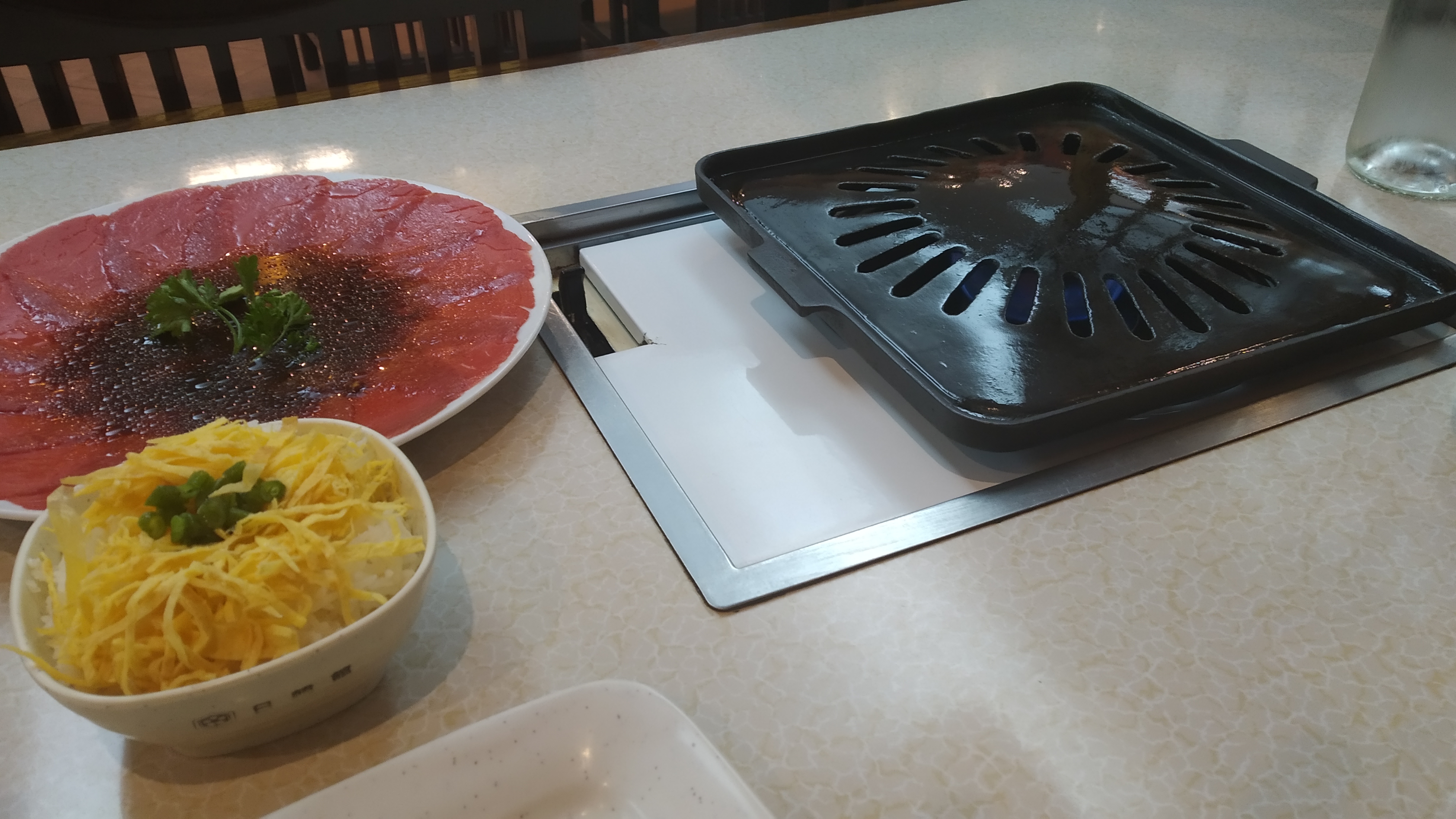 j'ai passé une bonne soirée, avec un personnel accueillant et une ambiance calme. le service était soigné et l'équipement propre (plaque de cuisson). mais le barbecue coréen n'a pas été satisfaisant : l'assiette de viande était composé de tranches très fines de boeuf (type carpaccio) mariné (bonne marinade à la sauce soja sucrée). du coup, ça reste éloigné de l'idée qu'on se fait d'un barbecue avec des tranches plus conséquentes et variées. les légumes d'accompagnement (courgette, champignon, poivron, aubergine) étaient ok même si j'aurai aimé des accompagnements typiques coréens ou japonais pas forcément à griller (par ex. kimchi, pickles de navet, etc), ainsi que plusieurs sauces pour varier les goûts sur les légumes et la viande. la soupe et la salade de choux étaient ok