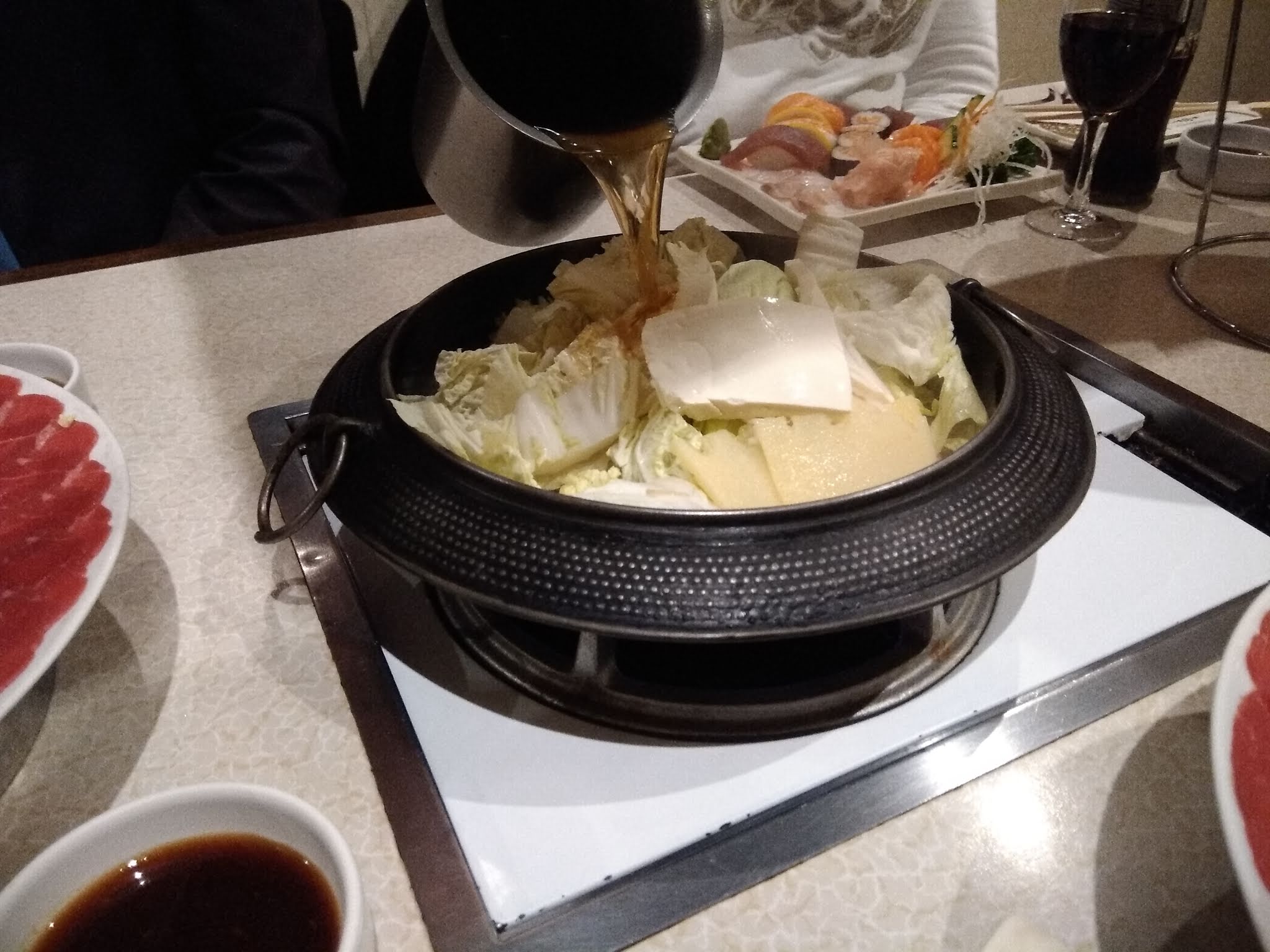 Le concept fondue dans la table est très appréciable, j'aime beaucoup le cadre du restaurant, au premier abord ce qui m'a choqué c'est le manque de sauce soja sucrée pour les makis/sushis/sashimi. Le restaurateur nous apporte les plats avec des petits pots dosés de sauce sucrée à la demande, la sauce est un mélange de sauce salé légèrement sucrée par le restaurant j'en suis quasiment sûr étant adeptes de beaucoup de marques différentes de sauces soja sucrées. Le restaurateur est très à l'attention de ces clients, j'aime celà comme nous apporter deux verres pour une bouteille de 50 cl d'une bière Asahi, c'est une bonne initiative.