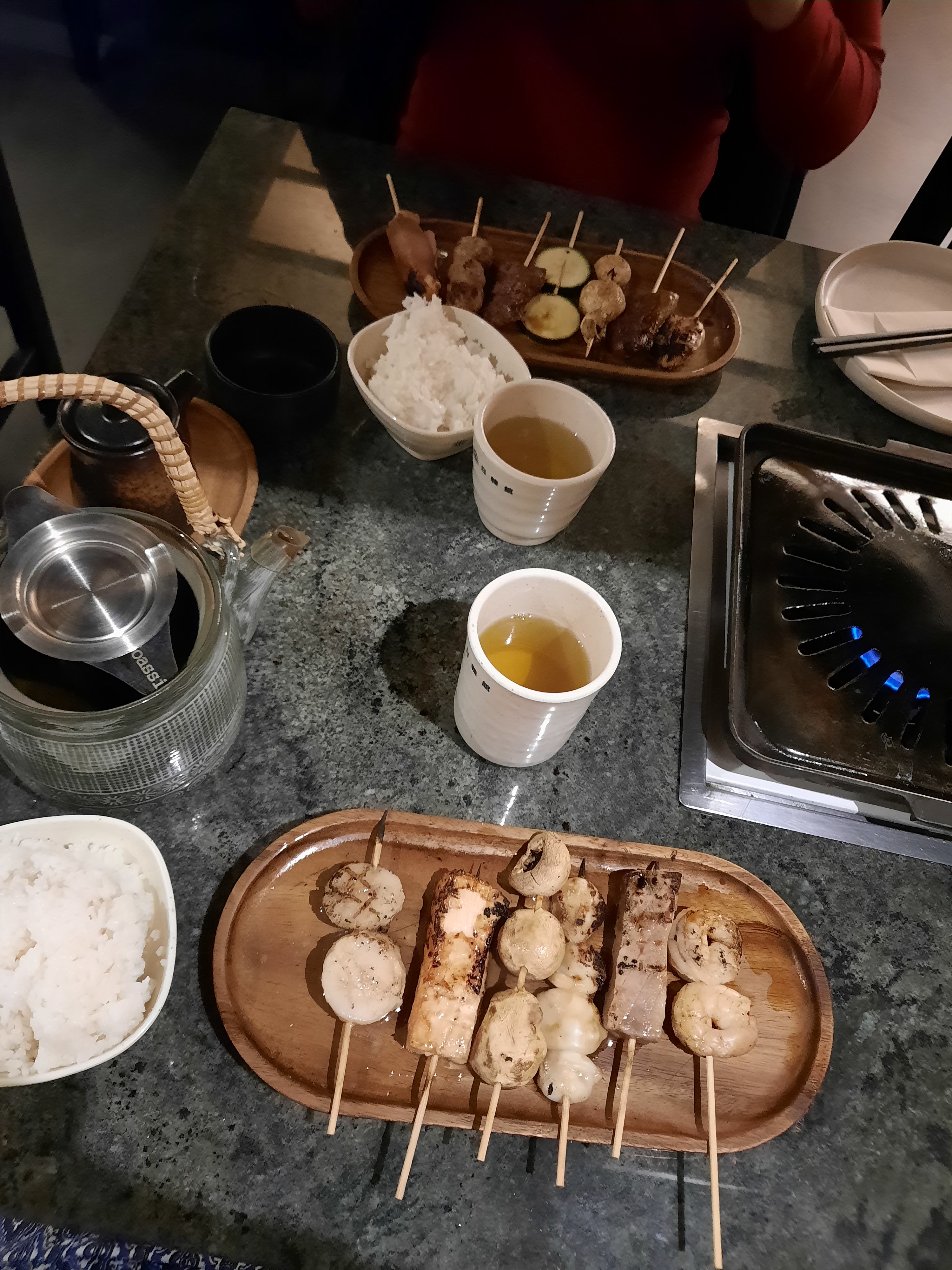 3,5⭐️ Restaurant japonais - coréen avec concept. Le barbecue coréen est assez décevant. Les portions sont vraiment TRÈS légères, tout est coupé extrêmement fin, de sorte que ça remplisse l’assiette, mais que ça ne remplisse pas le ventre. Cependant la viande marinée est très bonne, mais pour les grands mangeurs ça pourrait s’annoncer compliqué. Les brochettes possède également le même defaut La fondue par contre est assez généreuse ! Le bouillon dans lequel le faire cuire ses légumes est vraiment très bon, et n’hésitez pas à récupérer le riz de votre voisin pour le mettre dans la marmite en fin de repas ! Un délicieux finish ✨ Côté boisson, rien à dire, à part le fait qu’il n’y avait plus de saké (celui le moins cher) Pour les desserts, c’est assez gourmand. Goûter le riz au lait est vivement recommandé ! Un restaurant avec un concept très sympa, mais qui manque clairement de quantité pour le côté Barbecue.