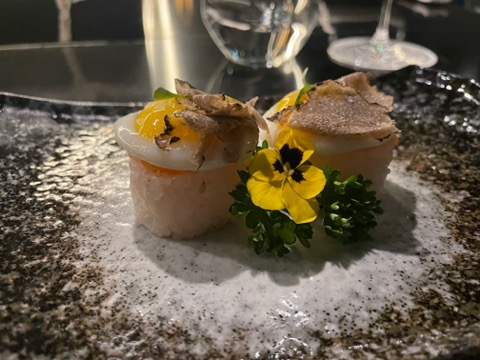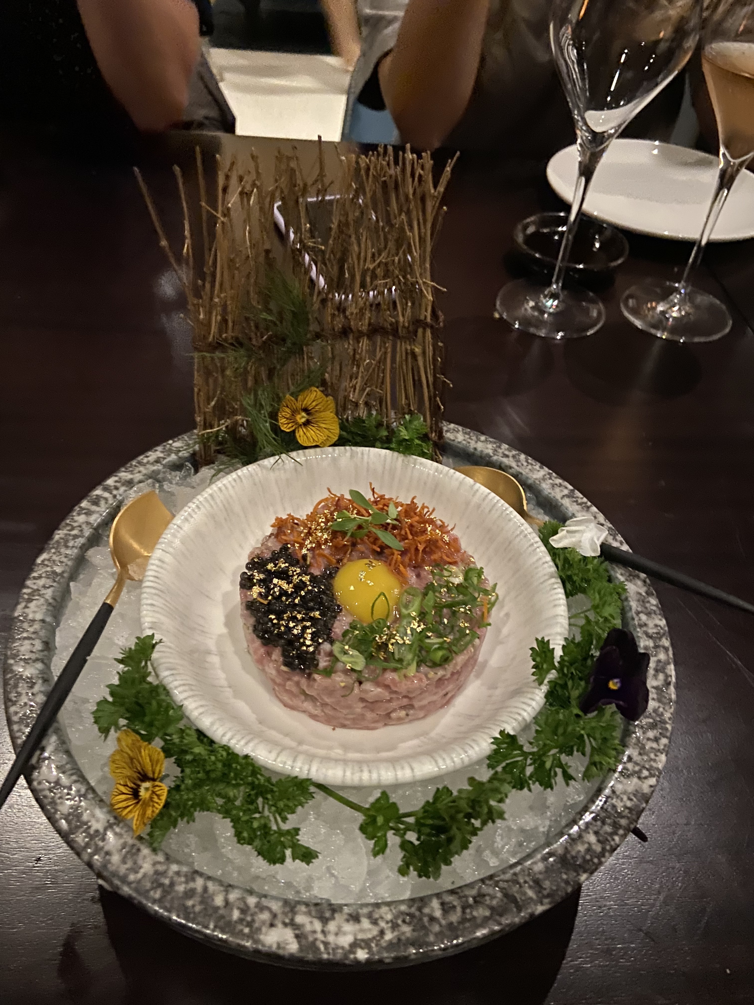 Un effort est mis sur la deco dans le sens original du terme. Un dj est là pour une ambiance musicale agréable. Les serveurs sont aux petits soins, de ce côté là ok. Concernant la cuisine, nous avons trouvé le positionnement prix très élevé, hors pour ce prix là, nous n’avons pas été suffisamment satisfaits. Pour avoir dégusté du wagyu récemment au Japon, nous avons été déçu par celui-ci. Aussi, en plus de 2 petits plats, nous avons pris les 500g de wagyu + pâtes à la truffe (170€) déclarant partager à 3 : nous aurions apprécié que l’on nous serve 3 plus petites portions et pas 2 dans lesquelles il fallait piocher. La présentation riz / wagyu / oeuf de caille / truffe était très jolie et c’était assez bon. Je pense qu’il y a du potentiel mais qu’une piste d’amélioration est moins de choses à la carte et chacune incroyable en terme de goût (vu les prix), on a envie de plus de saveur encore.