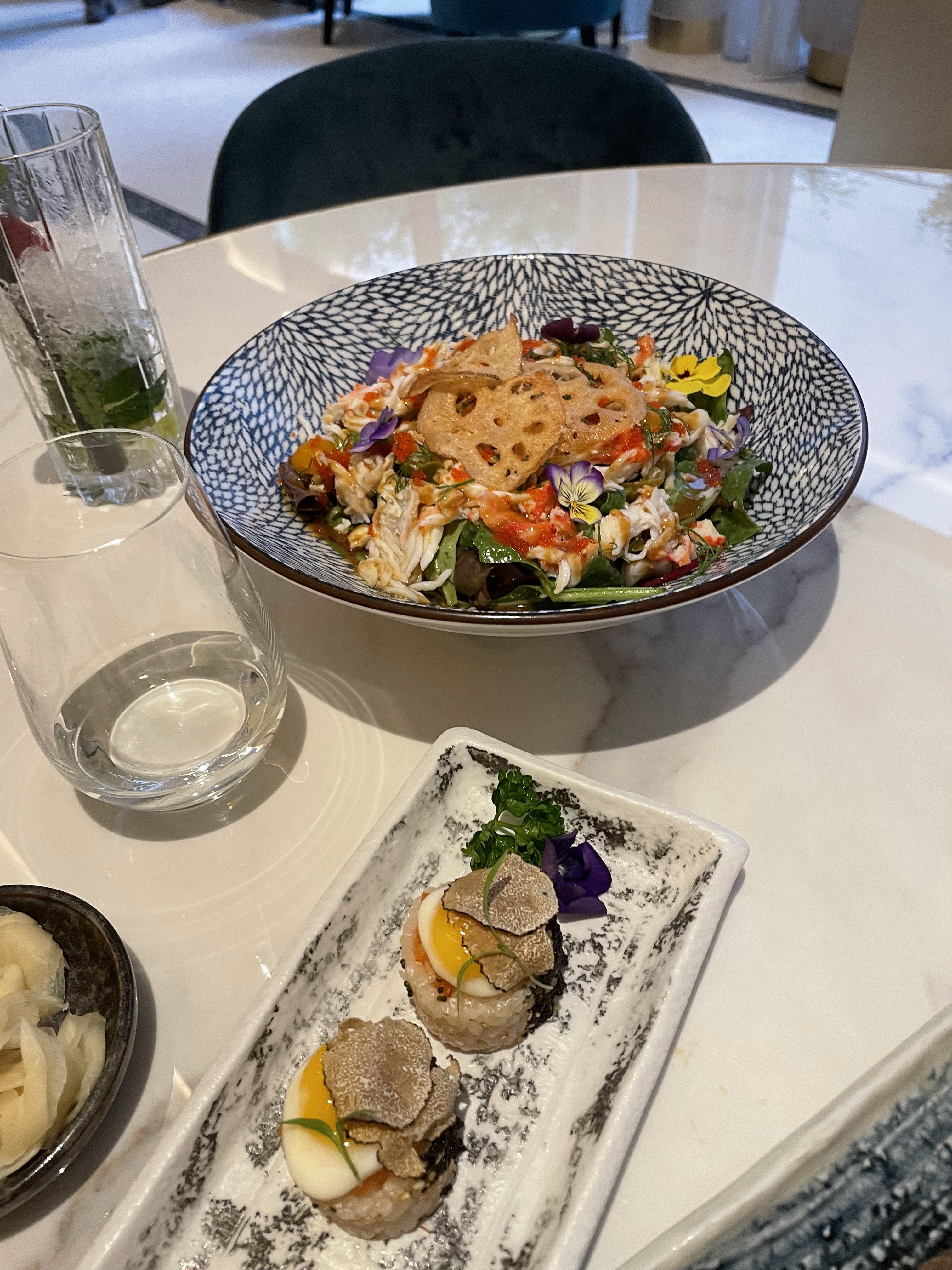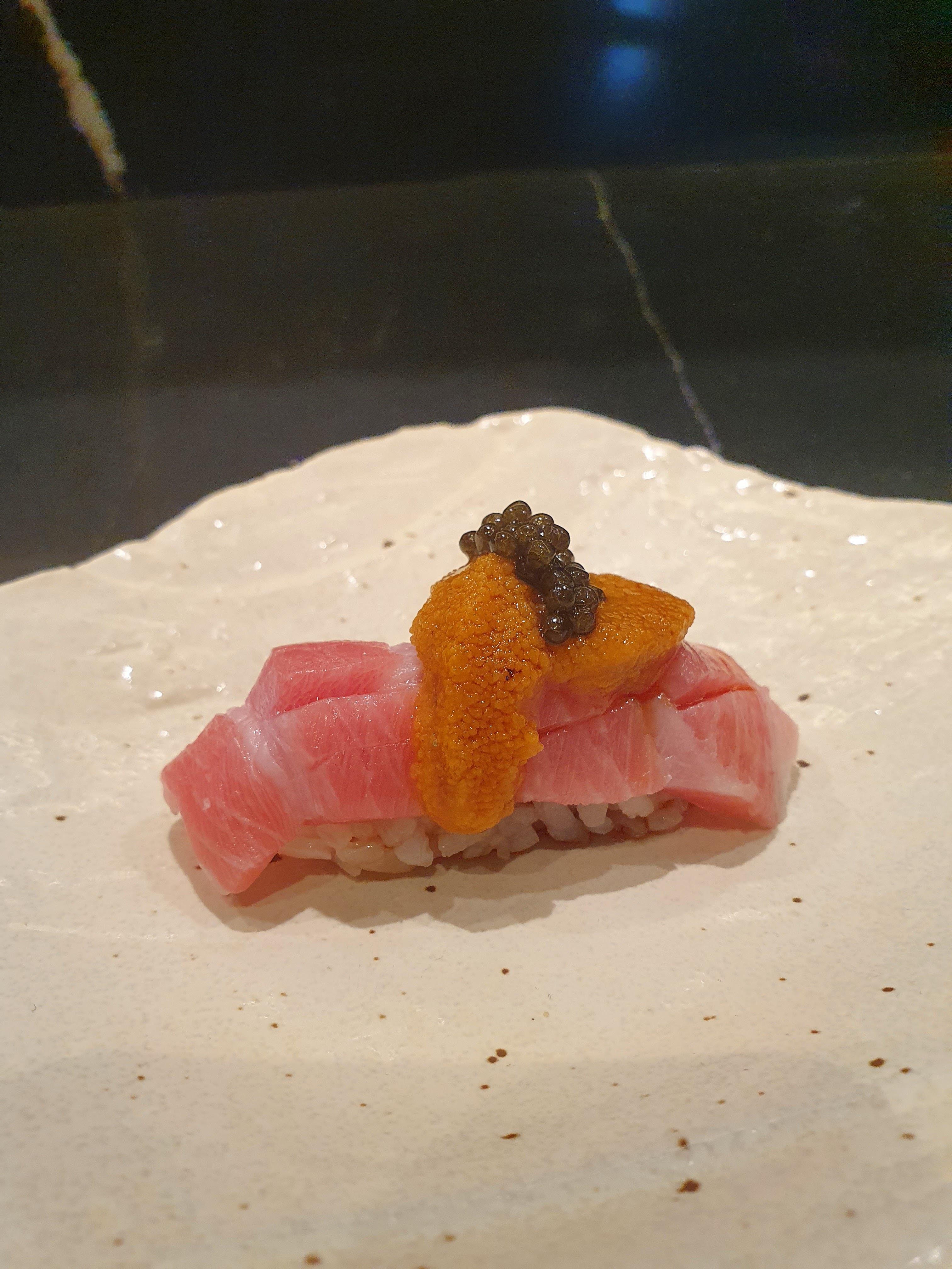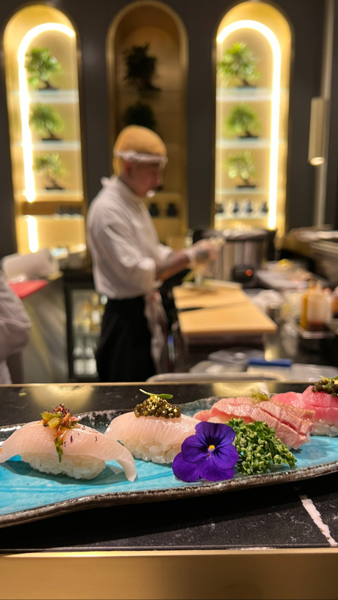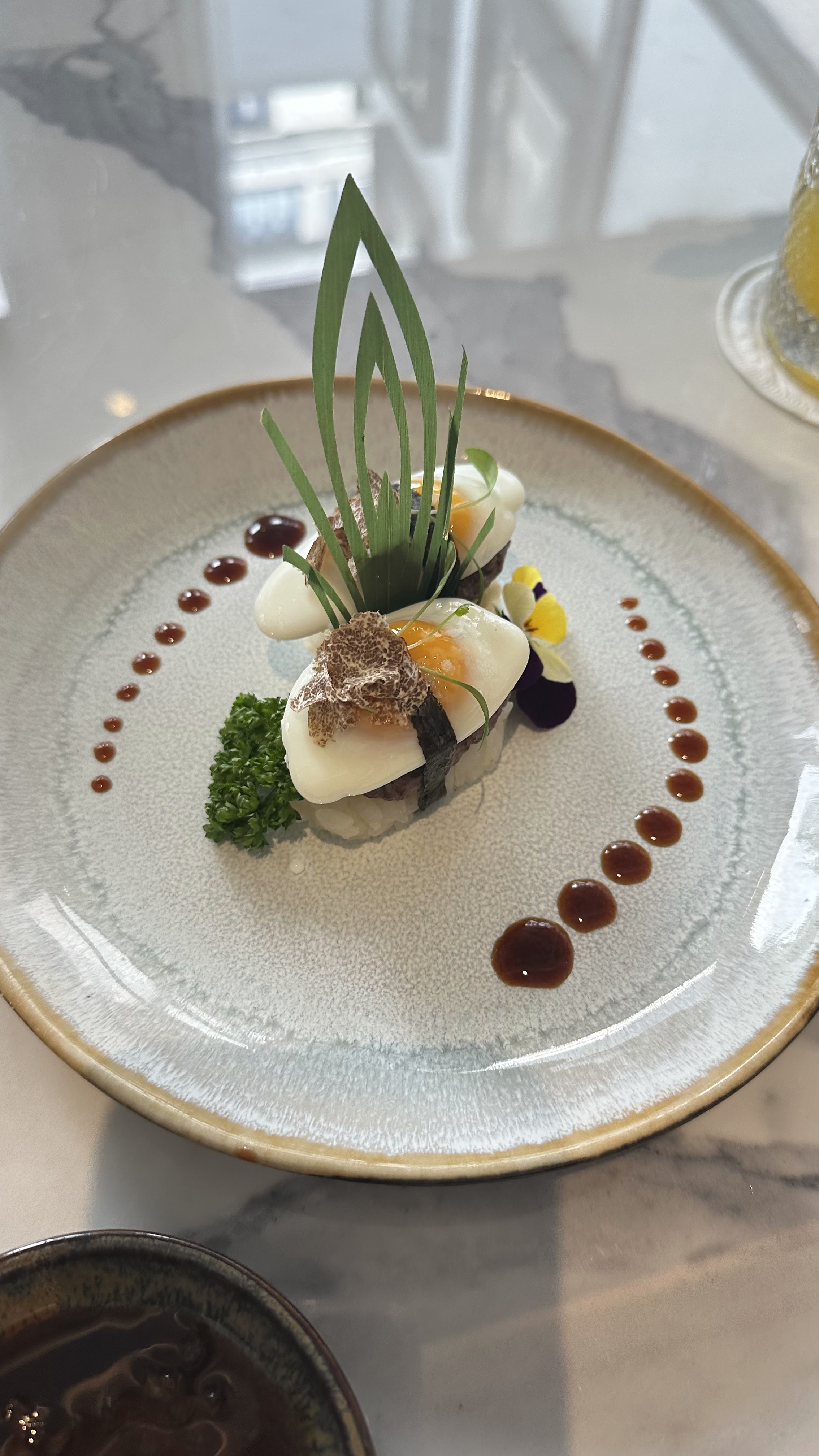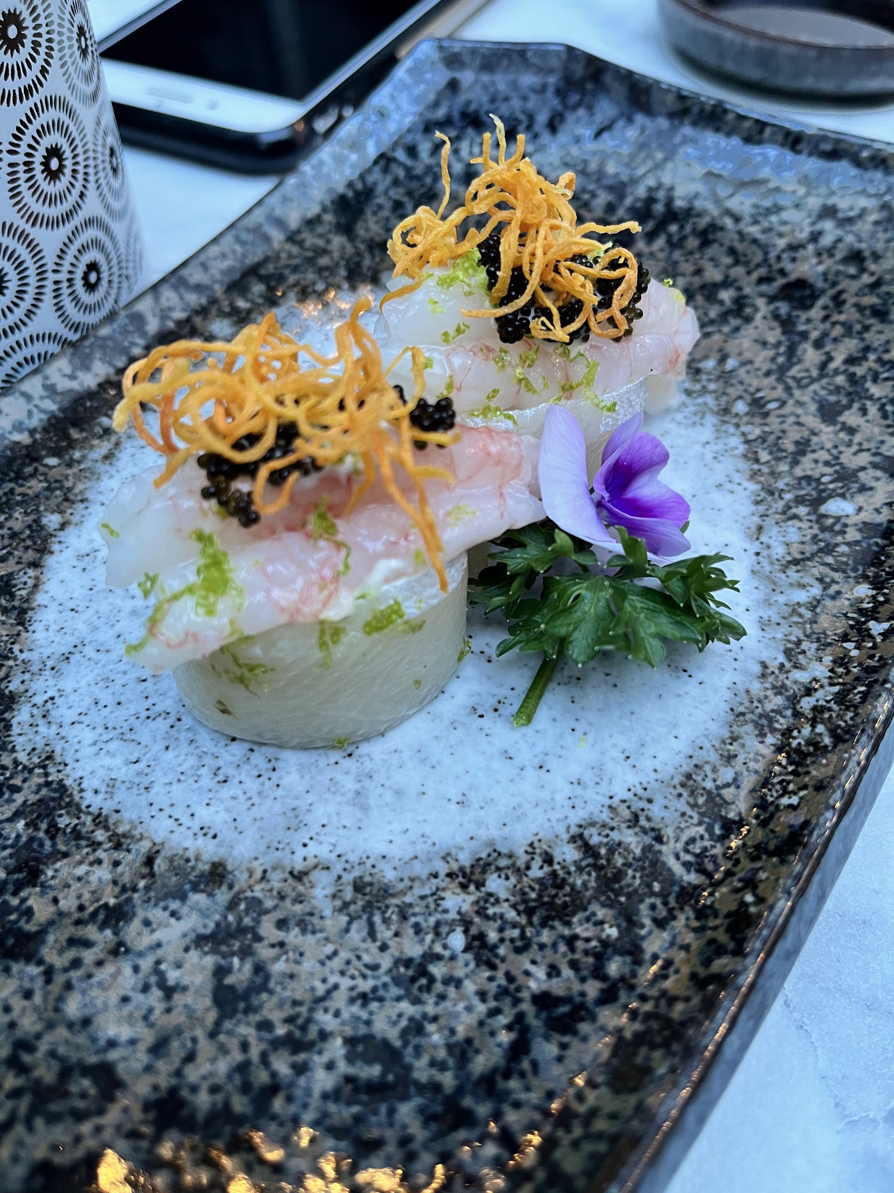 A l’arrivée : Le service est irréprochable, l’accueil également. Au niveau de la nourriture la carte est trop longue, on lit un livre ! Il manque peut être de photos pour nous aider à faire le choix sur les propositions qui ne sont pas celles du quotidien. Je le répète la carte est longue si on prend le temps de tout lire il faut 20 min. Il est important de pouvoir se projeter sur ce qu’on mange. Petit bémol, la carte est en QR code. Pour un restaurant de qualité je ne trouve pas ça top. Ça reste que mon avis. En bouche : Côté saveur c’est original mais un peu trop cher pour ce que c’est, les poissons utilisés n’étaient pas exceptionnels, le caviar utilisé ne l’est pas non plus, je pense à un caviar qui n’a pas un goût assez prononcé pour se marier avec le reste du sushi. Dans sa généralité on est sur une nourriture japonaise de luxe mais avec des produits de moyenne game. Pour ce type de lieu et le prix qu’on paie il faut que la nourriture proposée soit à la hauteur. Ici on croit manger sur un restaurant japonais pour touriste des Champs Elysées. Ça laisse une impression de nourriture de luxe mal maîtrisée. En conclusion: Tout est dans la présentation et le service, le décor. Très peu dans la qualité des produits.