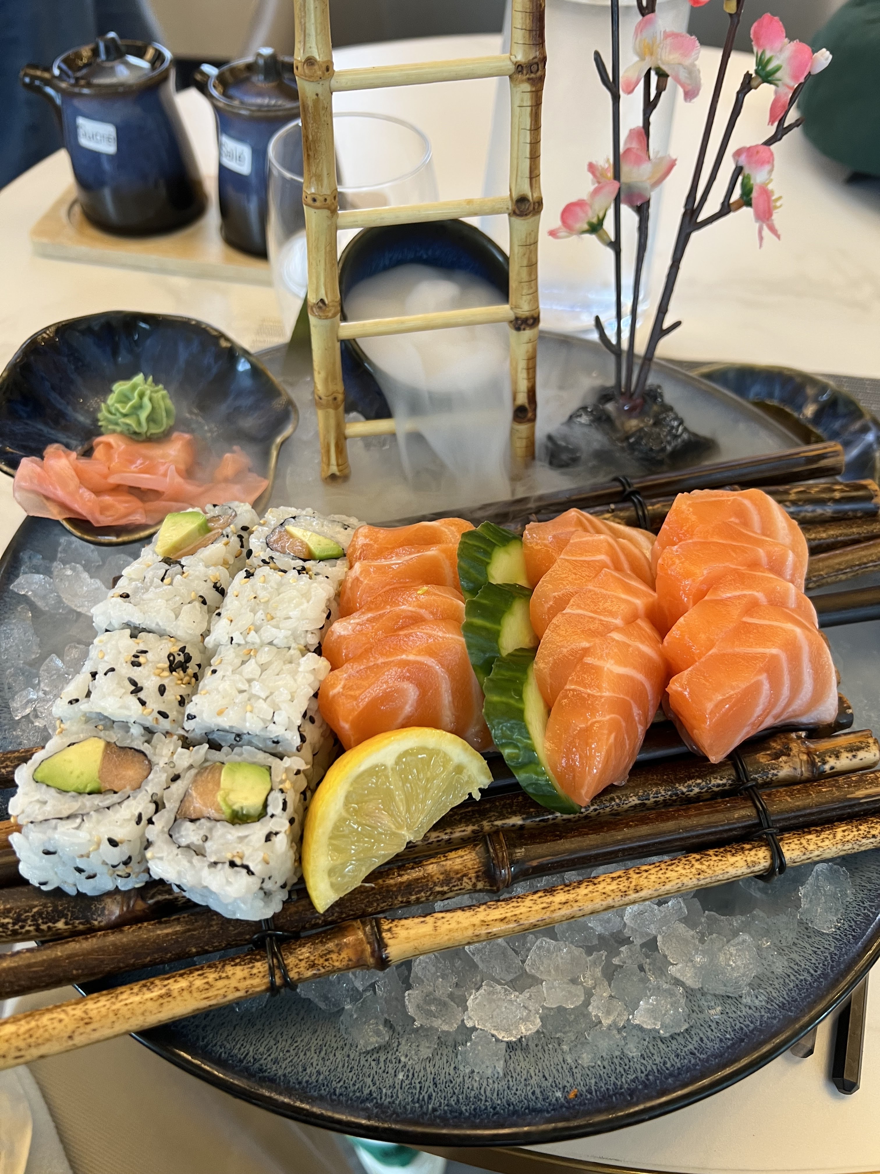 Un très beau cadre particulièrement accueillant. Je recommande la salle à l'étage qui est vraiment très calme et dont j'ai adoré la décoration. L'accueil est également remarquable avec des sourires lumineux qui font chaud au cœur. Quant aux plats, je me suis tout simplement régalé. Je ne sais pas comment ça s'appelle mais nous avons eu droit à un assortiment de sushis présentes sur une sorte de bateau avec une proue en forme de dragon. Non seulement la présentation est très belle mais le contenu était excellent. Je recommande vraiment ce restaurant où je viens de passer un très bon moment.