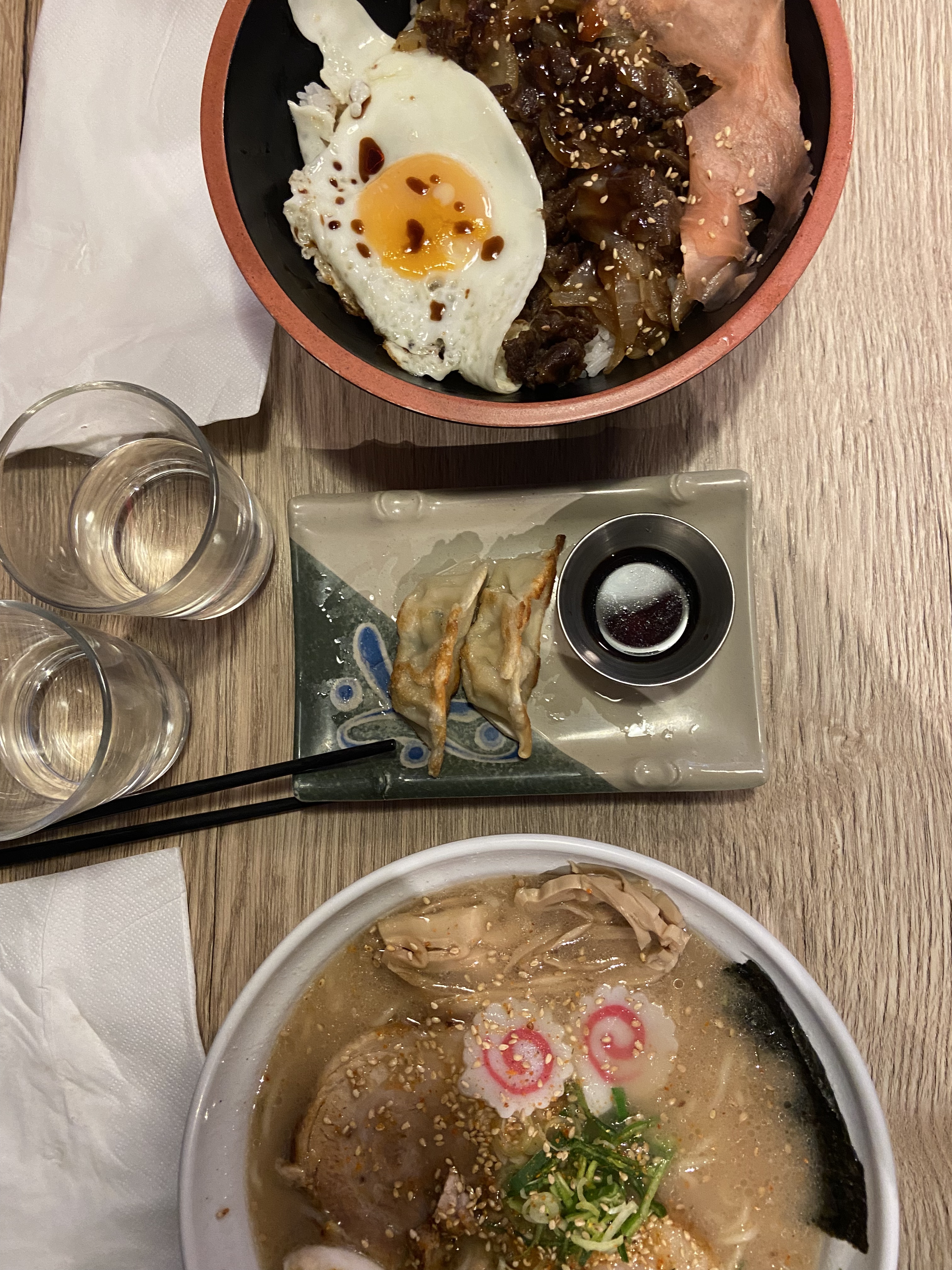 Déco très sympa mais ça s'arrête là. Riz basmati au lieu du riz japonais, takoyaki avec micro morceaux de poulpe en sur-cuisson, gyudon fade et gyoza poulet pas terrible.