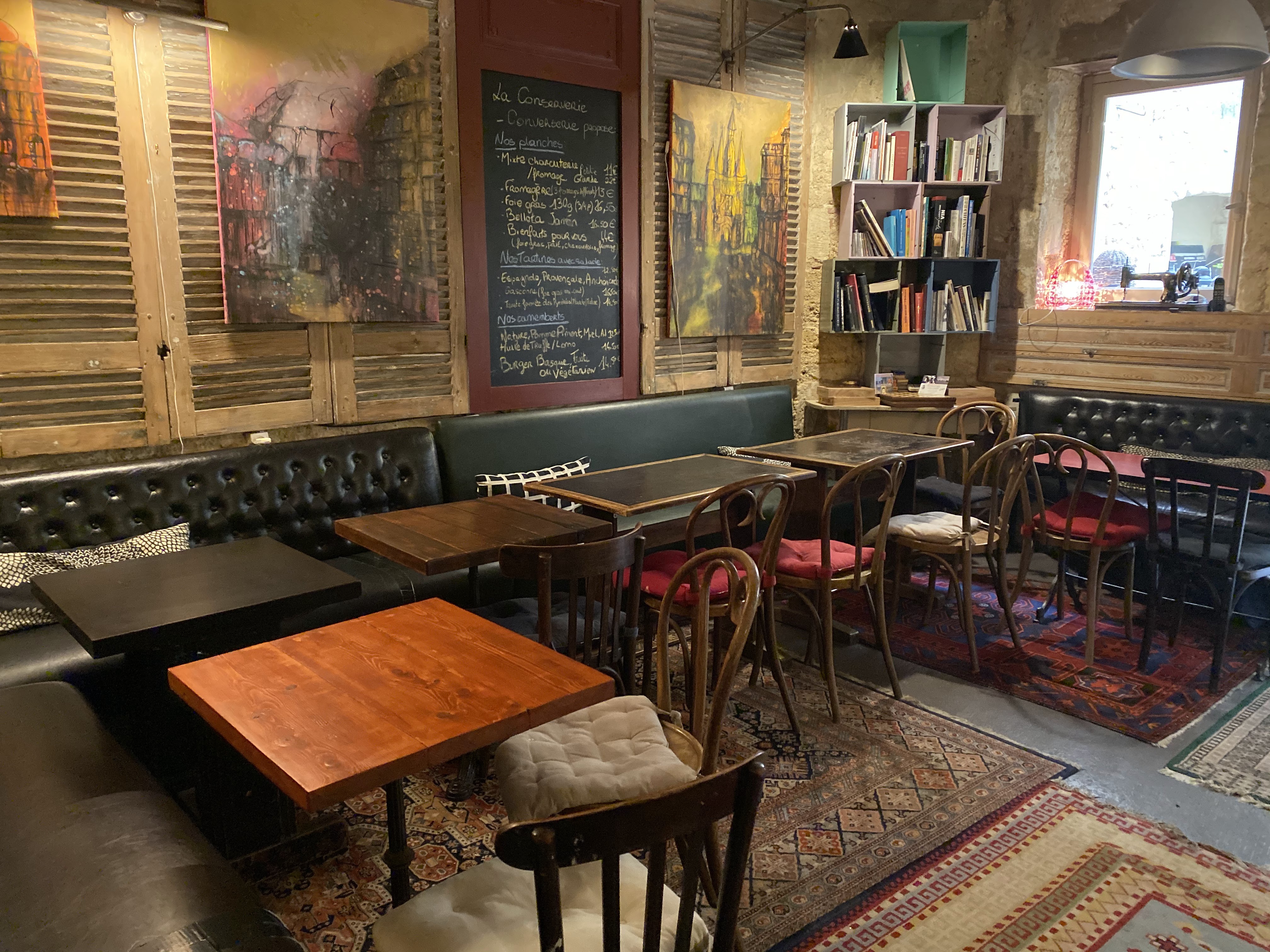 Super découverte aux Chartrons ! Je ne suis pas du quartier et j'étais en train de découvrir les boutiques (tout de même très clichés des alentours), quand je suis passée devant la conserverie-converserie, dont la devanture ne paye pas de mine mais qui émerveille par sa décoration éclectique une fois à l'intérieur. La carte, ou devrais-je dire l'ardoise, change toutes les semaines paraît-il : elle est courte et donc signe de qualité des mets, tout ce que j'aime. Nous avons diné dans le patio au fond du resto, hyper sympa.