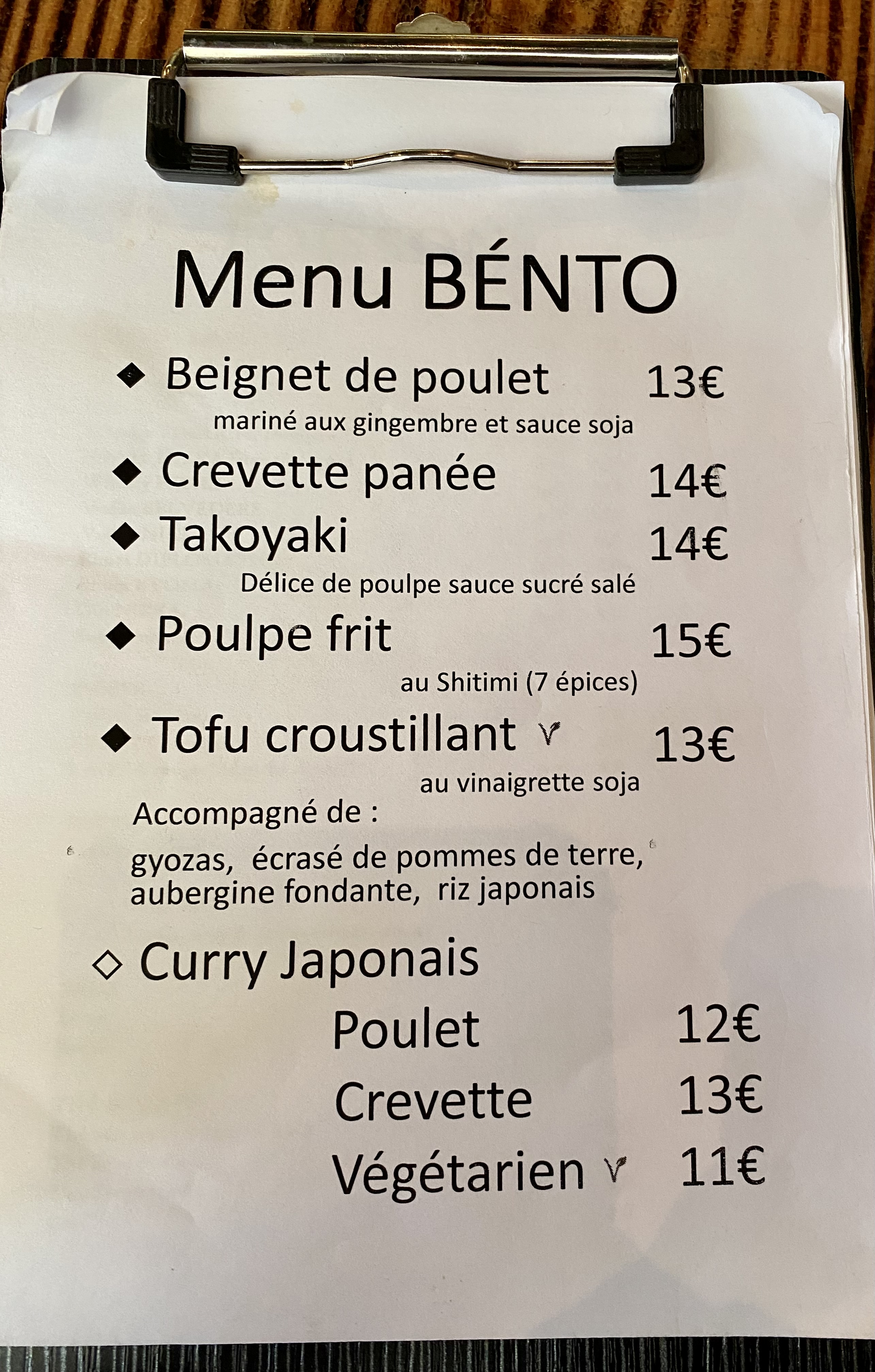 Bento OK le midi sans être exceptionnel. Il manque une touche qui apporte de la saveur et des épice au plat. Le riz et fade et la quantité est limite pour 13 euros. Le tofu frit prend de la place mais ne nourrit pas beaucoup.