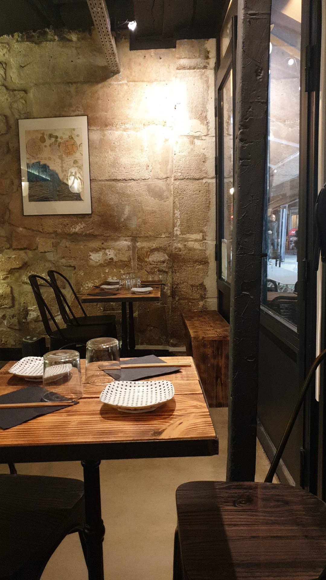 Petit restaurant bar sobrement mais joliment décoré. Excellente cuisine qui propose de très bons tapas japonais le noir et accueil très chaleureux. Rue calme où il est agréable de prendre un verre en terrasse. Pour les amateurs, choix de sake et whiskys japonais!