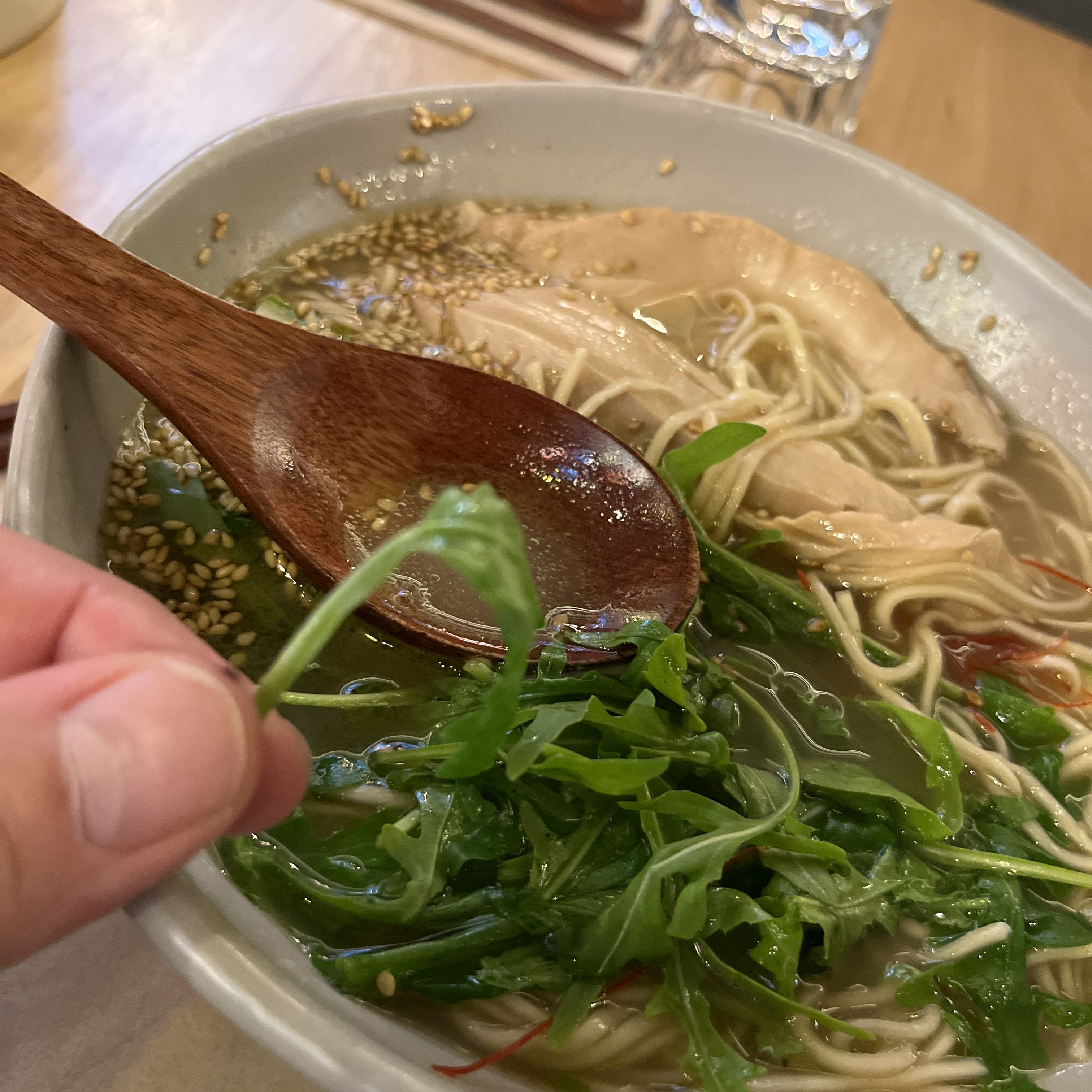 Serveur très sympa mais nouilles industrielles en petite quantité, accompagnées de quelques feuilles de roquette, d'une asperge crue, de petites tranches de poulet plutôt bonnes. Dans l'ensemble le ramen du moment manque atrocement de goût.