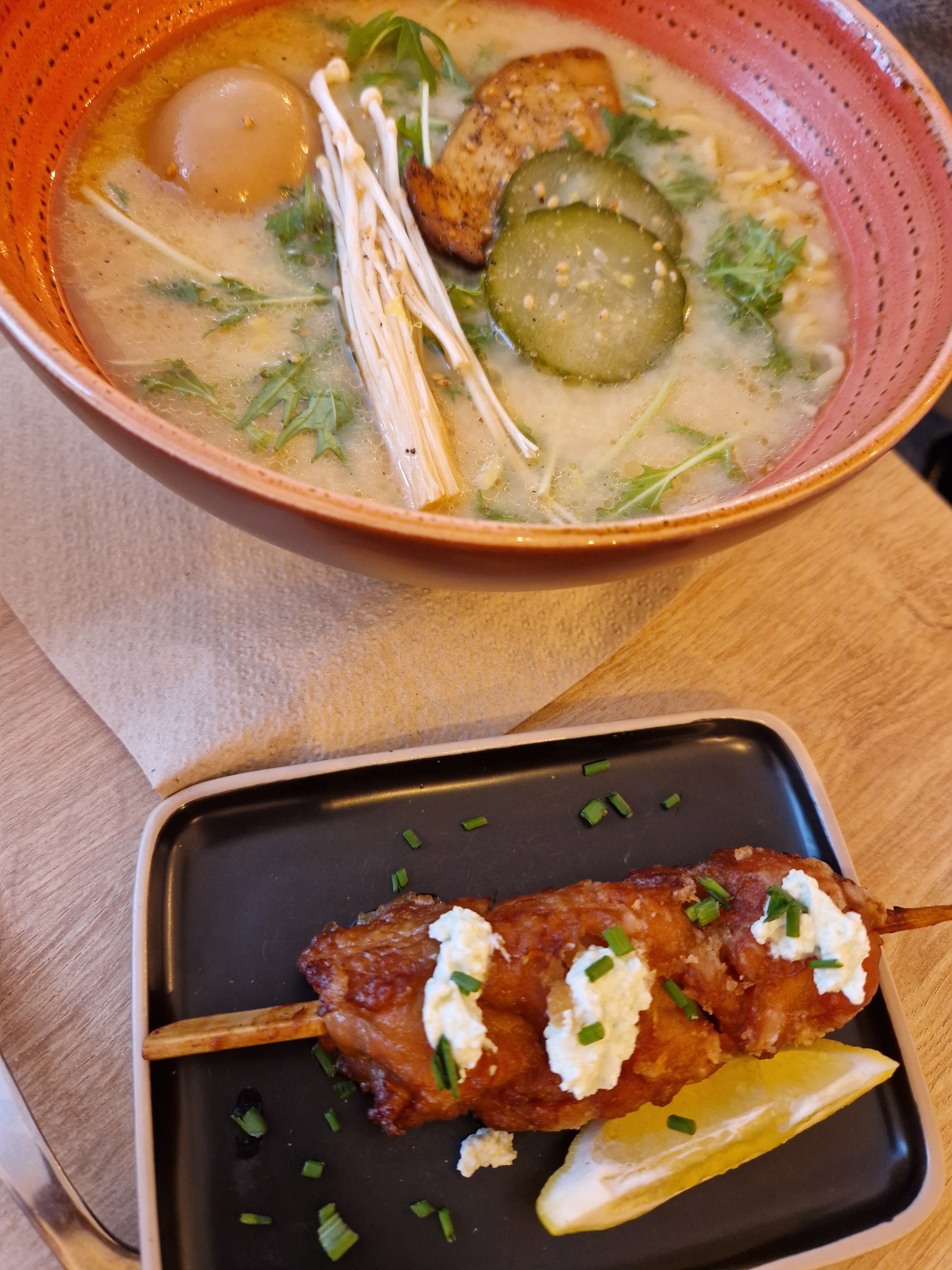 Proposition pour végétarien excellente. Ramen veggie avec sa brochette de tofu pané et un bel assortiment de champignons 😋 Service au top dans l'horaire annoncé.