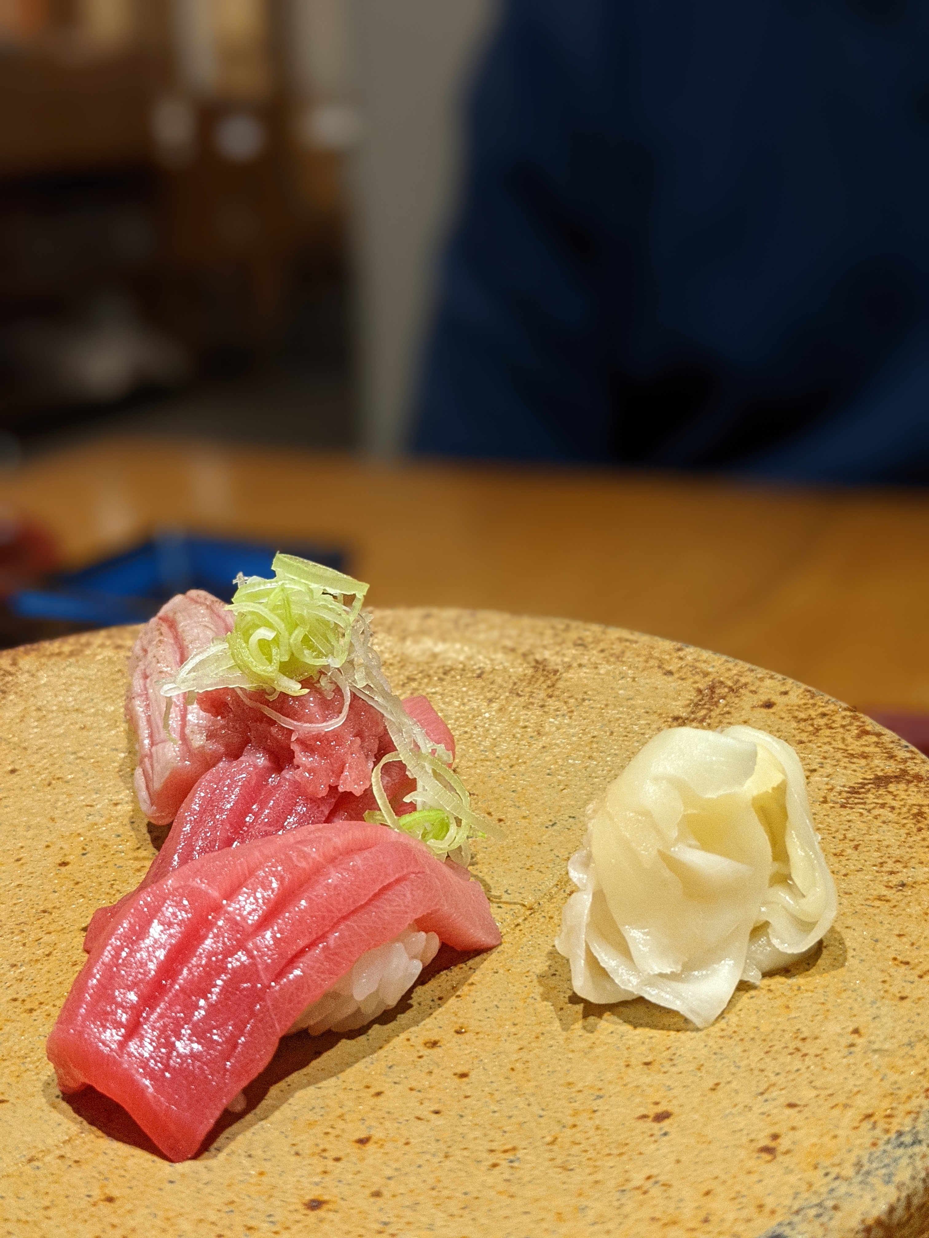 Adresse très surévaluée, bons aliments avec une preparation relativement banale, surtout pour des prix très relevés. En photo les sushi d’anguille à 18€ aux dimensions très réduites, et les 3 sushis toro à 28€ largement plus délicieux à l’œil qu’au palais. Comptez 150€ pour deux repas légers