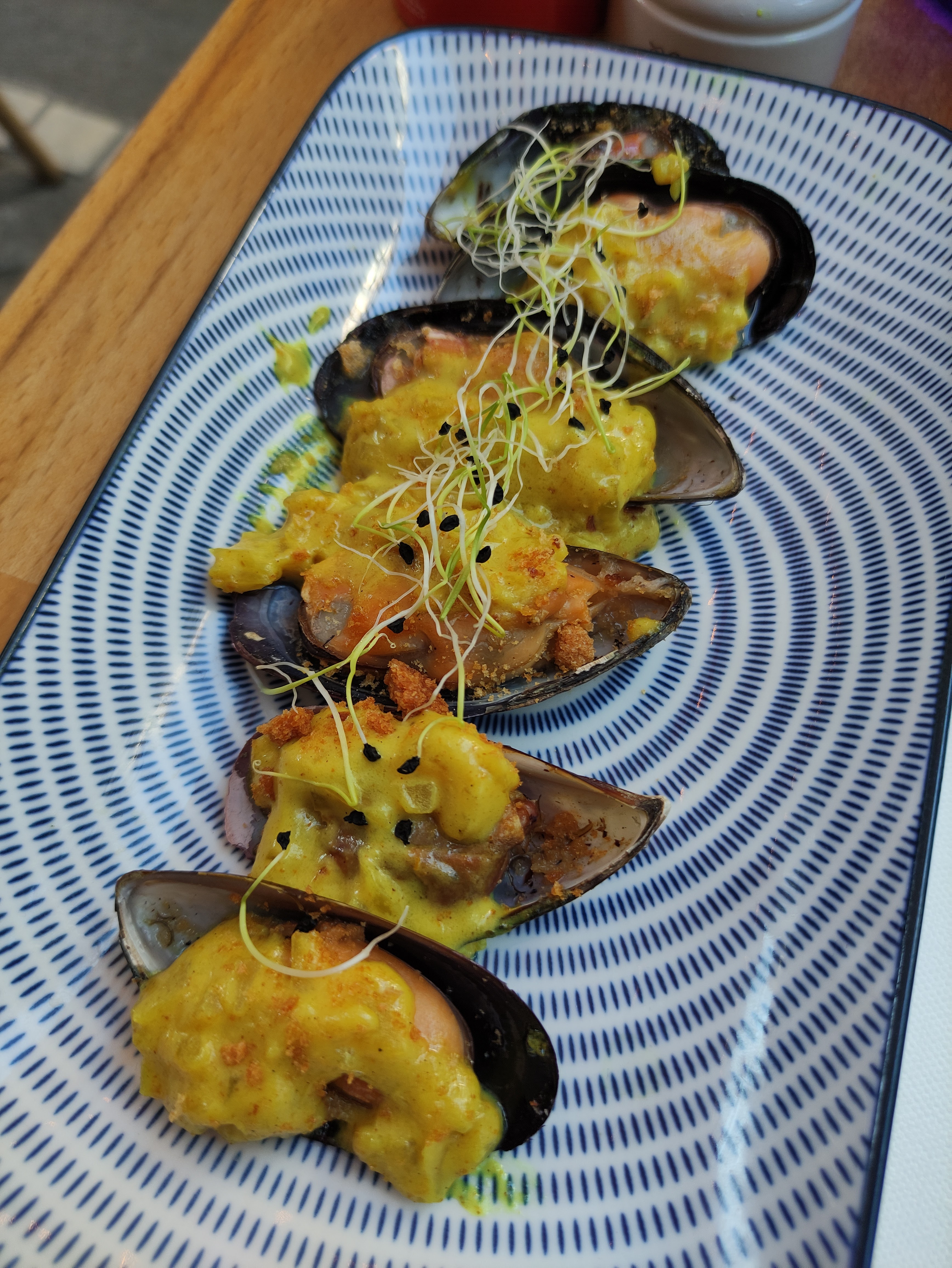 Bon repas ! Dans une rue avec plusieurs bars et restaurants. Vous pouvez vous y asseoir confortablement. Sur les conseils du serveur, nous avons pris plusieurs entrées pour un dîner varié. Dans tous les cas, prenez les moules sauce curry. 🤗 Inconvénient : personnes qui fument sur la terrasse.