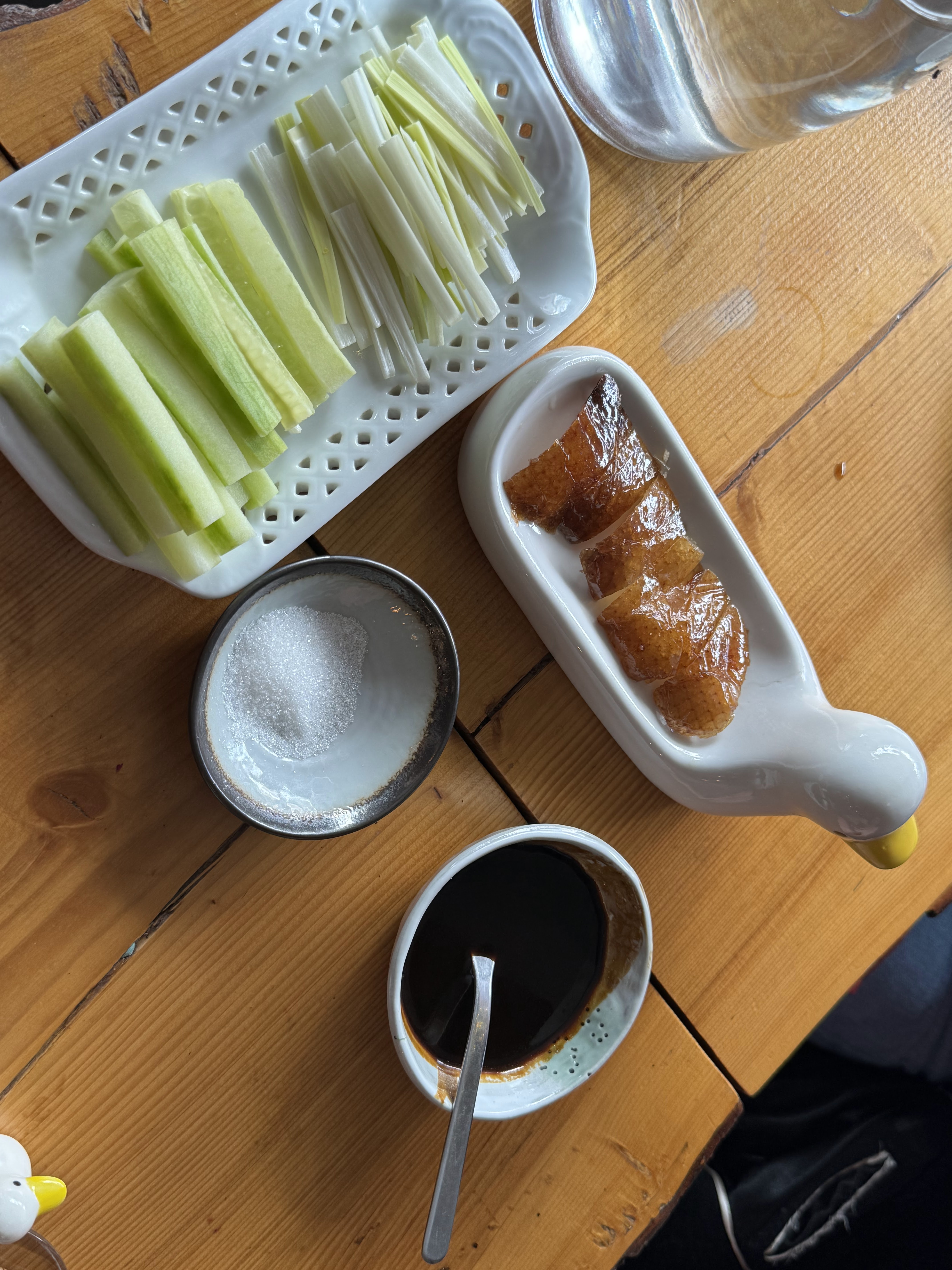 Déçu de cette expérience, l'entrée se résume à 4 petits morceaux de peau de canard avec un bol de sucre, le plat comprend la viande du canard laqué servi avec des crêpes, légumes et une sauce sucre (maison ?) qui vient camoufler le laquage, et pour finir un léger bouillon de canard sans véritable goût. Enfin, aucune démonstration du canard entier et de sa découpe, comme affiché au menu. Prix final 69 euros.