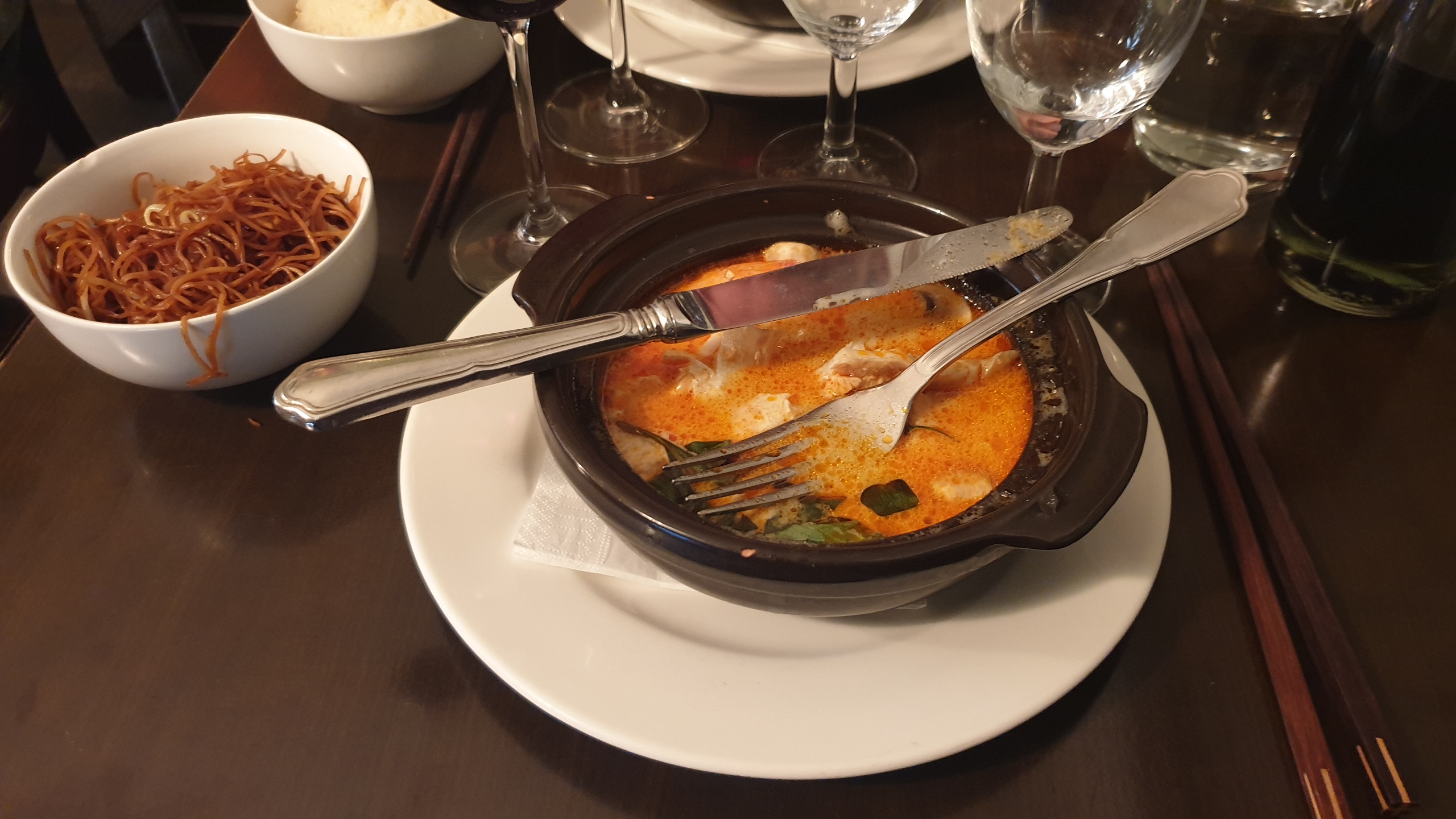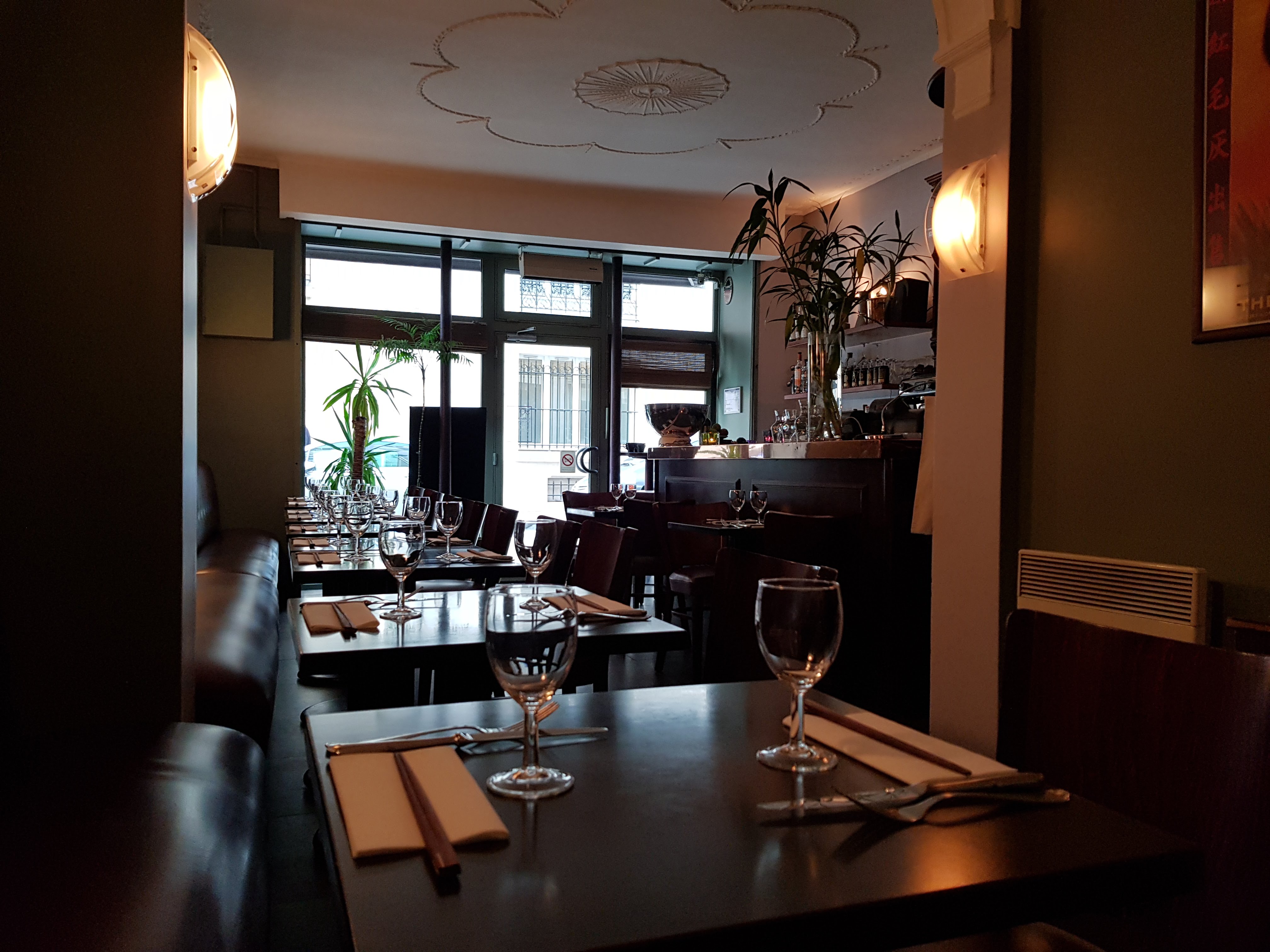 The restaurant a tous les atoûts Bien situé dans une petite rue avec un bar mitoyen pour prendre l apero Le décor est très beau, sophistiqué en restant simple Le service est impeccable et souriant Il y a un vestiaire Pas de sentiment d'urgence, de fatigue ou d agacement e la part de l'équipe Les produits sont de très belle qualité et les recettes alléchantes Ne pouvant pas manger épicé j'ai pris le poulet aigre douce : une vrai réussite Mon ami a pris le poulet au curry vert dont il n'a pas laissé une miette Les nouilles sautées au soja sont fines et délicieuses Nous a été proposé gracieusement un amuse bouche au saumon et fin de repas une meringue. Encore une fois très belle qualité Nous n'avions plus faim pour le dessert à notre grand désespoir Je reviendrais certainement