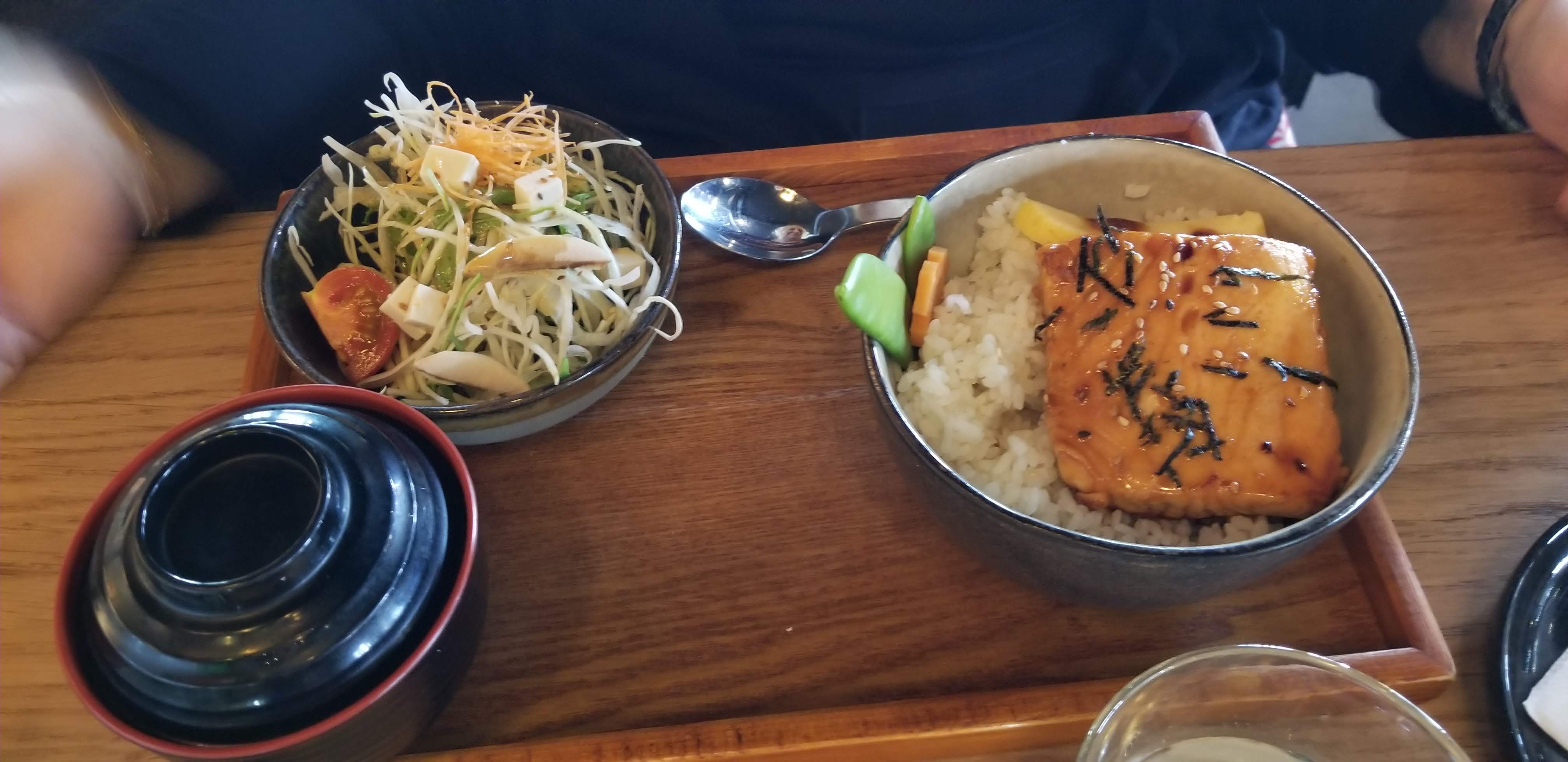 J’ai voulu tester le restaurant pour la première fois avec ma mère. Je ne pense pas que l’on reviendra. Malgré un personnel agréable, la qualité des menus n'étaient pas au rendez-vous, surtout au prix payé. J’ai choisi le menu classique aux alentours de 18€ comprenant une soupe miso, une salade, un plat au choix (j’ai pris du poulet pané + riz) et un dessert au choix (panna cotta au thé vert). Je n’ai pas trouvé mon plateau folichon. La salade n’était pas assaisonnée, le riz était fade et j’avais une sauce à la limite du goût barbecue. J’ai tout mélangé pour avoir un « plat ». Quant à ma mère, elle a choisi le plateau végétarien. Il comprenait un plateau de sushis à la patate douce, 3 asperges et 3 haricots verts qui se battaient en duel dans de la vinaigrette et 3 tempuras de légume. Pour le dessert, elle a eu droit à un thé tellement dilué dans de l’eau que je ne saurais pas dire quel était son arôme, ainsi qu’un mochi. Bof.