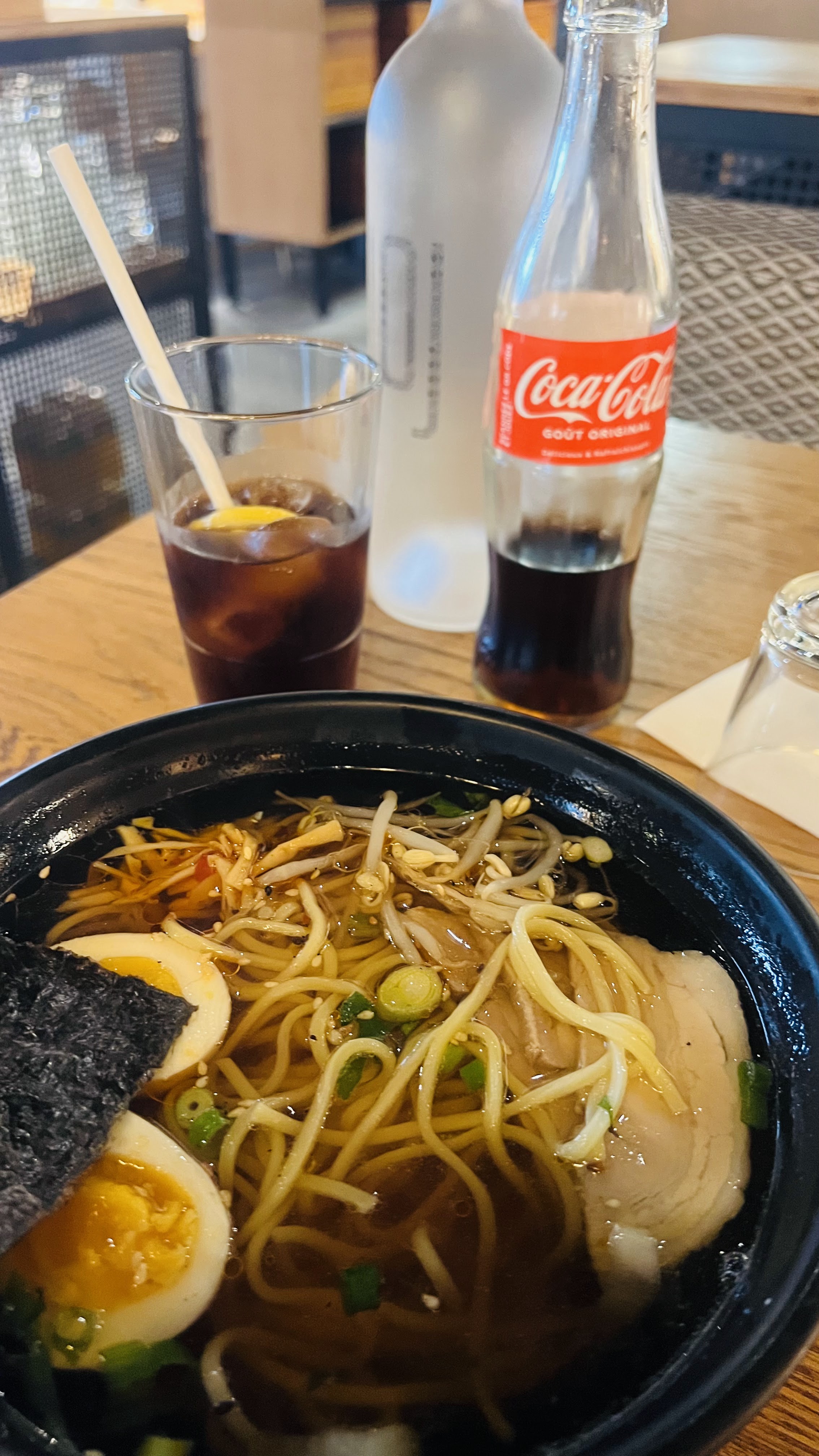 le ramen pas vraiment un vrai ramen ! quantité médiocre de pate le poulet aucun gout poulet en tranches couleur bizarre ! pas de légumes et potage froid.. il faudrait revoir les quantités,et la vrai recette du ramen…. vraiment pas au top ……