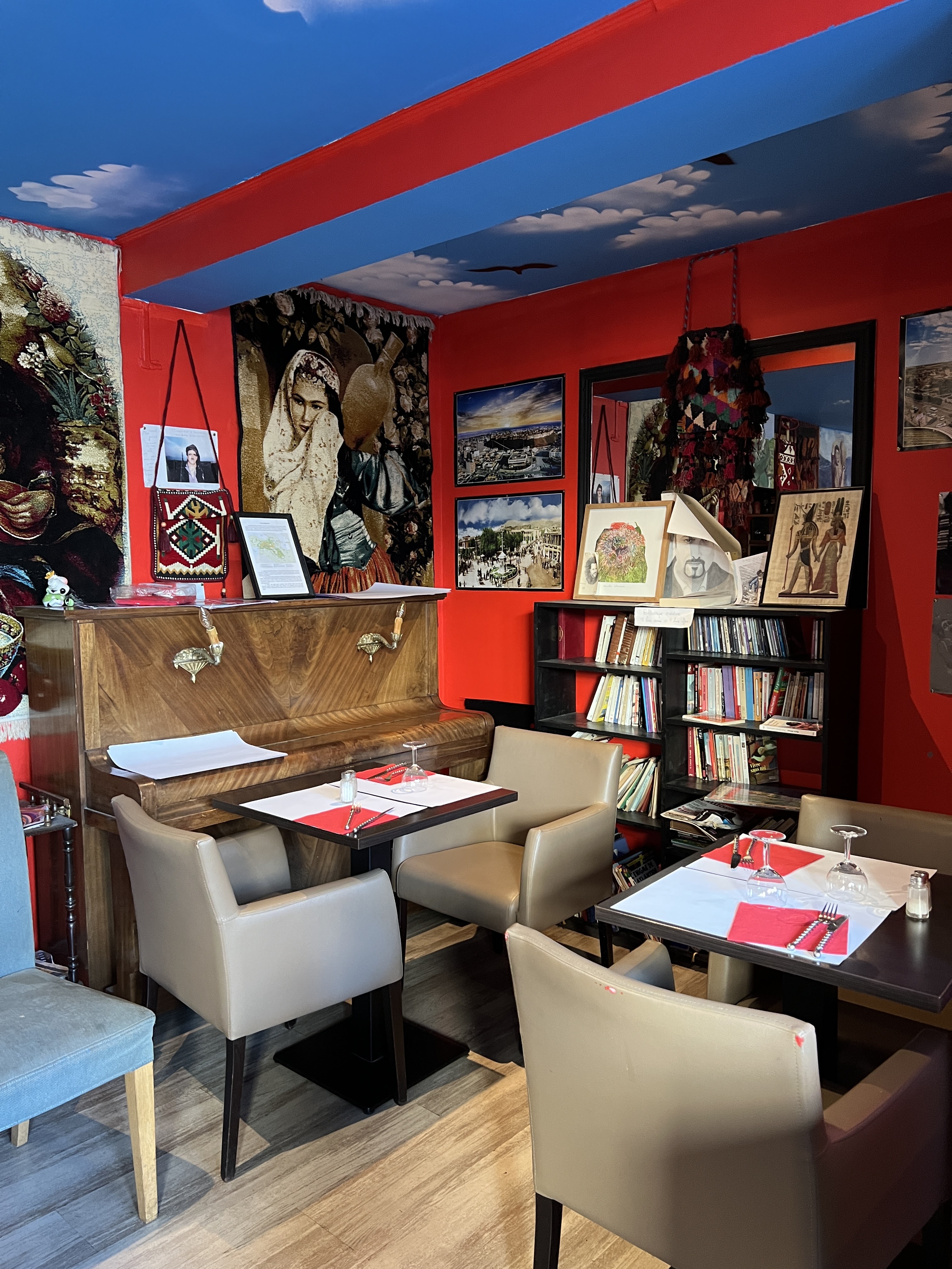 testé le menu du soir 25 euros entrée : salade moyennement fraiche ave sauces types houmous et autres sauces qu'on peut trouver au rayon frais des supermarché + 2 petites croquettes. franchement bof plat principale : 2 petites boulettes , sauce crème, salade pas trop fraiche identique a l entrée, bof. couverts oubliés. dessert : pâtisserie marocaine et une sorte de barbe a papa kurde (bon et original) déçu thé : ok conclusion : plats très moyens, service moyen, prix exagérés. j avais encore faim. dommage pour une première expérience de gastronomie kurde. ambiance : j etais sur le trottoir quasi en face des poubelles mais a l interieur il y avait un muscien.