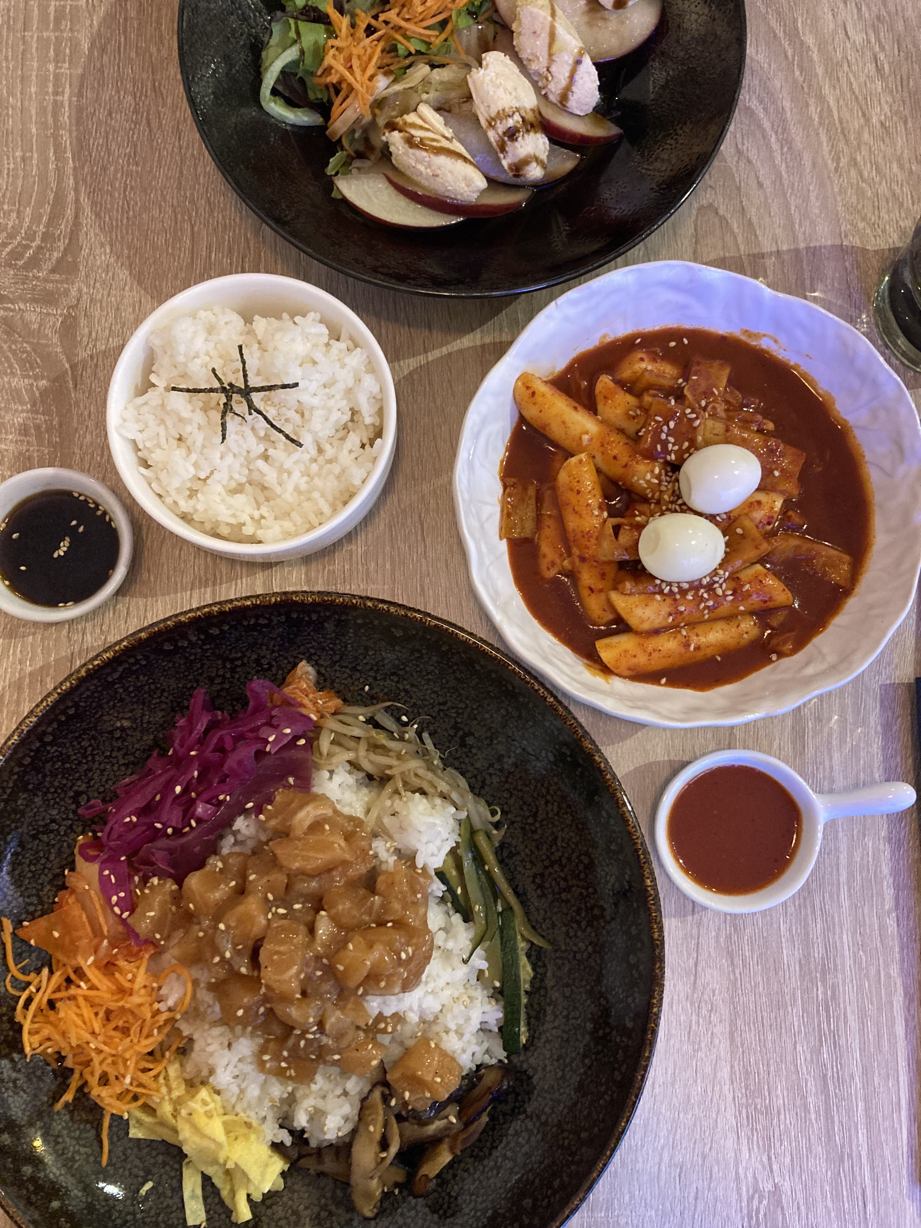 Alerte spoiler : le meilleur poulet frit de tous les temps : caramélisé en plus un délice 😍 par contre c'est assez épicé donc il faut tenir jusqu'à la fin du plat ... Le bibimbap était aussi très bon au saumon : portion généreuse, tout est frais, relevé avec du gingembre