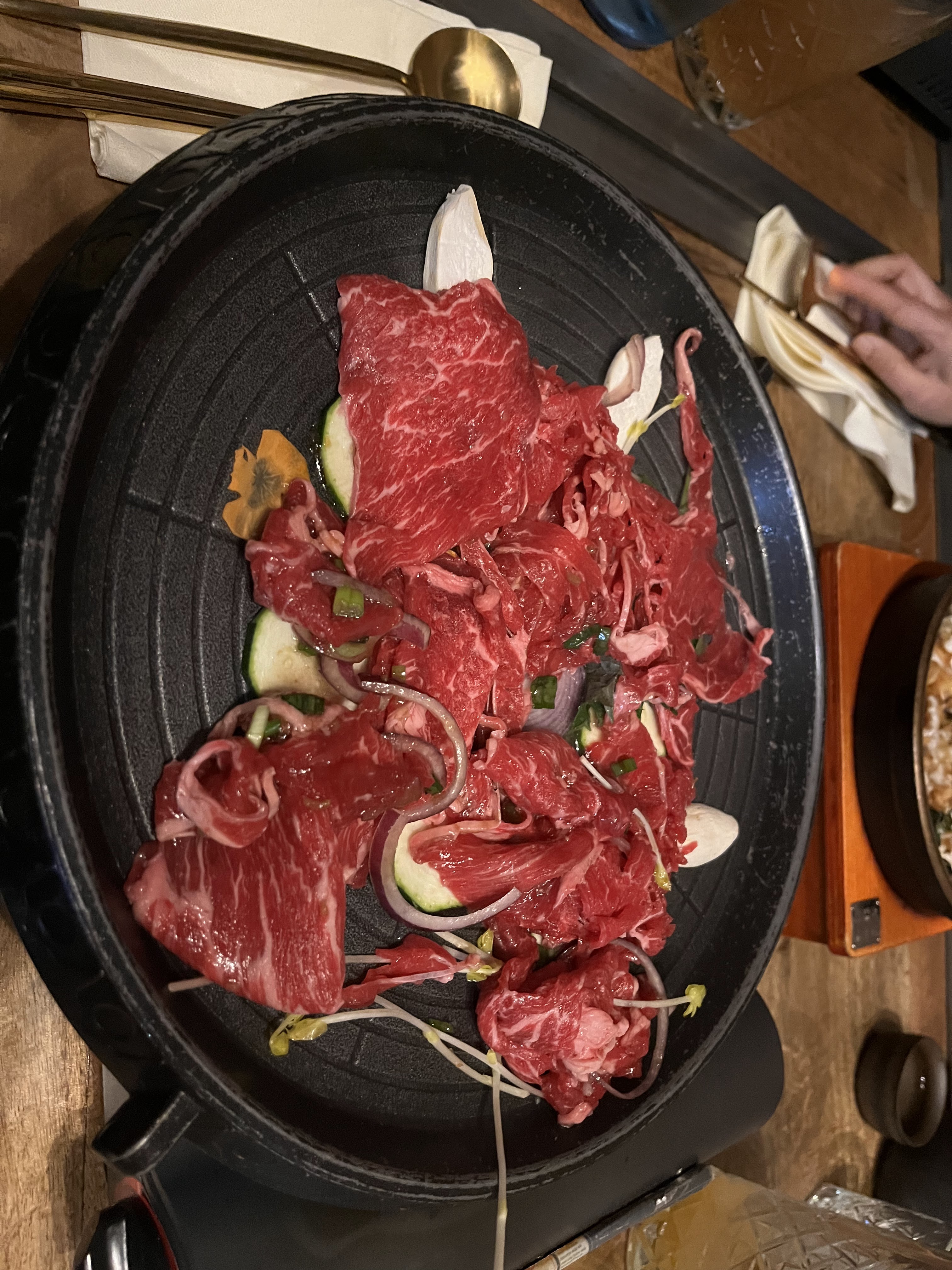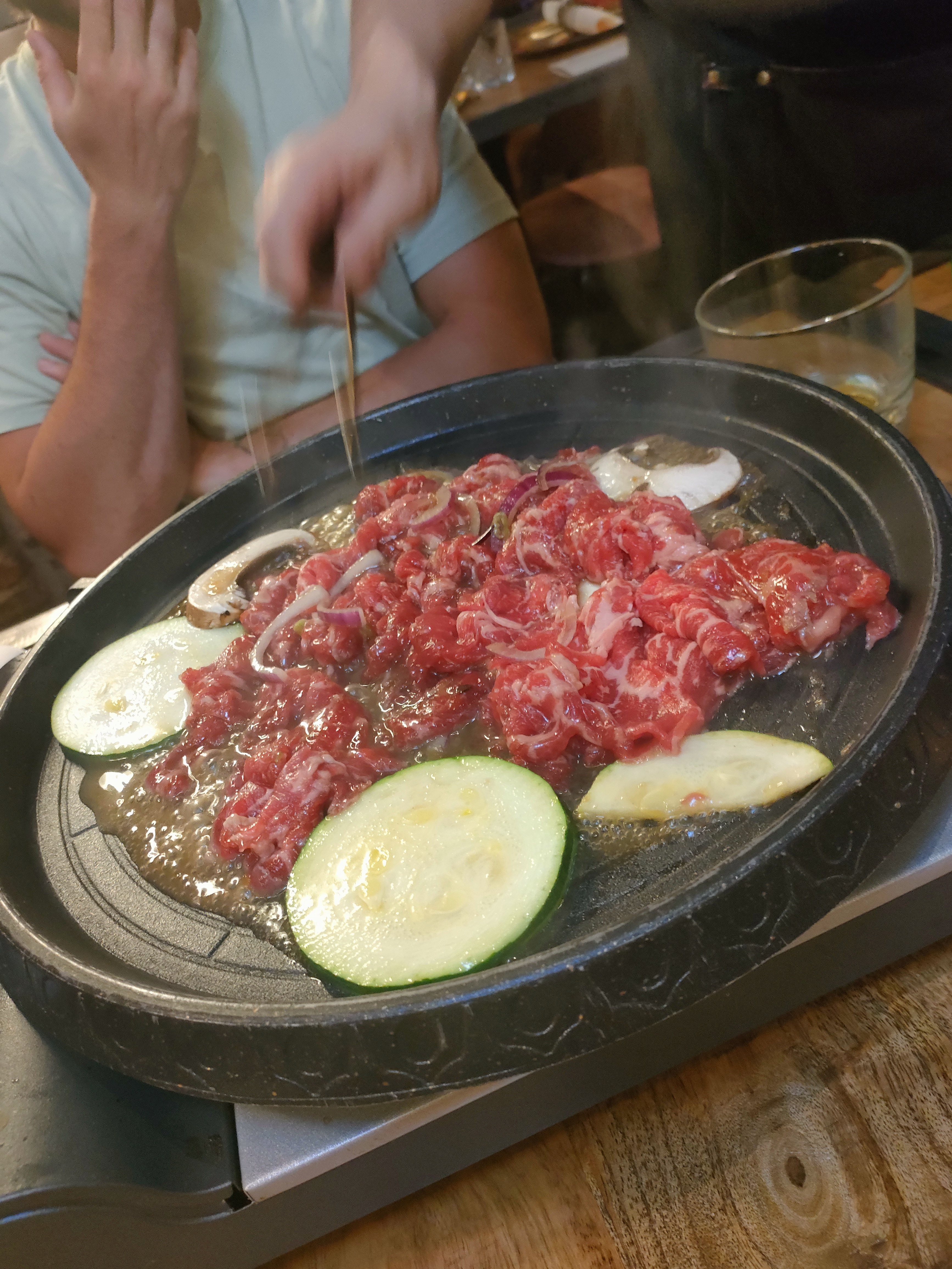J'ai eu une expérience mitigée dans ce restaurant. La nourriture est bonne. Le service est globalement correct. Par contre je ne suis pas fan de la nourriture qui cuit devant nous : projection d'huile sur ma chemise quand elle a frit et la serveuse qui nous retournait les morceaux de viande sur la plaque chauffante a fait tomber un morceau de légume plein d'huile sur mon pantalon... Sans s'excuser ni me proposer un verre d'eau pour atténuer la tâche. Quand nous sommes venus, la porte était bloquée parce qu'elle ne fermait pas correctement. Ça fait bizarre de ne pas pouvoir entrer. Et quand nous sommes ressortis il faisait frais dans le restaurant car la porte ne se fermait pas.