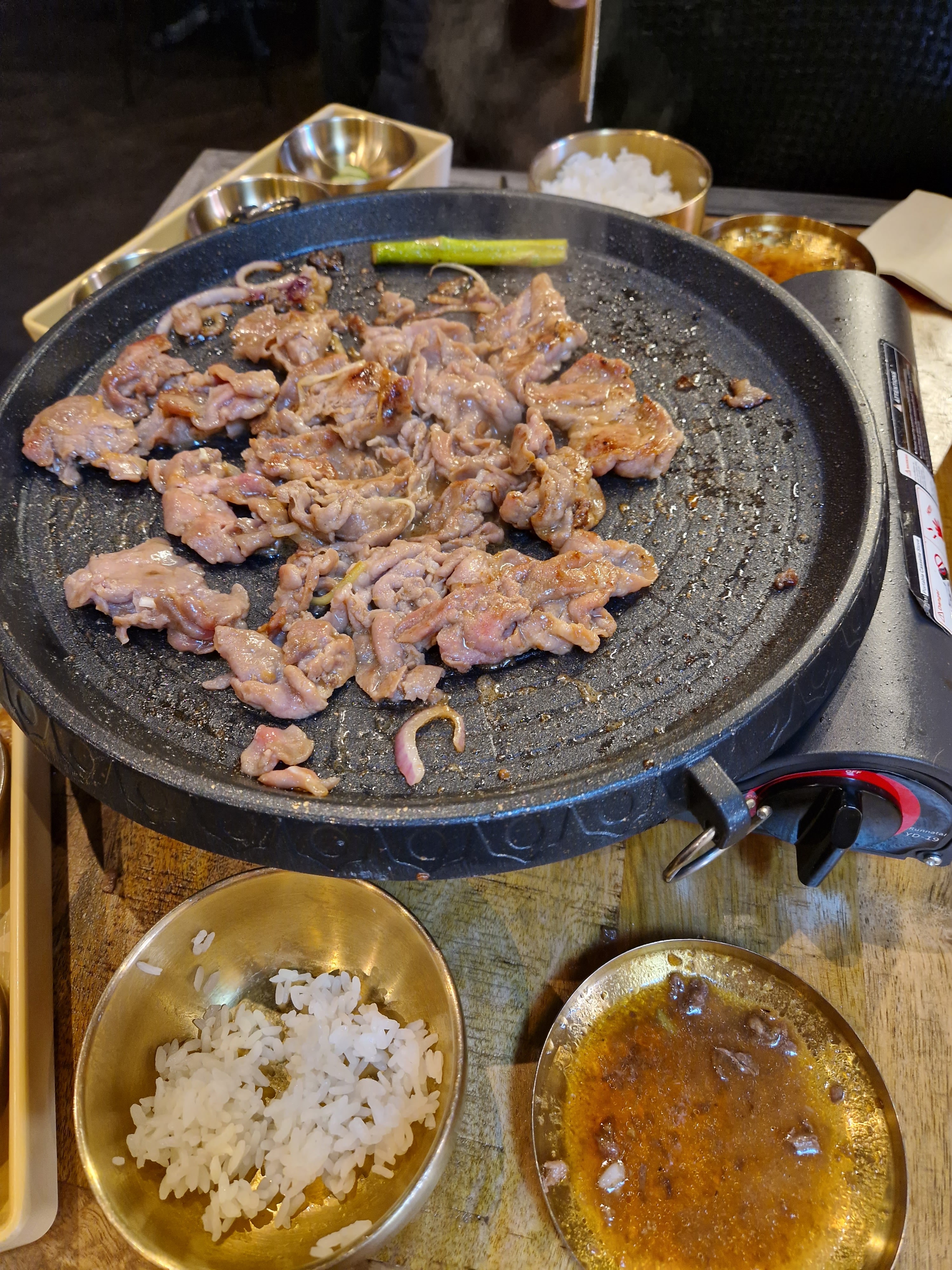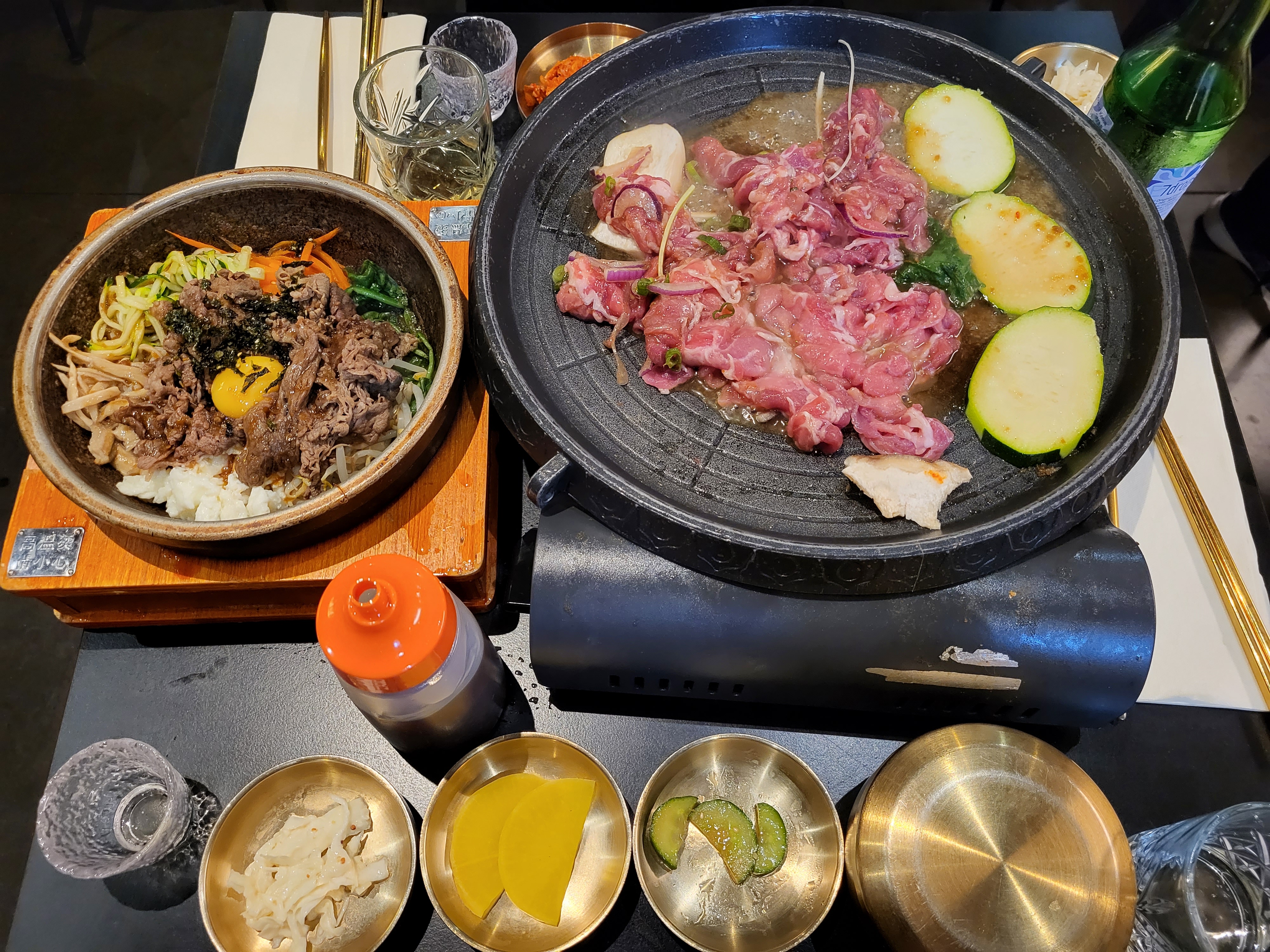 Dîner à 2, nous avons pris deux barbecues ( un bœuf et un porc). C'était très bon, la dame a été très aimable et nous a guidé. Seuls les accompagnements sont un peu légers ( pas de kimchi et une coupelle contenant 3 petits cubes de courgette).