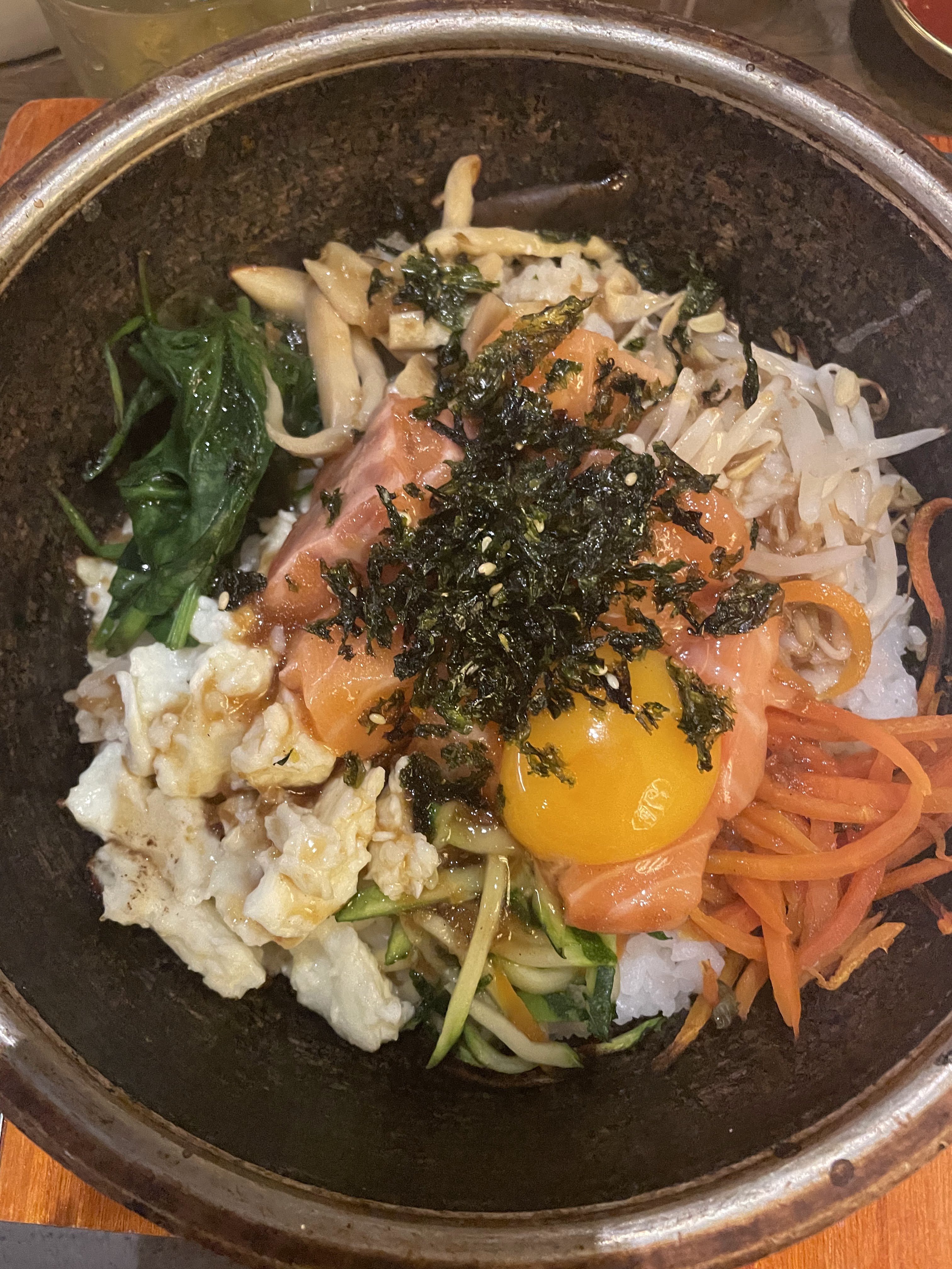 Lieu agréable, belle déco ambiance sympa. Pas beaucoup de choix pour Végétarien. J'ai pris le bibimbap au poulet c'était sans plus, je préfère ceux du restaurant BIBIMBAP.