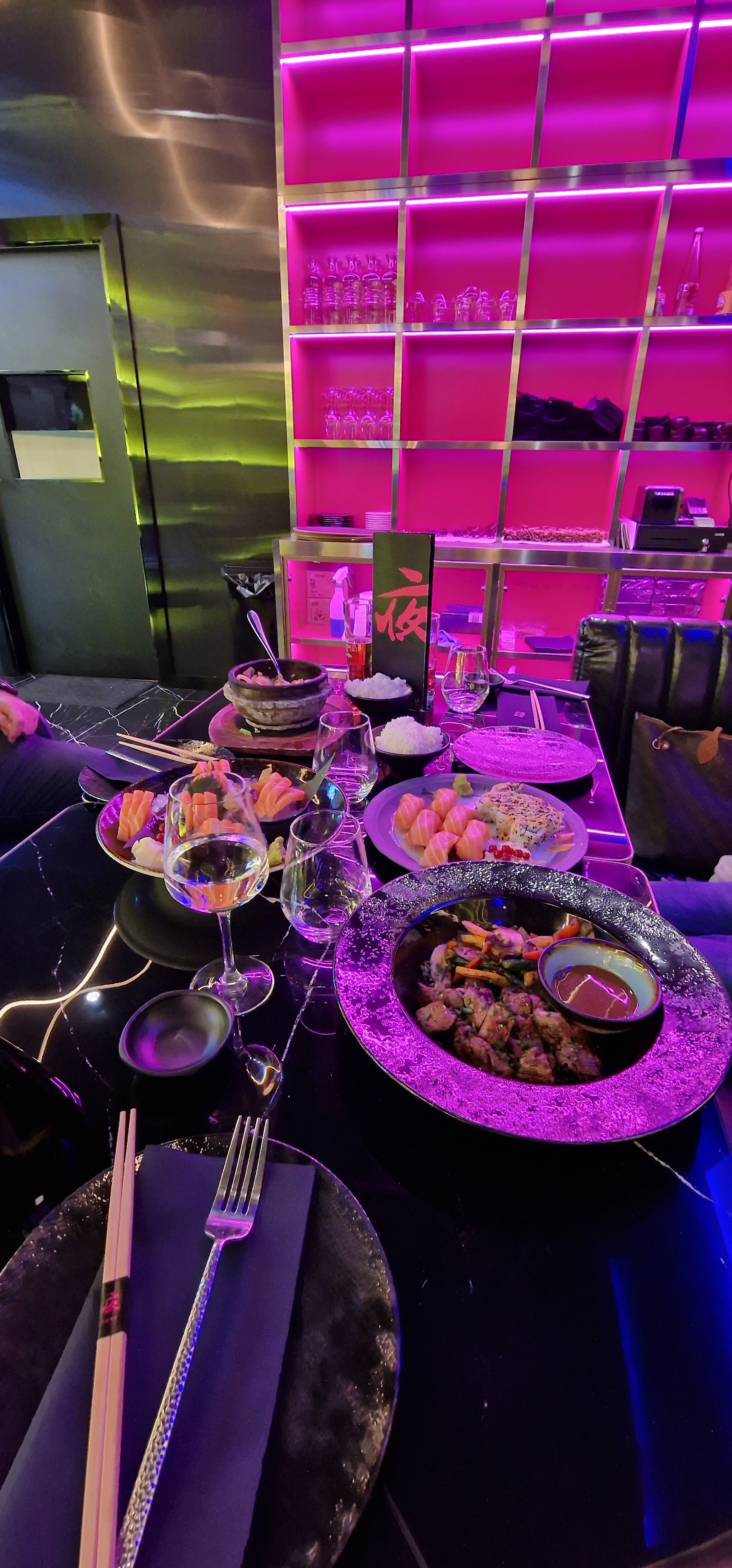 Réservation à 23h00, attente à l’accueil (avec prise en charge des clients en attente à améliorer). Le temps d’être installés et de faire notre choix, le temps file (menu à éclaircir notamment pour les sushis),. Une partie de notre nourriture nous est servi avant nos cocktails. La nourriture est plutôt bonne. Nous souhaitons commander un complément. Après avoir pris notre seconde commande, on nous apprend que la cuisine ne sert plus de salé car il est 00h00 passé. On ne nous a pas prévenu au préalable. Hyper déçus. Au passage, le décor est original et sympa. Dommage que nous ayons été installés à 1 mètre d’une poubelle et des produits d’entretien bien mis en valeur dans un meuble rose à néon. Pour le romantisme, on repassera. Expérience mitigée. Des réglages sur la qualité du service dès l’accueil ainsi que sur les finitions de présentation du restaurant sont à effectuer. Pour finir, pas de geste commercial.