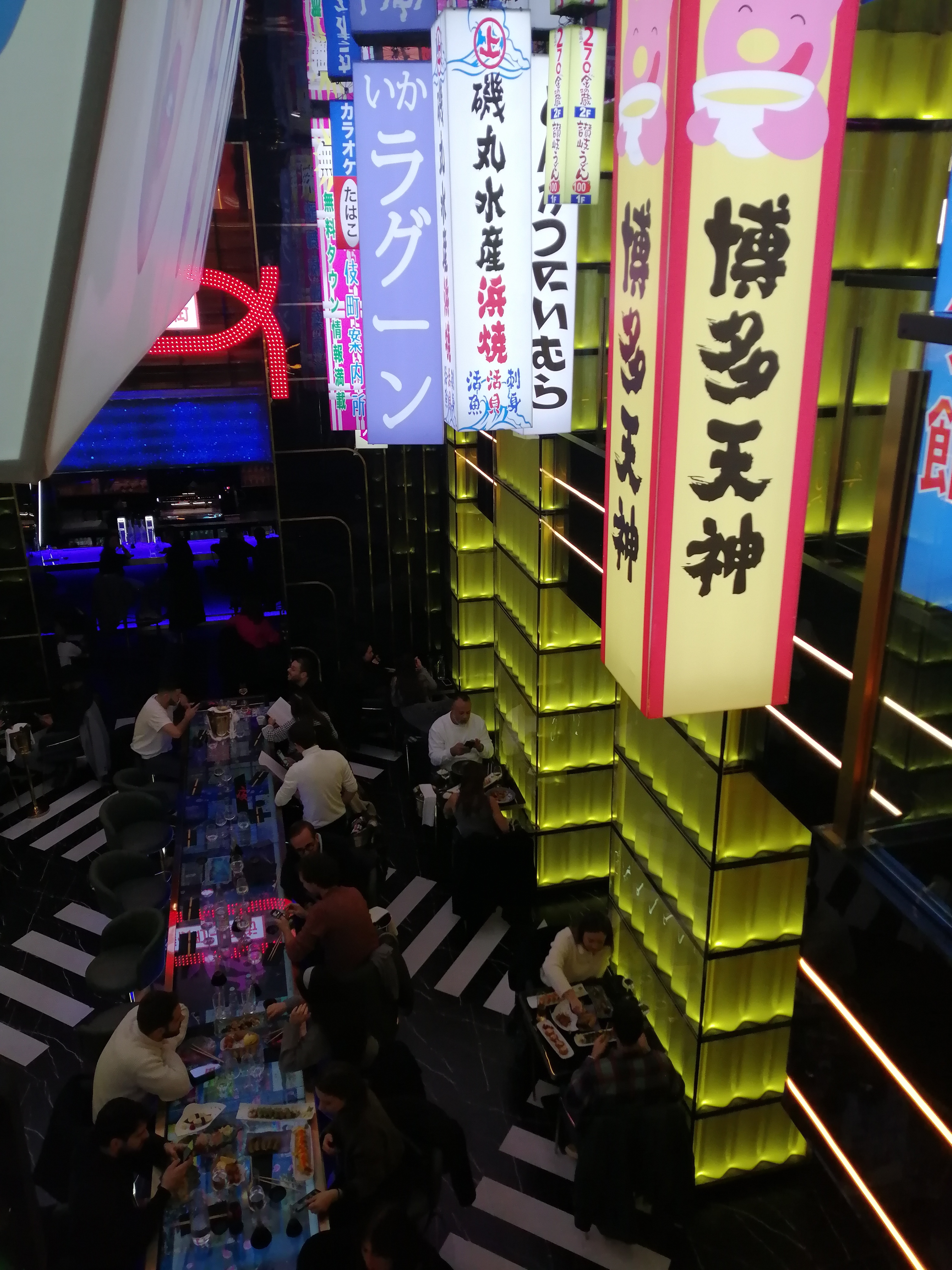 Une grosse déception... Une fois le côté spectaculaire de la salle passé L'ambiance japonaise ? Avec du Rihana à fond, je retrouve pas le Japon Le service à été vraiment déplorable, il a fallu demander plusieurs fois à plusieurs serveurs pour avoir de l'eau (40min d'attente), j'ai pas osé demandé un sourire j'avais trop peur d'attendre encore 20min La nourriture été tout juste chaude ce qui est quand même triste quand on prend des takoyakis et du kaarage La nourriture n'est pas mauvaise mais c'est hors de prix pour ce que c'est Je vous conseille d'aller juste boire un verre au bar pour voir la salle puis d'aller manger juste à côté vous y trouverez de la vraie cuisine japonaise au moins