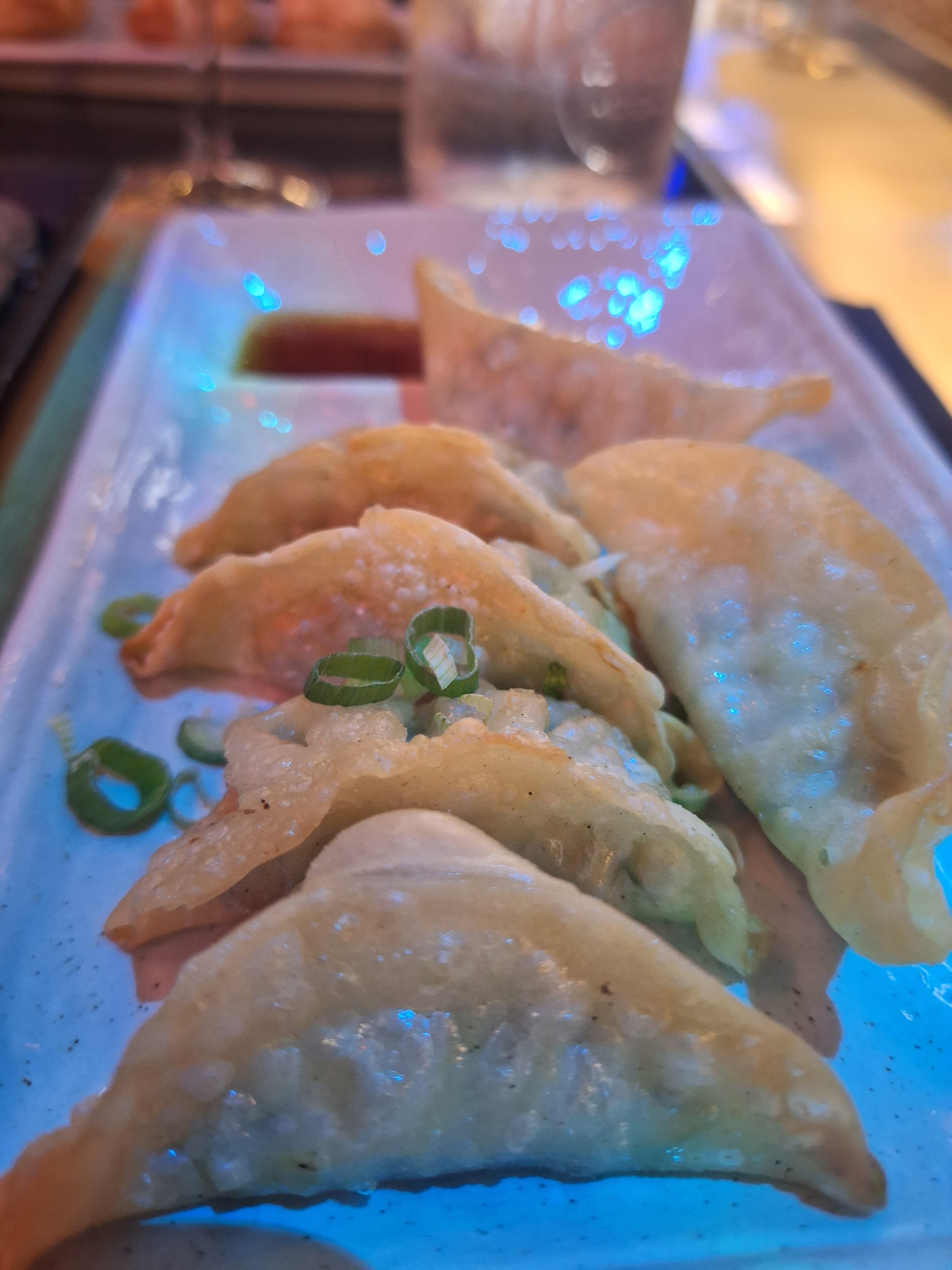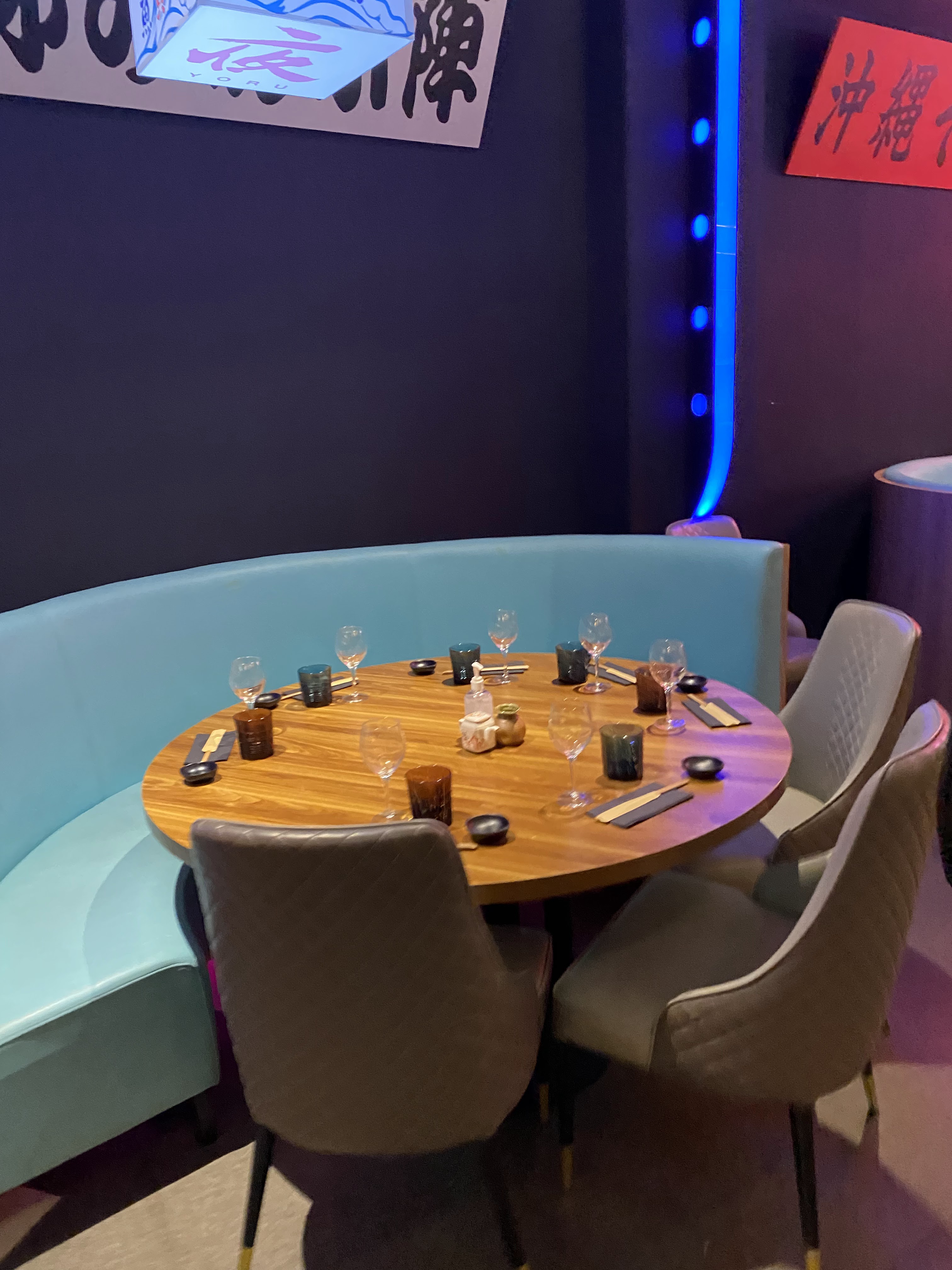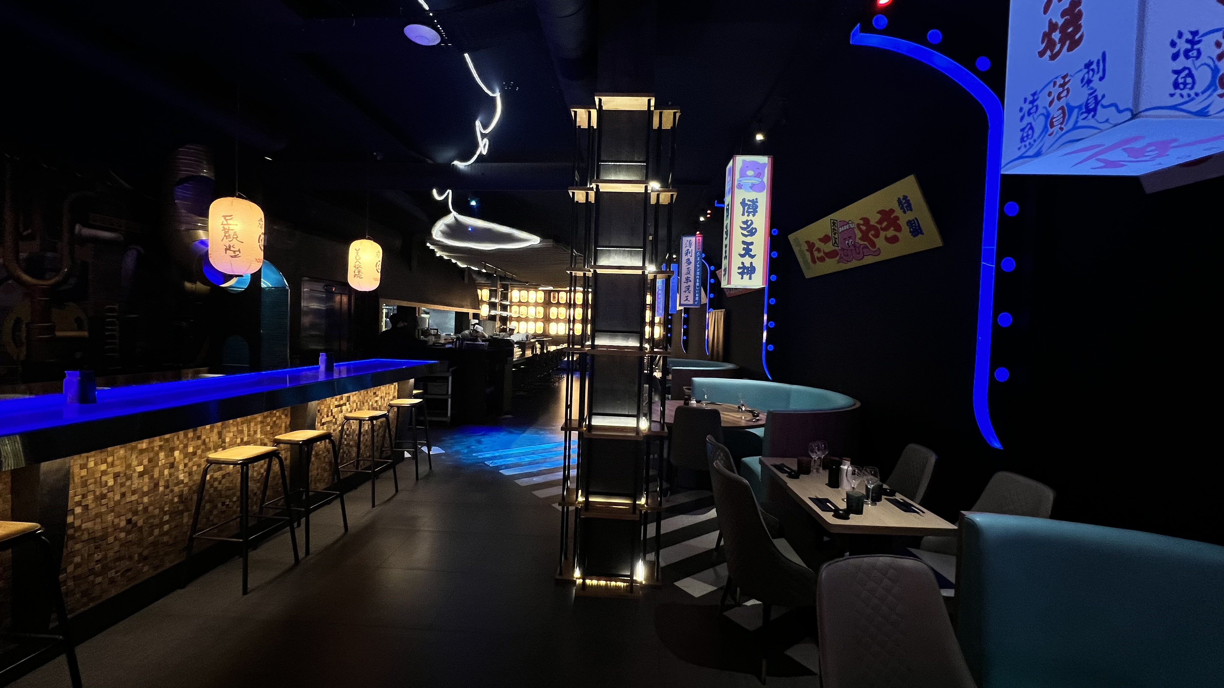 Une table à deux, près de la fenêtre. Pour une meilleure expérience, je recommande les tables hautes avec les néons. Le décors, rien à dire : c'était somptueux, on se croirait vraiment au Japon, avec les néons ça donne une vraie ambiance Tokyo by night. La vaisselle était abîmée. Mais les plats étaient chères pour la qualité gustative. Les takoyaki sont quand même excellents, mais le reste c'était très basique. La qualité des ingrédients n'est pas à la hauteur du prix qu'on paye. Et c'est ce qui compte le plus pour un restaurant !