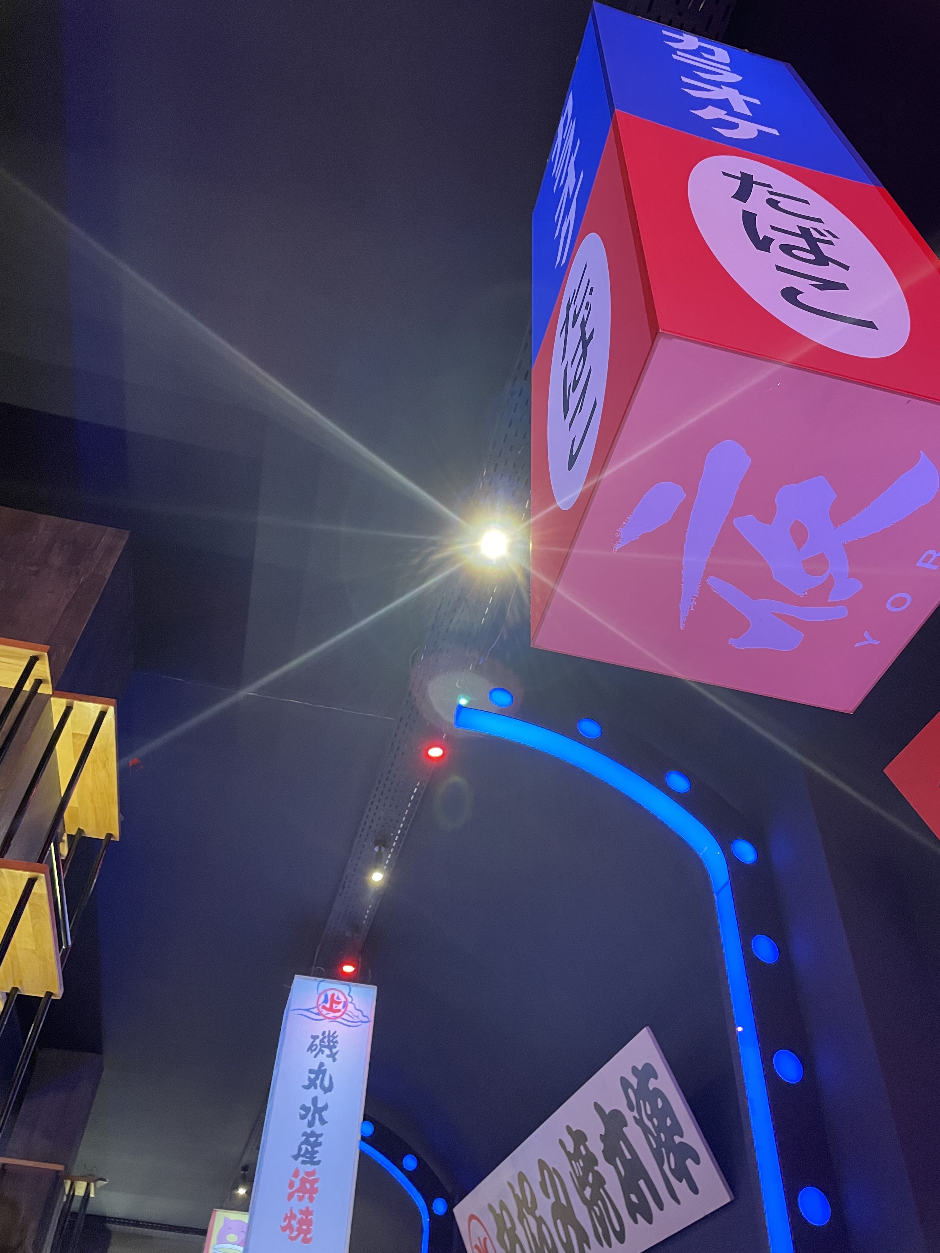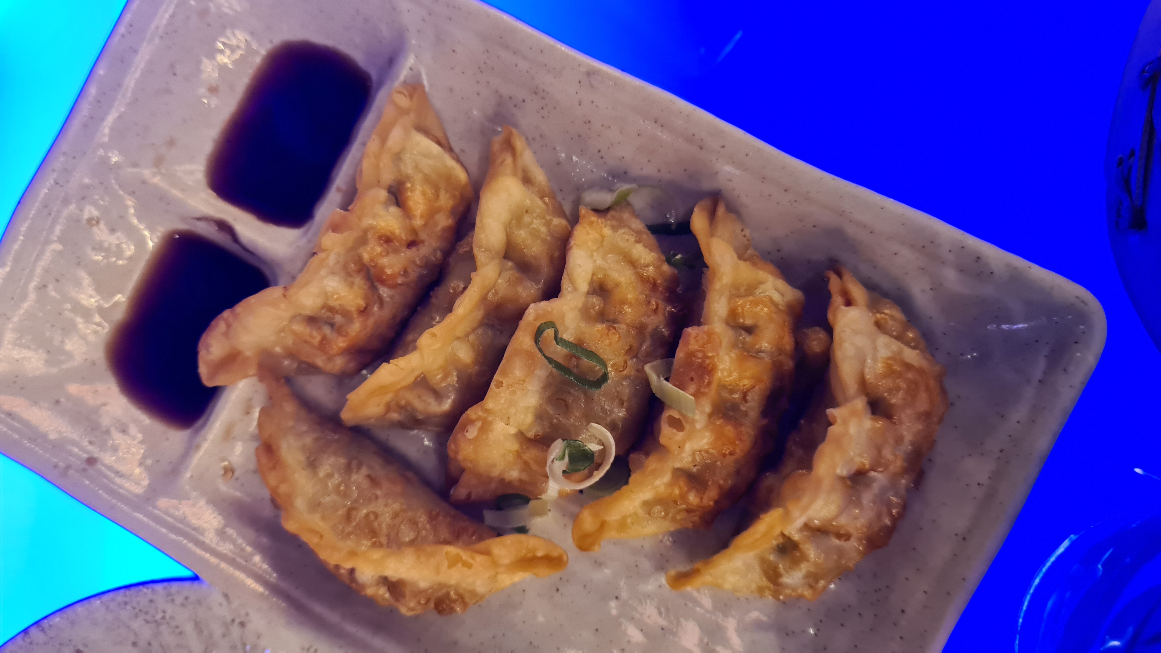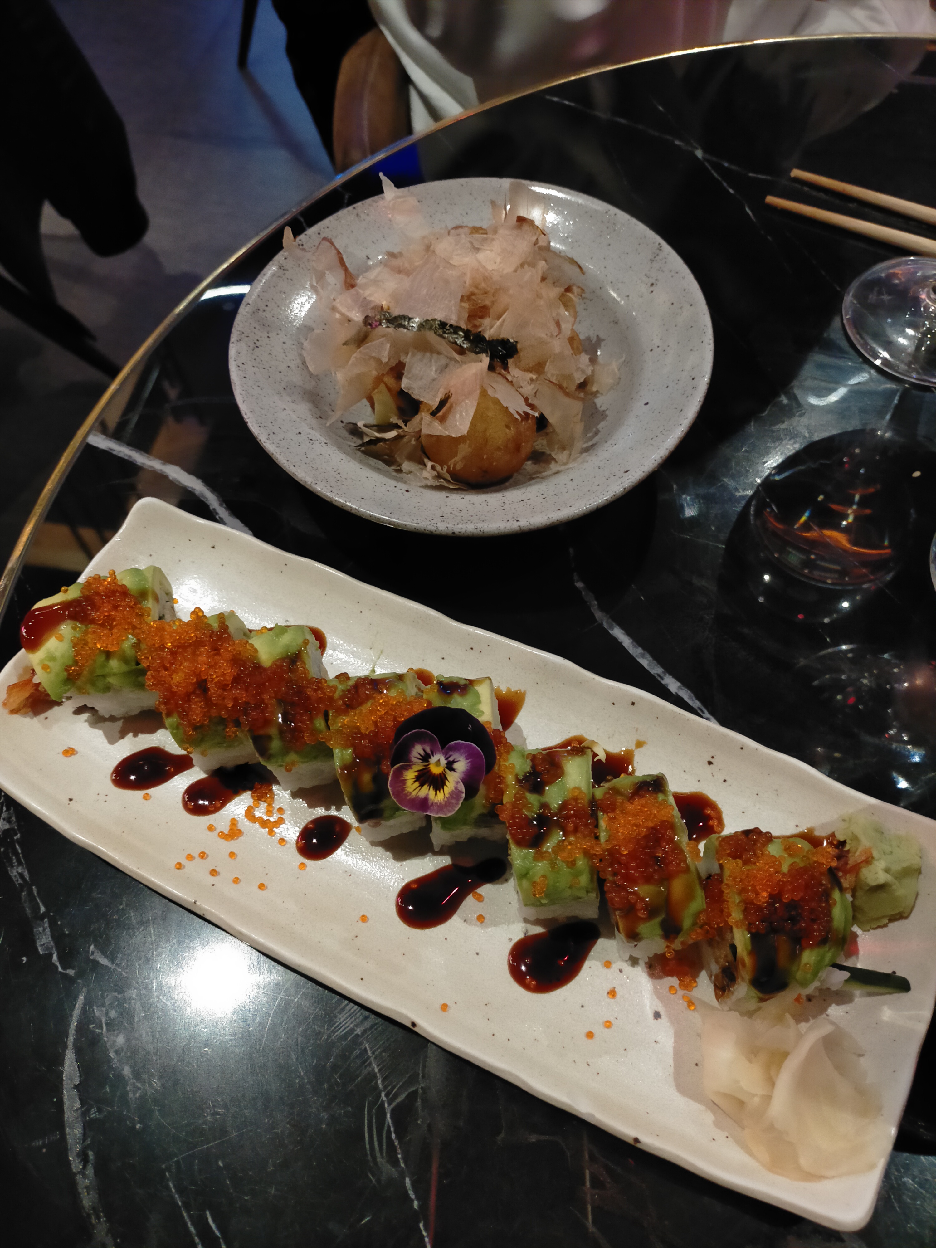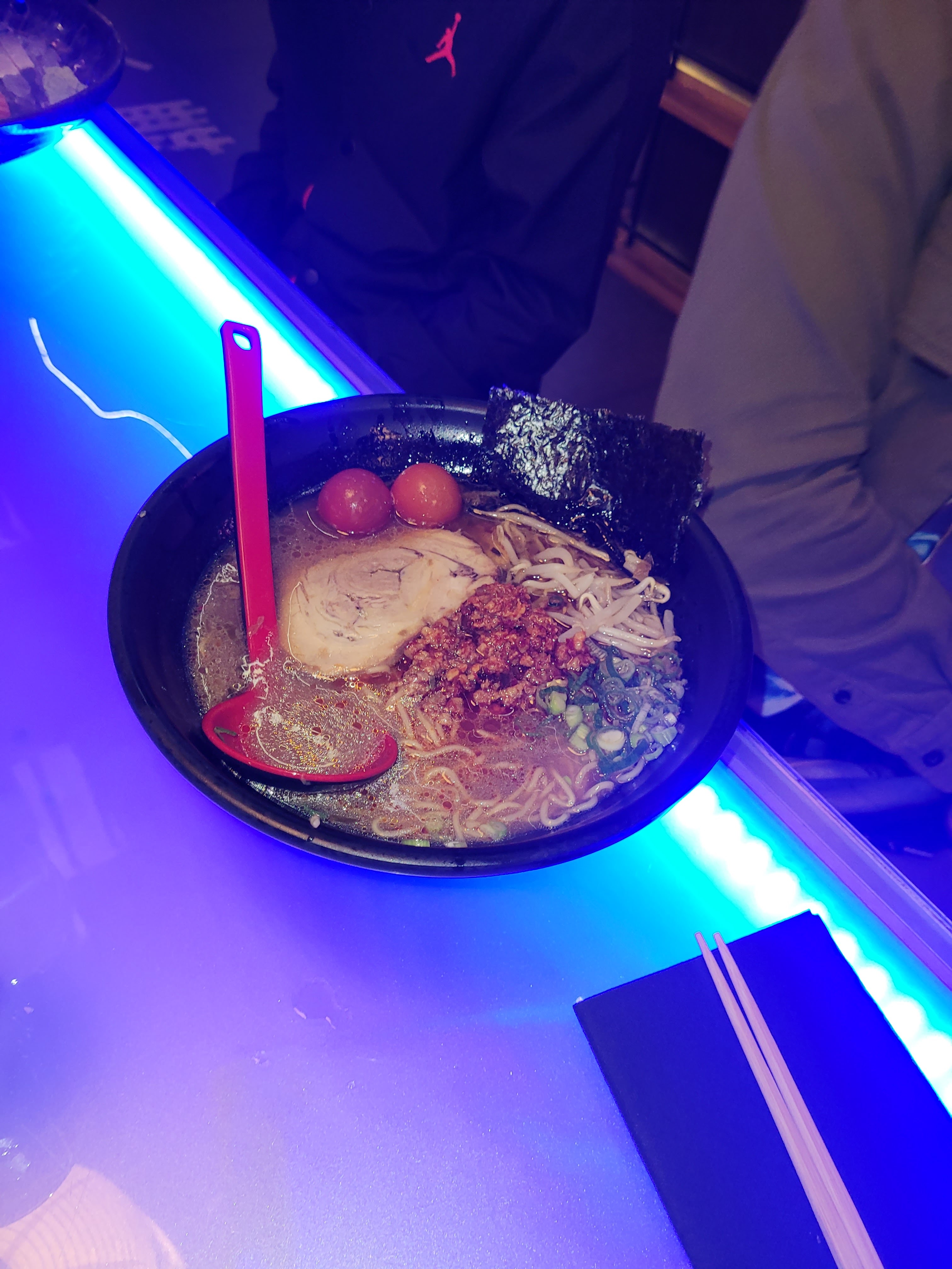 Une table à deux, près de la fenêtre. Pour une meilleure expérience, je recommande les tables hautes avec les néons. Le décors, rien à dire : c'était somptueux, on se croirait vraiment au Japon, avec les néons ça donne une vraie ambiance Tokyo by night. La vaisselle était abîmée. Mais les plats étaient chères pour la qualité gustative. Les takoyaki sont quand même excellents, mais le reste c'était très basique. La qualité des ingrédients n'est pas à la hauteur du prix qu'on paye. Et c'est ce qui compte le plus pour un restaurant !