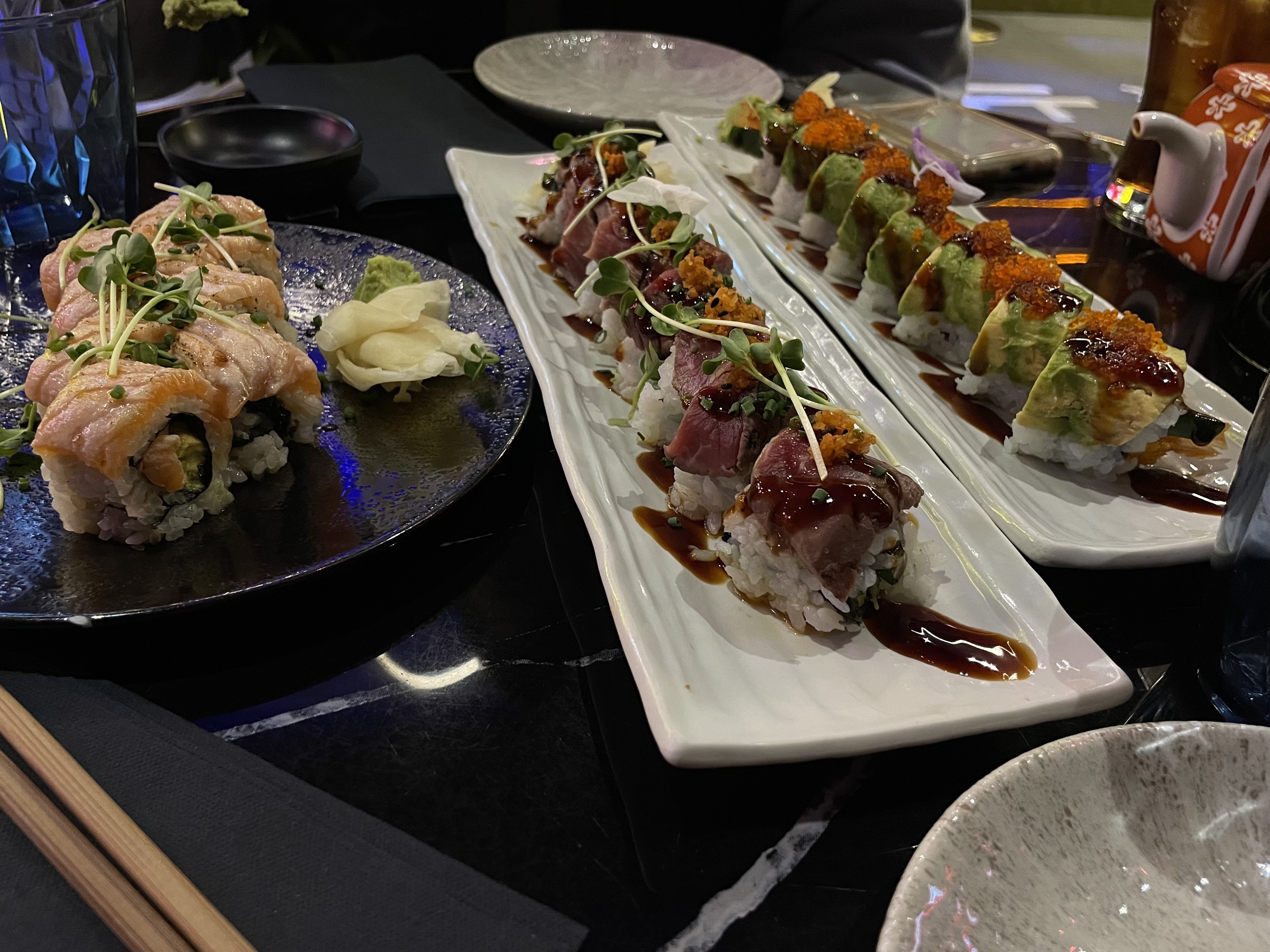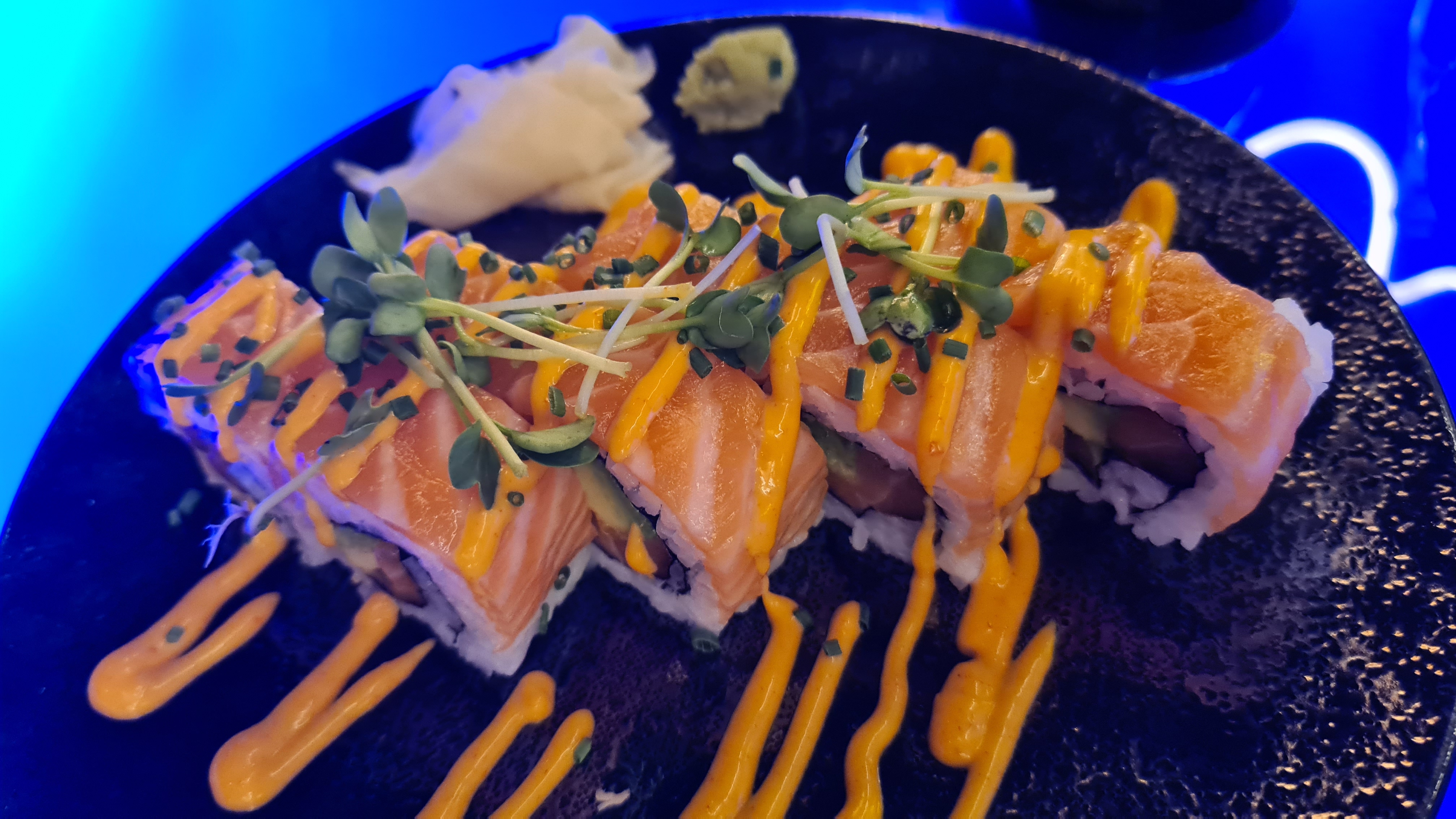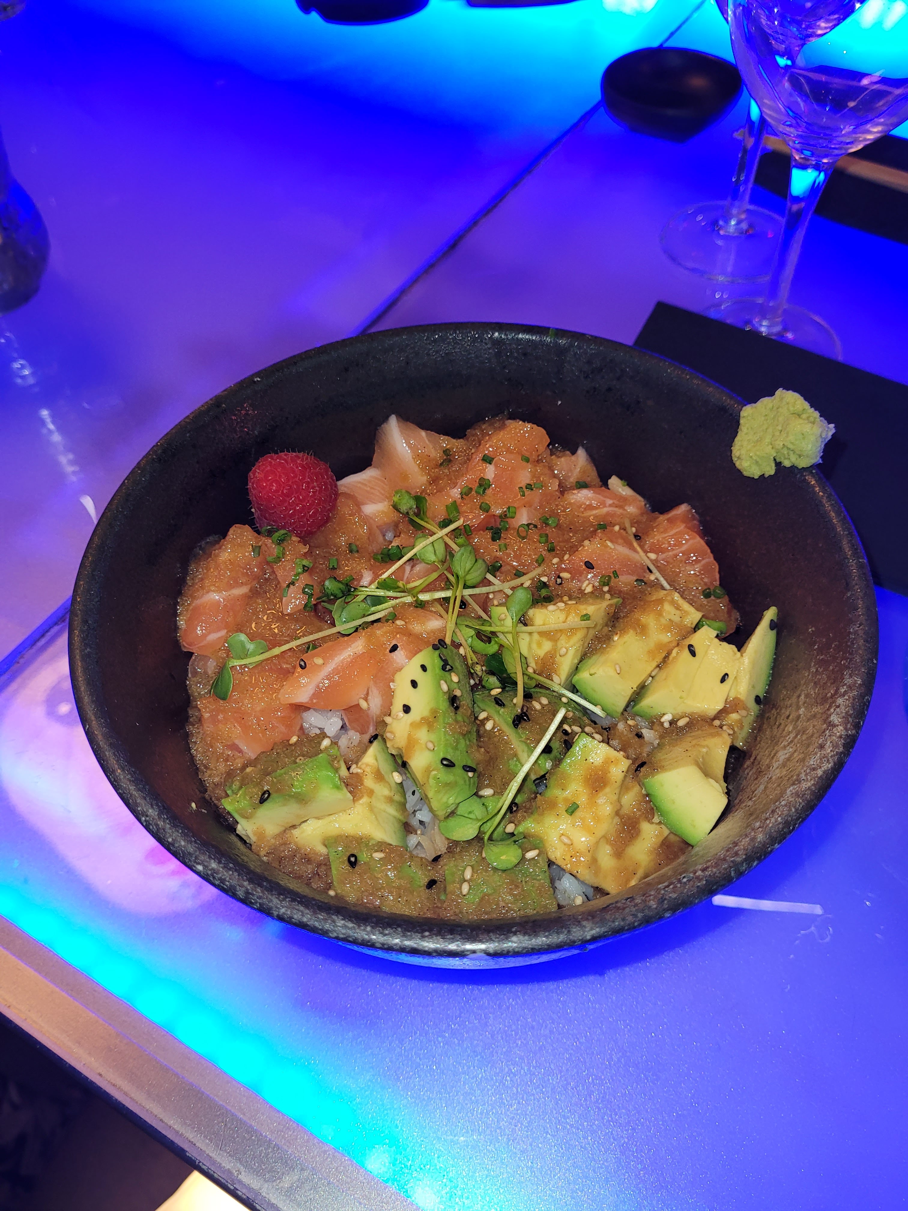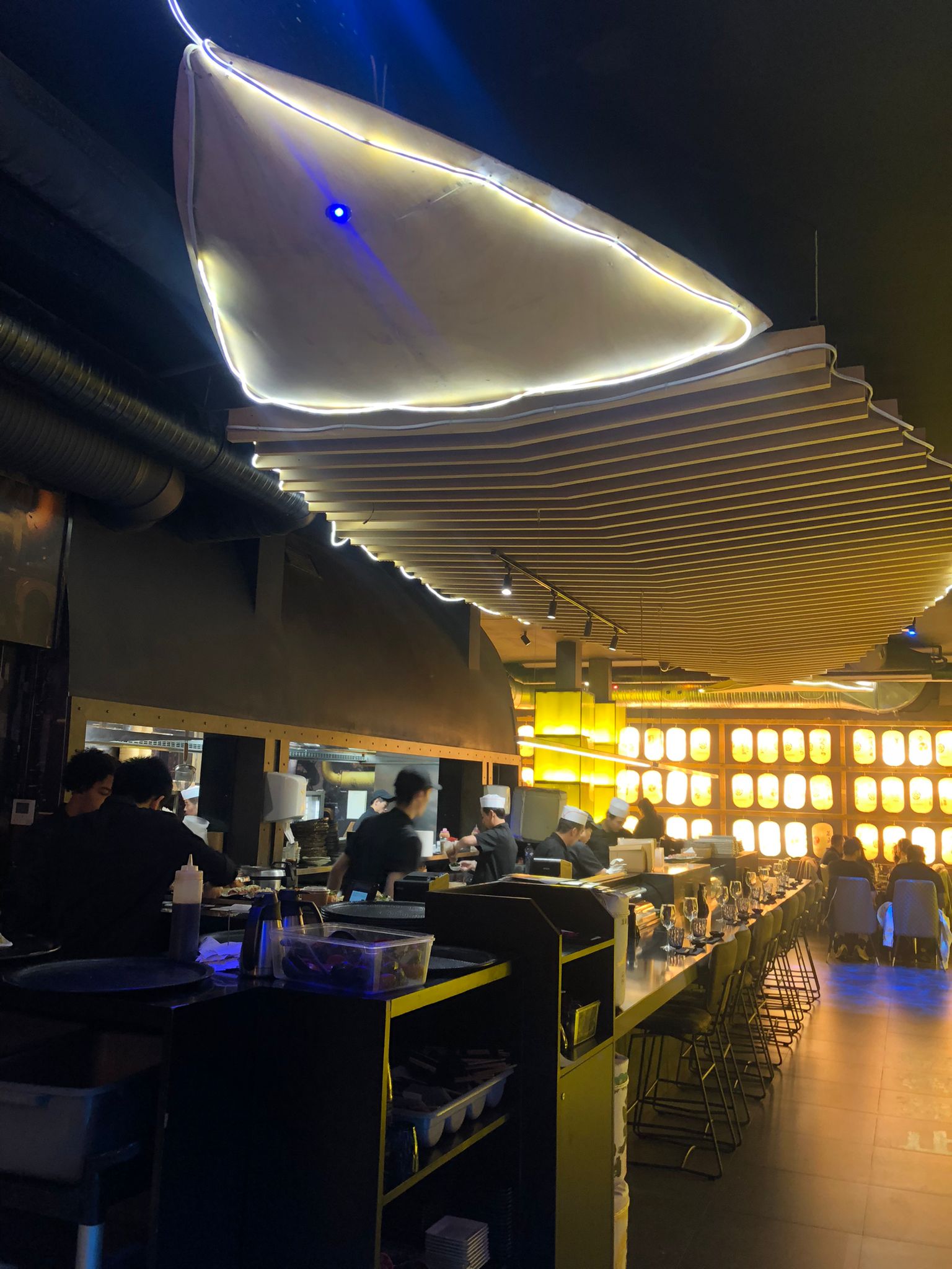 Nous avions réservé une table pour 10 afin de célébrer un anniversaire. Le cadre est très beau, les néons, l’ambiance, la musique un peu forte mais vous êtes emporté dedans donc ça passe. Seul bémols, le service. Certes nous avons mis un peu de temps à commander, j’en ai conscience et je m’en excuse. Mais quand 4 fois vous demandez de l’eau sans être pour autant servie, que les serveurs soufflent quand on leur commande quelque chose en plus ou qu’on les interpelles, qu’on nous presse pour manger afin de pouvoir accueillir une autre table, je suis désolé mais ça fait un peu beaucoup. J’ai bien prévenu que c’était pour un anniversaire et demande de faire le nécessaire, j’ai eu 0 bougies ou quoi que ce soit. Pour une table à un montant supérieur de 500 euros je trouve que ça fait beaucoup. Sinon la nourriture était très bonne, ce qui relève ma note à 2 étoiles. Le saumon fondait dans la bouche et les rolls étaient tout aussi original les uns que les autres. Je ne sais pas si je reviendrais, ou alors avec un plus petit comité.