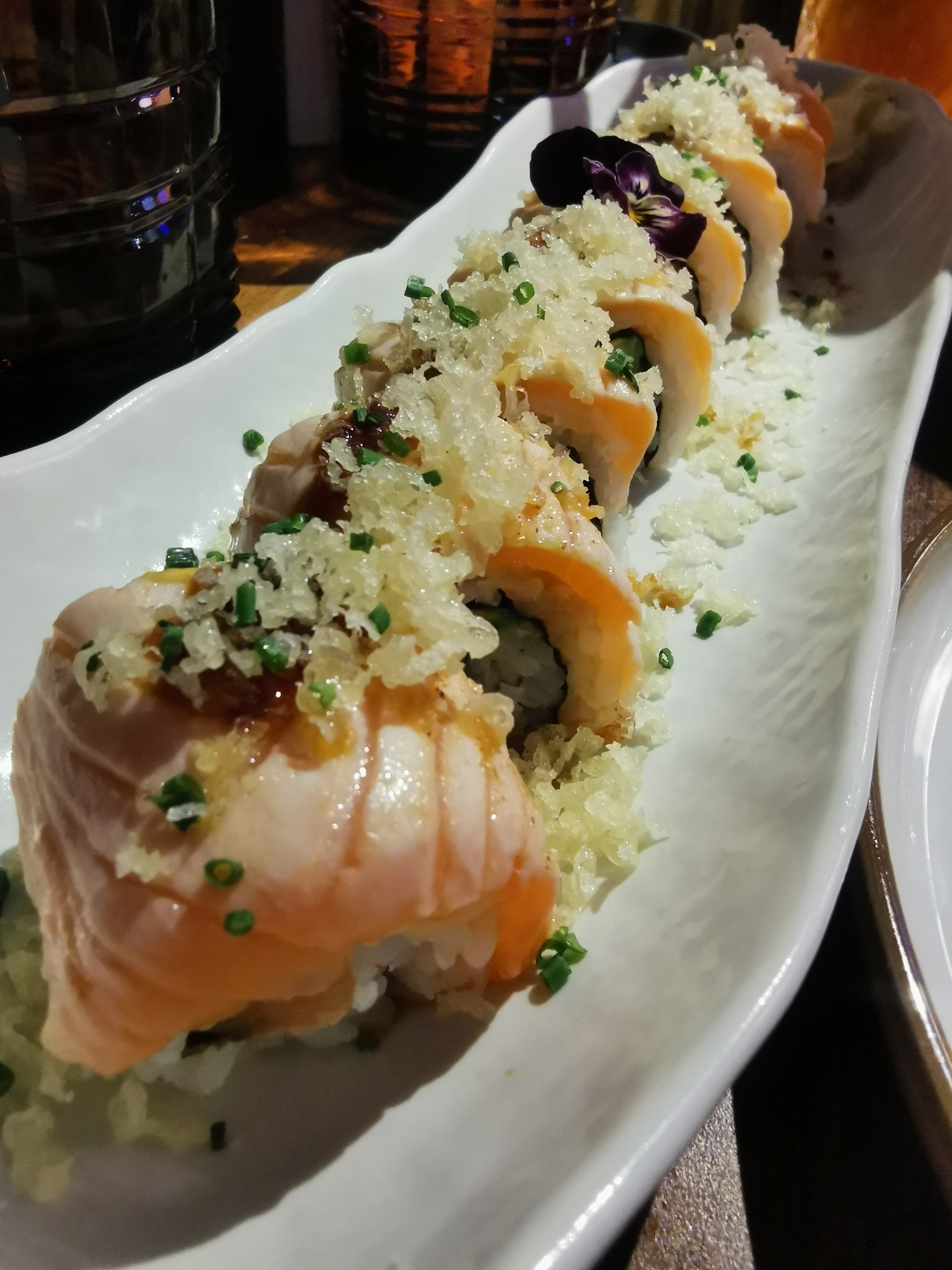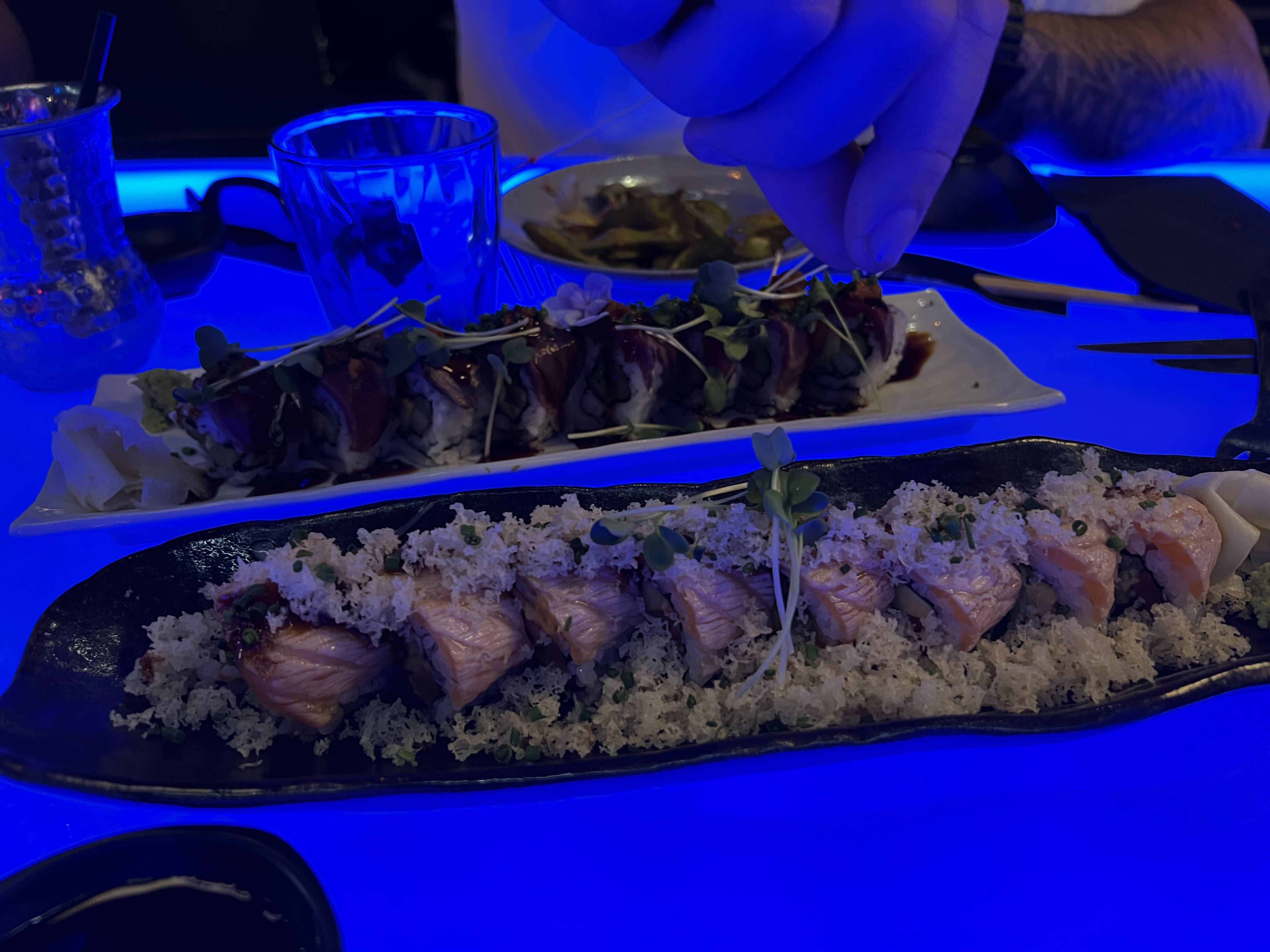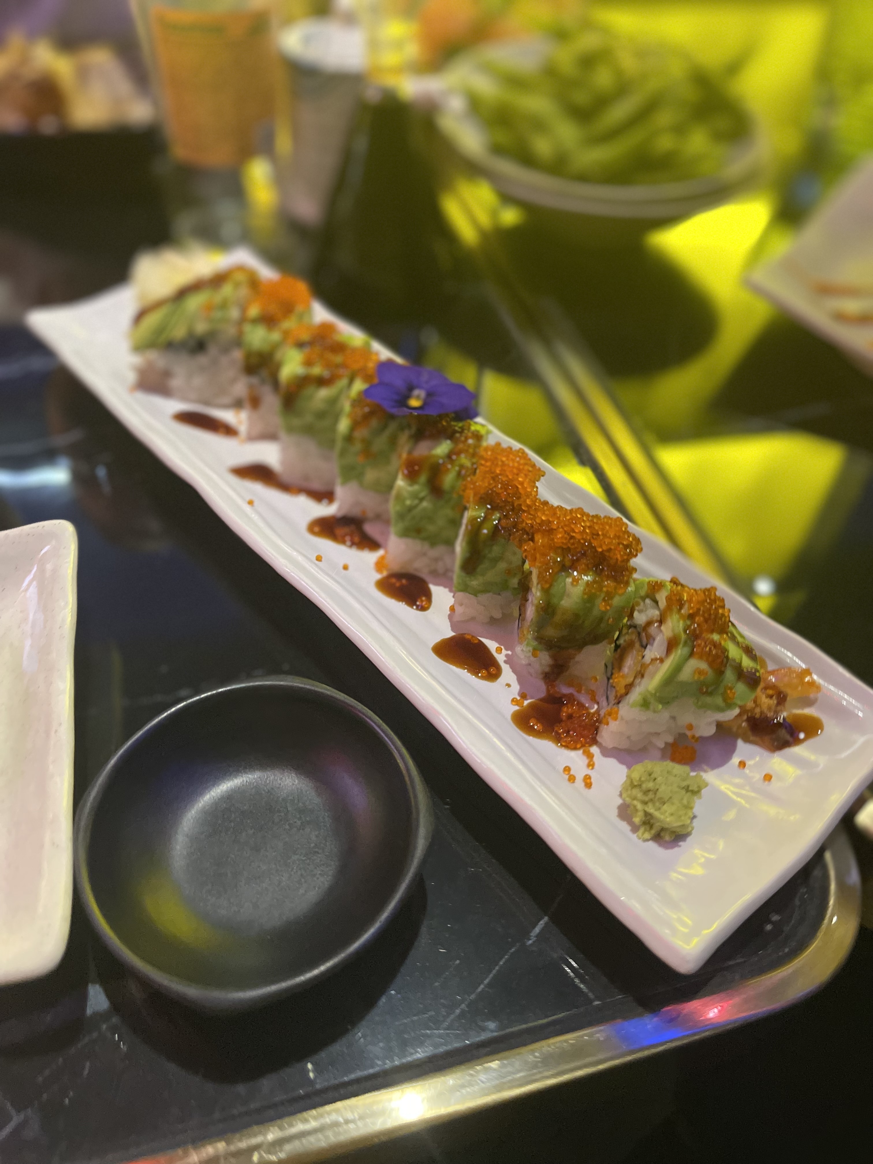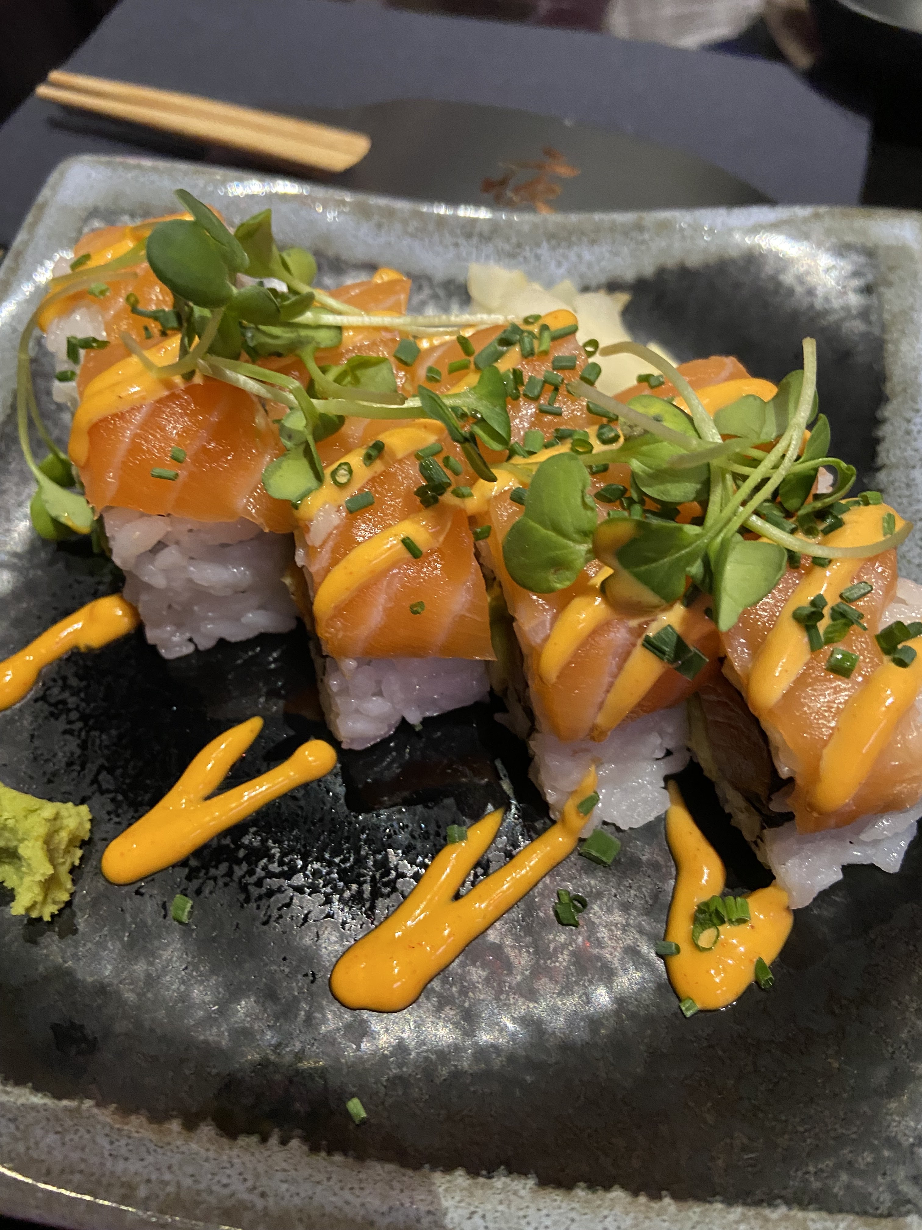 Nous avions réservé une table pour 10 afin de célébrer un anniversaire. Le cadre est très beau, les néons, l’ambiance, la musique un peu forte mais vous êtes emporté dedans donc ça passe. Seul bémols, le service. Certes nous avons mis un peu de temps à commander, j’en ai conscience et je m’en excuse. Mais quand 4 fois vous demandez de l’eau sans être pour autant servie, que les serveurs soufflent quand on leur commande quelque chose en plus ou qu’on les interpelles, qu’on nous presse pour manger afin de pouvoir accueillir une autre table, je suis désolé mais ça fait un peu beaucoup. J’ai bien prévenu que c’était pour un anniversaire et demande de faire le nécessaire, j’ai eu 0 bougies ou quoi que ce soit. Pour une table à un montant supérieur de 500 euros je trouve que ça fait beaucoup. Sinon la nourriture était très bonne, ce qui relève ma note à 2 étoiles. Le saumon fondait dans la bouche et les rolls étaient tout aussi original les uns que les autres. Je ne sais pas si je reviendrais, ou alors avec un plus petit comité.