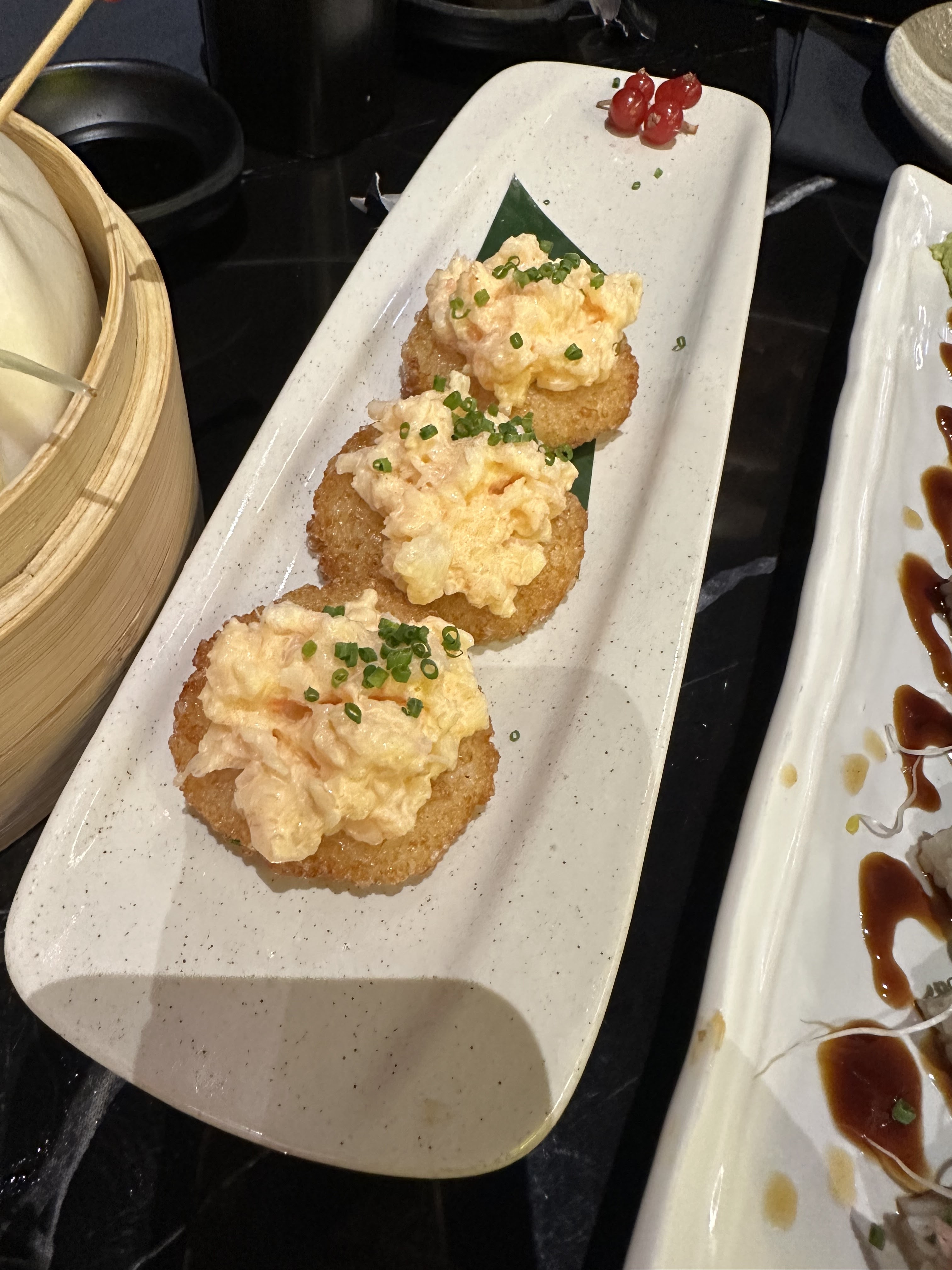 Un lieu au gout du jour, très animé, un service agréable, de jolie et bon plat, nous avons passé un très bon moment. Coup de cœur, pour le bao poulet et le riz croustillant avec crevettes épicées Bémol sur tataki de saumon à la truffe et yuzu, je pense qu'il ne se mari pas correctement, il y avait plus un goût orange que de citron. Et Malgré une réservation, nous avons dû attendre 30min pour être installé. (Conseil d'un serveur, venir le midi ou en semaine évité le vendredi et le samedi, si vous n'aimez pas l'attente)