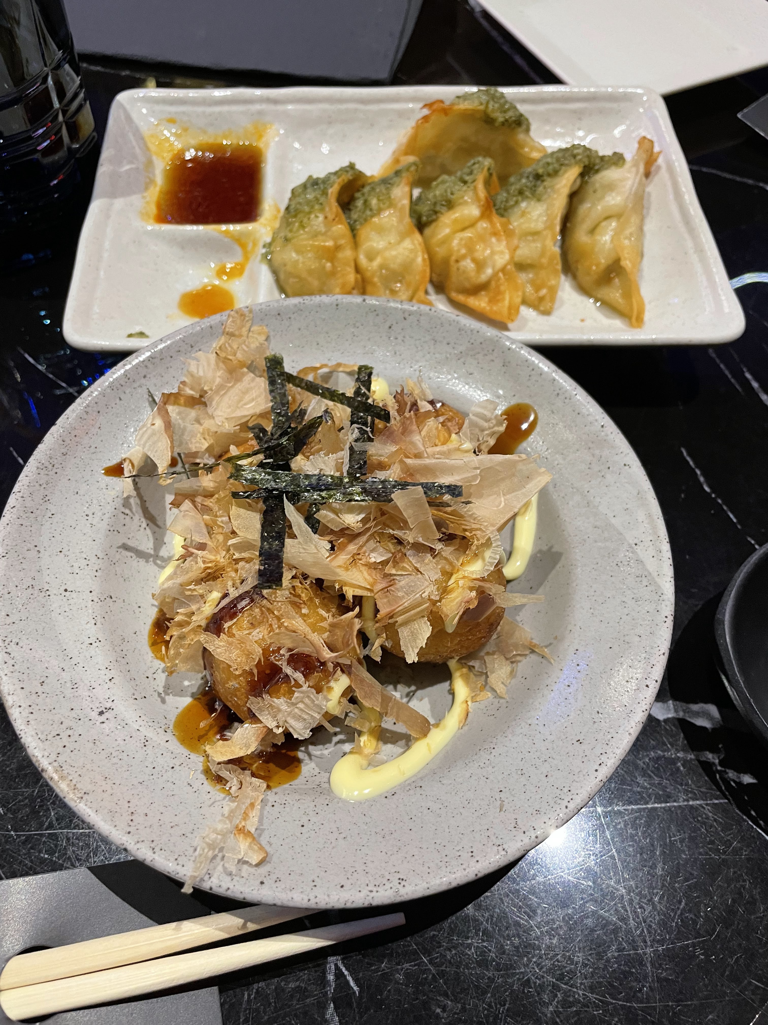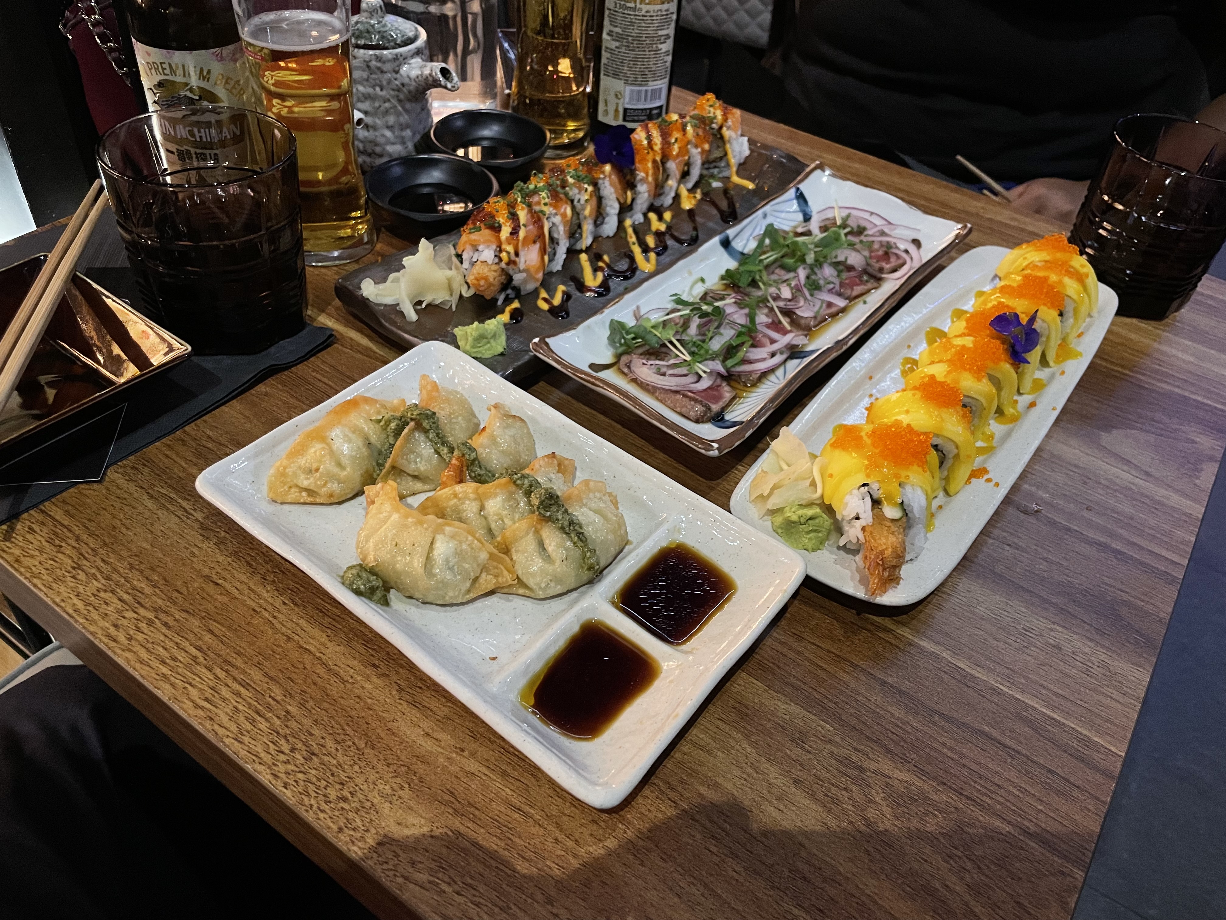 Les plats étaient délicieux! Un peu cher. En effet, nous avons pris 10 sushis pour 20€… (nous sommes resté sur notre faim après le repas et nous en avons eu pour 60€ sur la photo + des takoyakis délicieux) Je vais sûrement revenir à ce restaurant mais je ne pense pas reprendre les sushis, trop cher pour peu! Sinon le roll, le tatataki et les gyozas sont extrêmement bons! Le wasabi était du vrai en grain