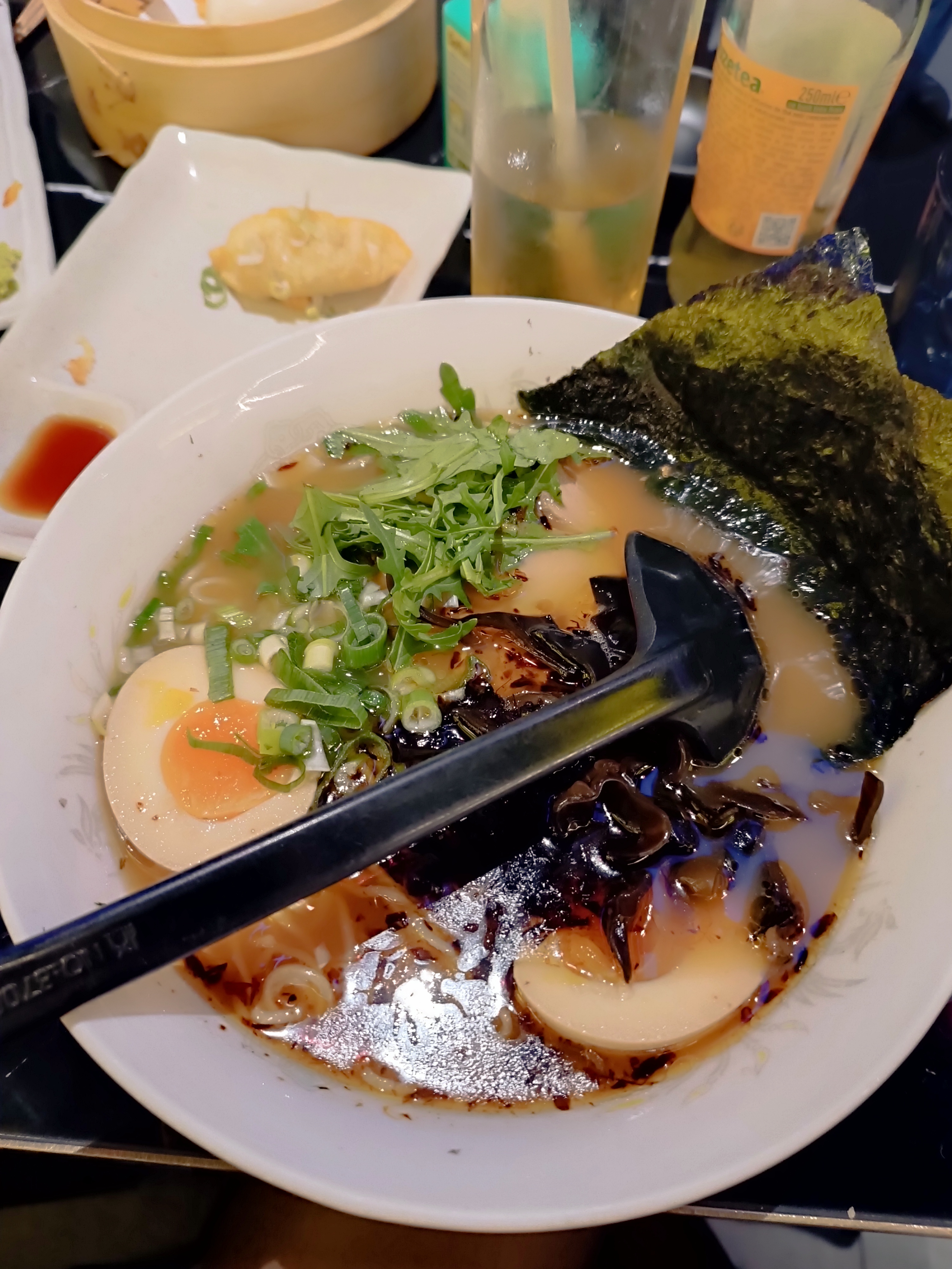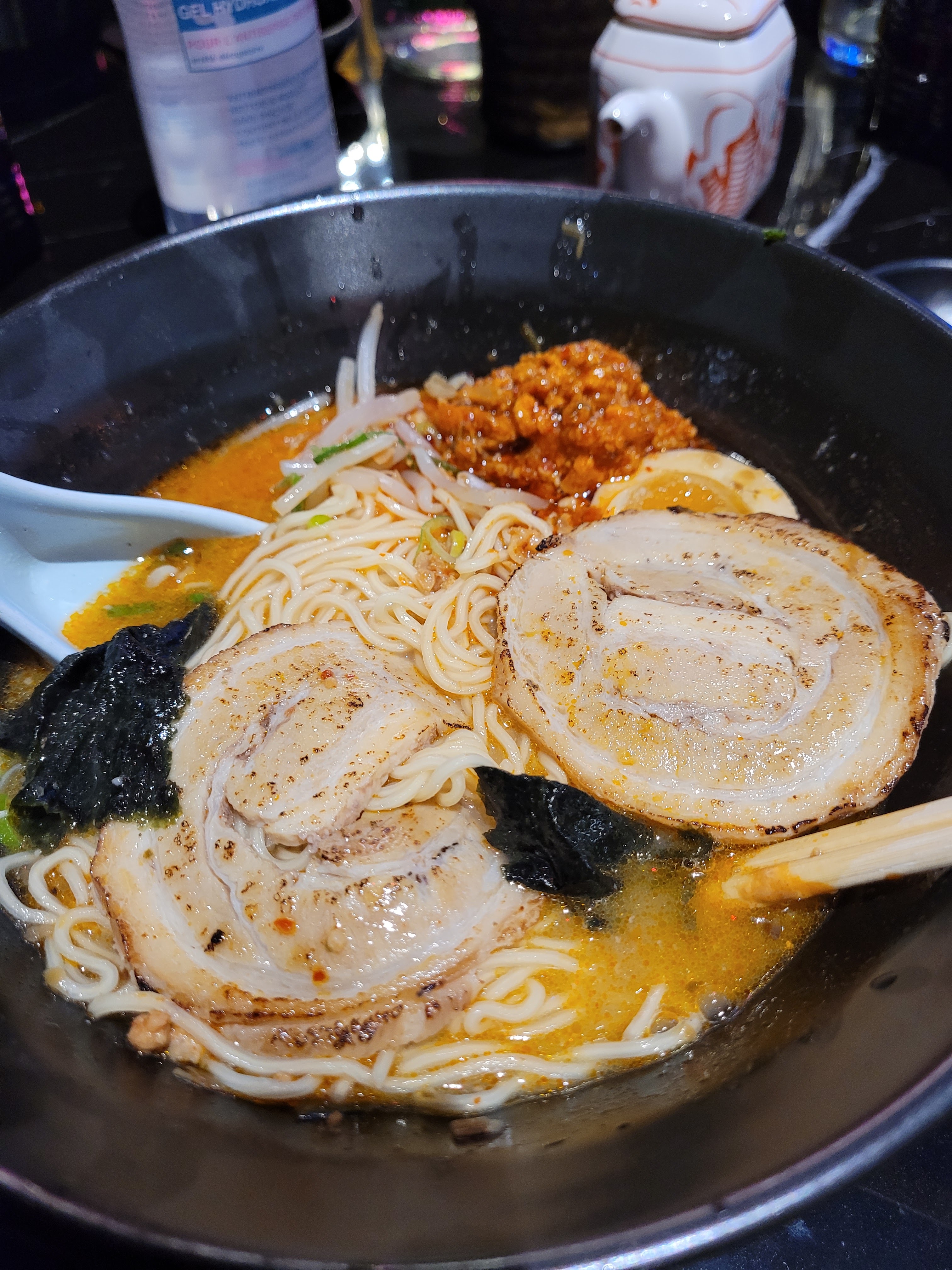 La déco est vraiment sympa quand on est installé au milieu ou au fond de la salle (ce qui n'était pas notre cas), par contre c'était très bruyant même en tout début de service où la salle n'était pas très remplie et la musique était vraiment pas terrible (+ vraiment pas adaptée à l'ambiance japonaise du lieu)... Nous avons testé les ramens et ils étaient bons mais sans le plus qui nous ferait venir ici plutôt qu'ailleurs. Pareil pour le karaage, il manquait de goût et de croustillant.