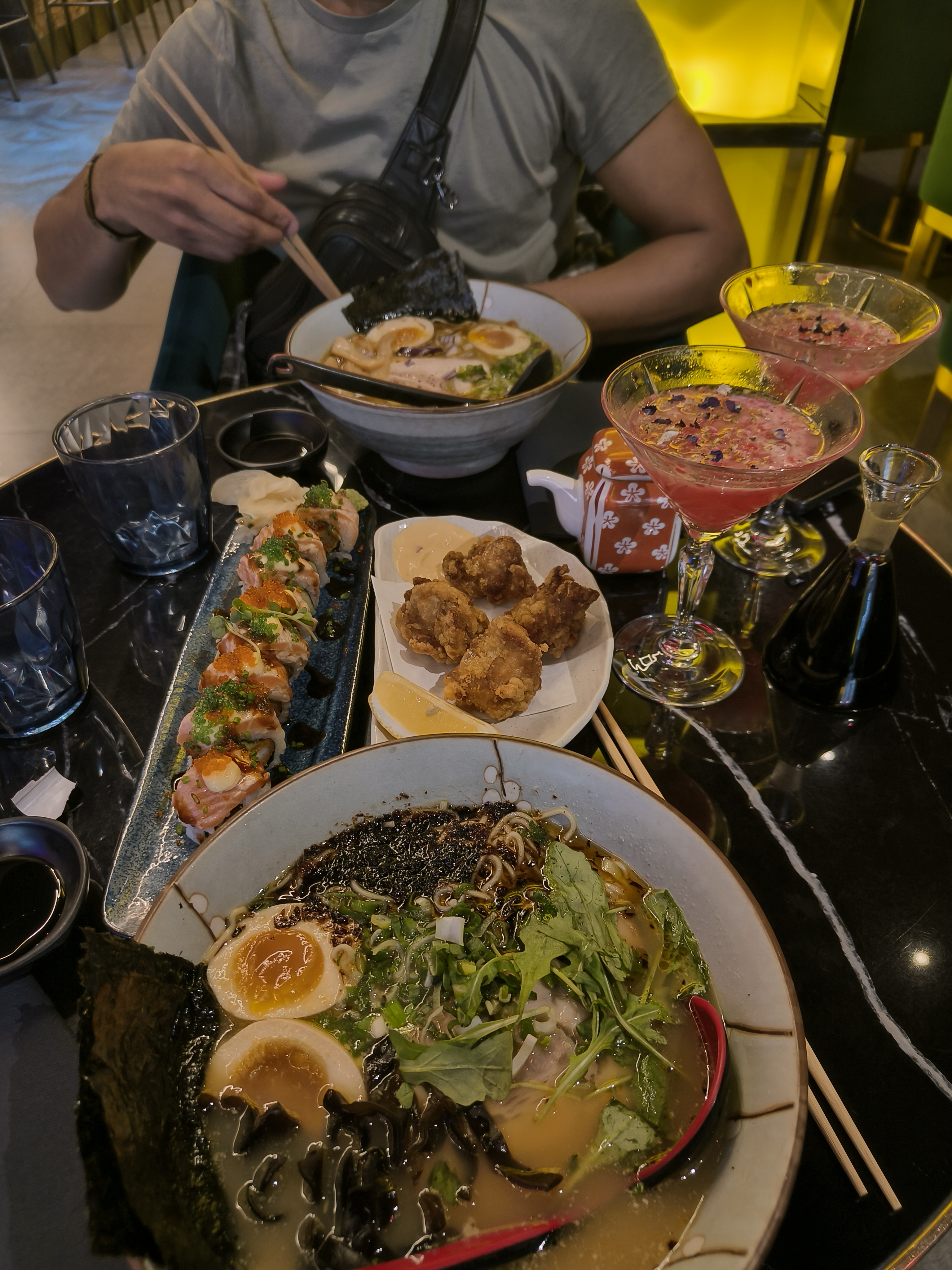 Très belle soirée pour un anniversaire dans l'ensemble je suis satisfaite juste déçue sur quelque points , concernant les ramen en ayant pris deux différents j'ai été déçue des bouillons qui n'avaient presque pas de goût . Sinon les autres plats que j'ai pris étaient excellents. Pareil pour les cocktails sans alcool. Deuxième hic les sanitaires il faut faire quelque chose pour la lumière bleu ce n'est pas agréable du tout enfin c'est mon avis mais rien que pour un anniversaire vouloir se refaire une beauté dans une lumière bleu c'est horrible. La déco a l'intérieur de la salle est superbe . Je conseille ce resto !