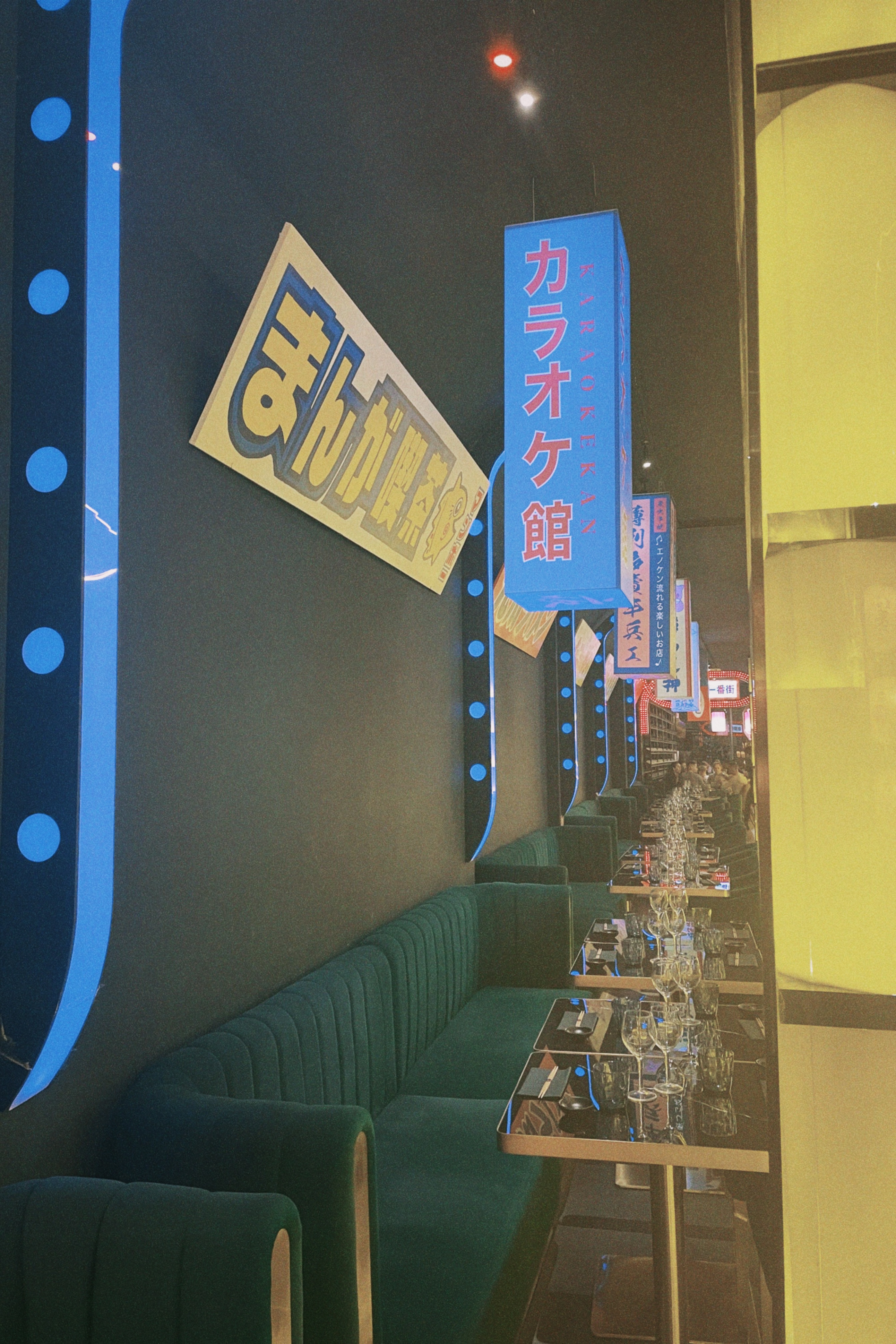 ❝ Plats japonais, saké et vin dans un restaurant moderne chic avec des néons. ❞