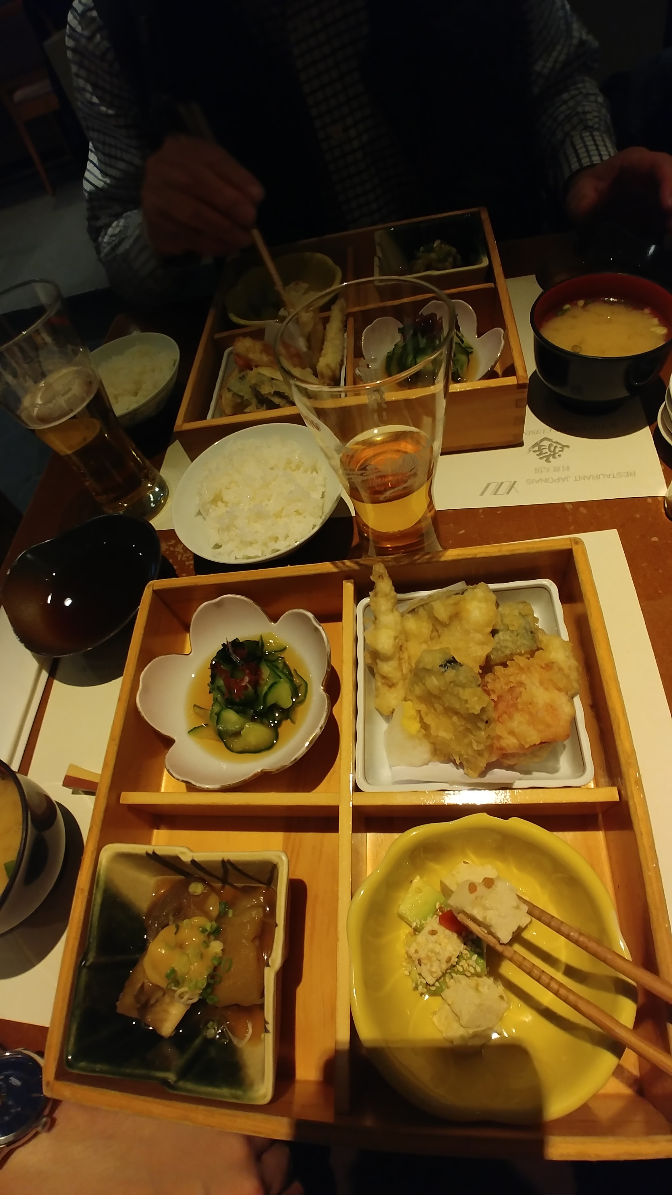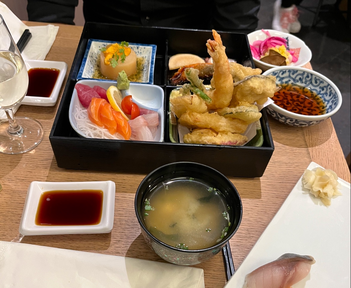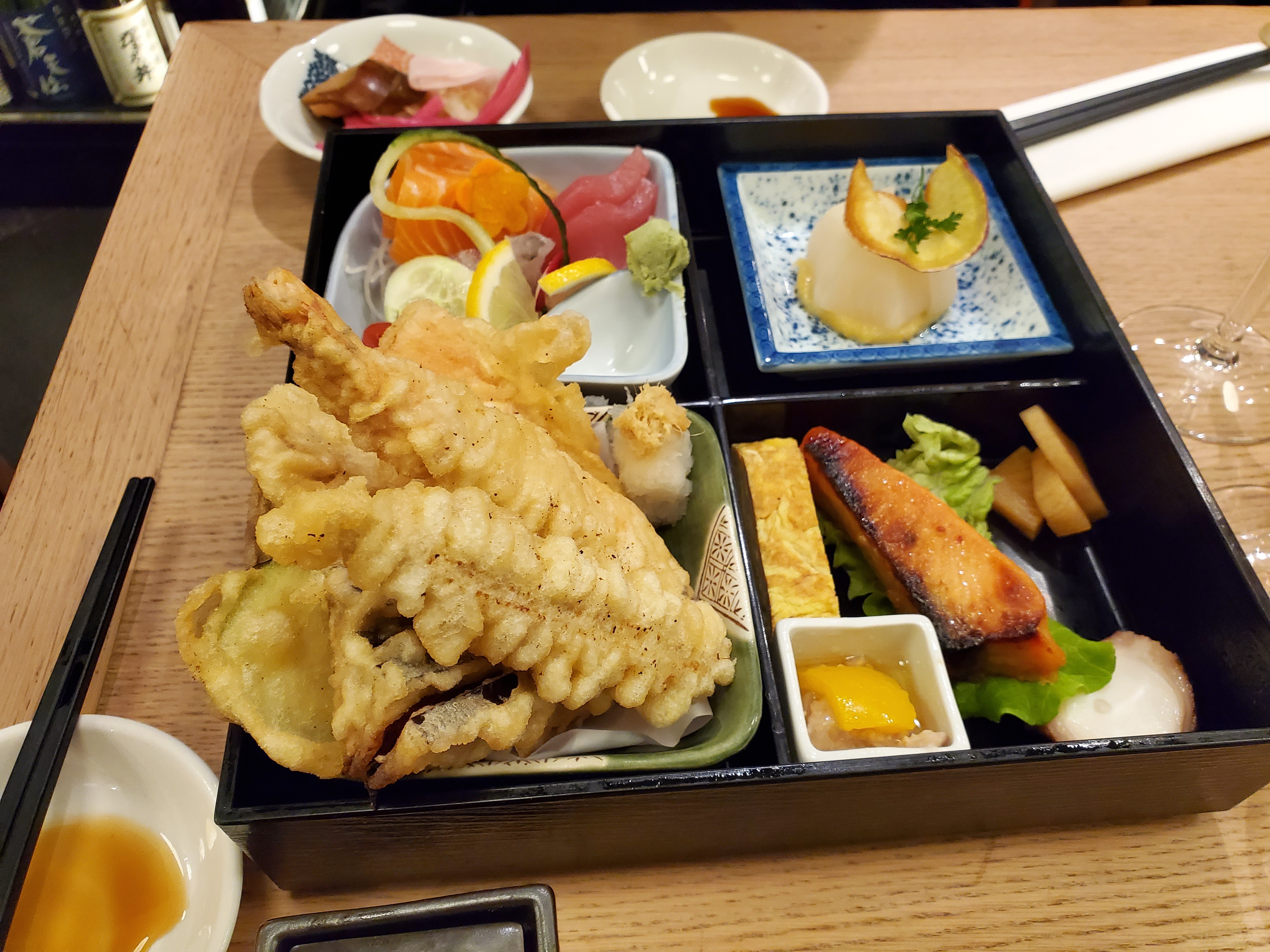 Menu bento avec tempura, sashimi, saumon grillé et navet, tout était délicieux. Un restaurant japonais qui reste authentique. Je ne m'en lasse pas