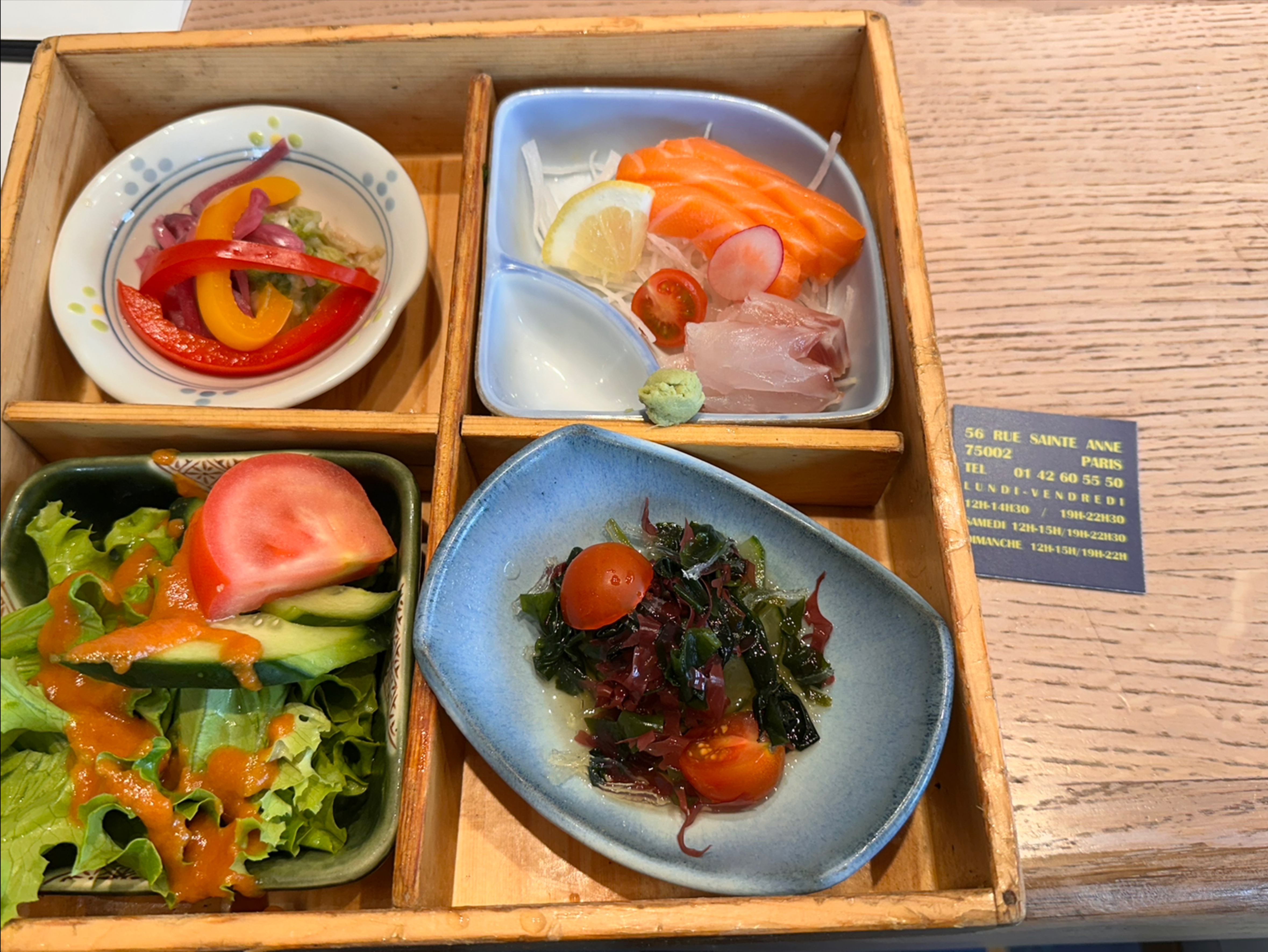 Je me suis régalé. J'ai pris le menu du jour : bento composé d'un radis cuit, viande de bœuf, sushis, saumon cuit accompagné de riz et soupe miso, c'était parfait pour 26 euros. Je recommande, difficile de faire un choix rue st Anne...