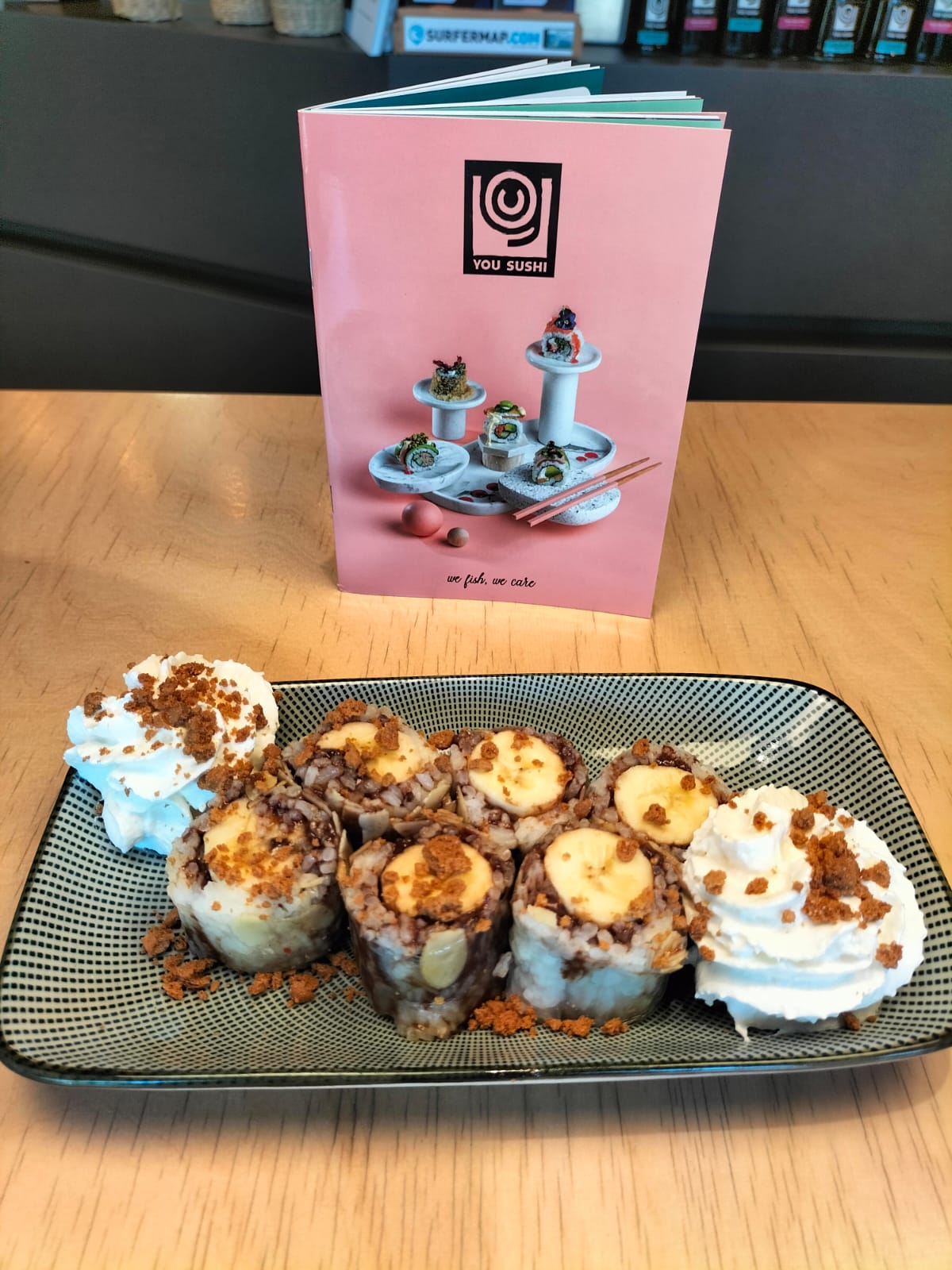 C'est en flanant place des 5 cantons que j'ai eu la joie d'y découvrir un You Sushi. Familière de celui de Capbreton, j'ai eu la chance d'être accueillie par la manager en chef. Mon compagnon et moi nous sommes régalés une fois encore. J'ai découvert le maki Nutella basque banane, excellente revisite de ce dessert bien connu des gourmands