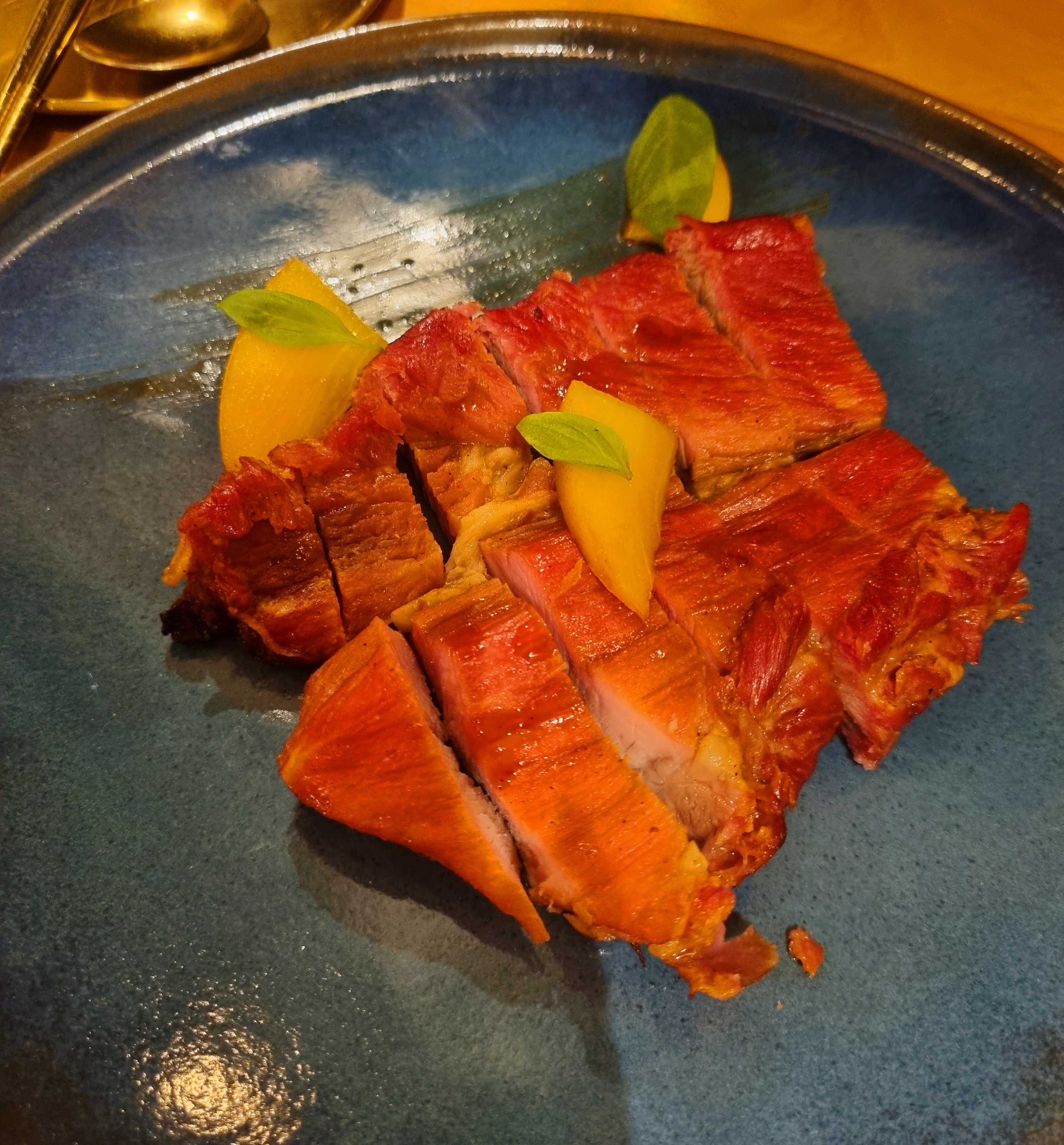 J'ai commandé deux plats, des crevettes frites à l'abri du typhon et un porc grillé. J'ai beaucoup de chance aujourd'hui. Le patron a dit que le porc grillé d'aujourd'hui utilise du porc noir ibérique. Il a un goût très différent du porc blanc européen que je mange habituellement. Après une bouchée, la graisse est riche et non grasse, pleine d'arômes, et il y a une touche de vin rosé, ça sent bon, probablement parce que j'ai utilisé du vin rosé lors de la transformation de la viande crue. Le goût sucré convient très bien au goût des habitants du sud du Jiangsu, et mes amis du Guangdong qui voyagent avec moi sont également d'accord avec ce goût. Quant à l'apéritif, j'ai commandé le siomai cantonais, qui était très tendre, avec juste ce qu'il fallait de jus, et les saveurs umami de champignon, de champignon et de crevette étaient très distinctes. Les plats de légumes froids inclus étaient également très bien mélangés. Les haricots verts, les carottes et les carottes avaient une texture très croustillante et on pouvait constater que le temps de cuisson était bien maîtrisé. Dans l'ensemble, c'est un restaurant qui privilégie le contrôle de la qualité et des matériaux. Vous pourrez tester le canard rôti la prochaine fois que vous viendrez ici. J'ai déjà hâte d'y être !