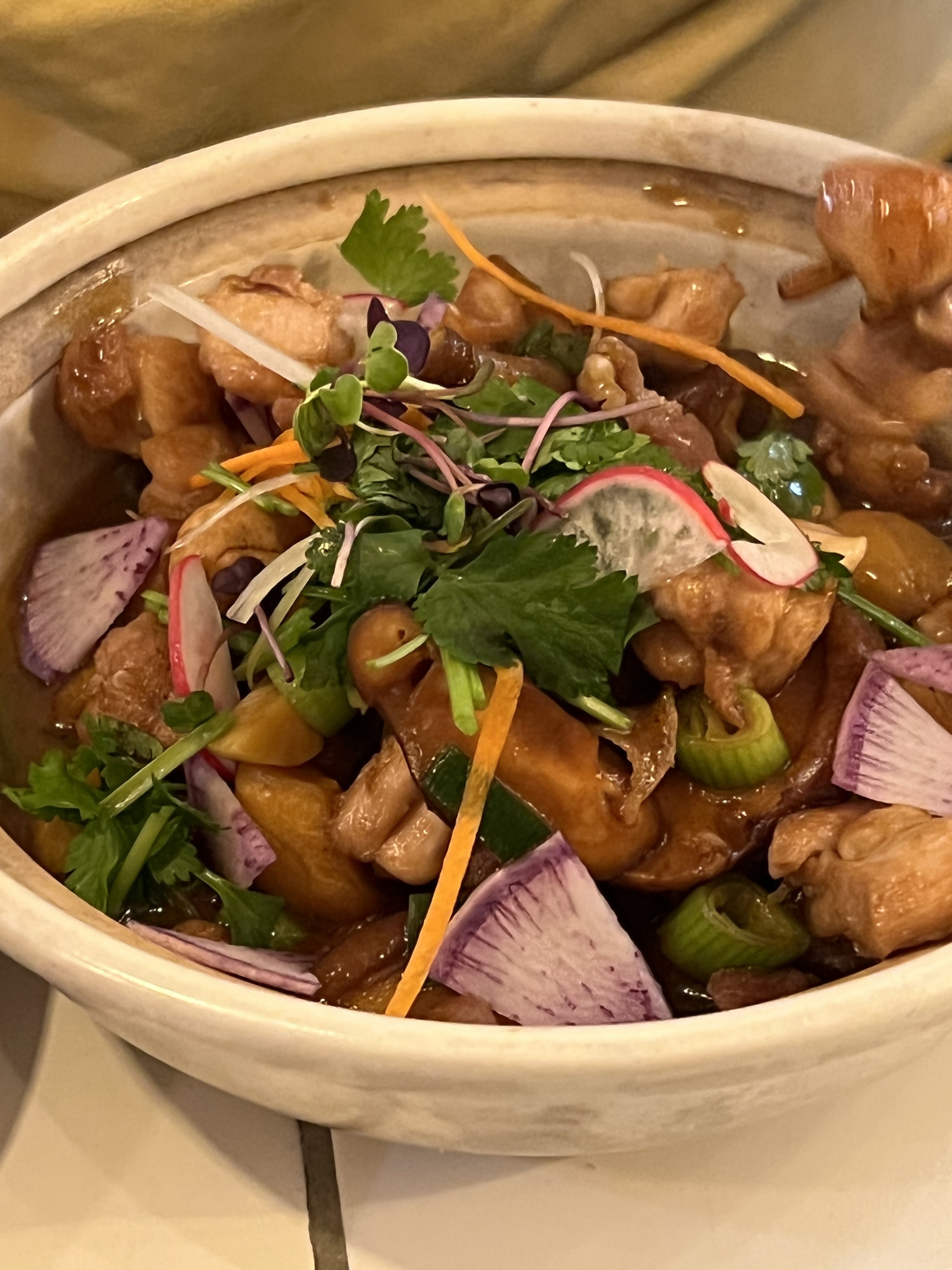 Nourriture fantastique, très authentique. C'est un restaurant chinois haut de gamme, alors attendez-vous à ce que les prix correspondent. Tout était solide (poitrine de daikon, trois tasses de poulet, salade du jour et aubergines sauce à l'ail). Décor mignon et semblait avoir une bonne gamme de whiskies asiatiques et de saké exposés. Excusez ma photo (à emporter sur le lit de l'hôtel à cause du bébé).