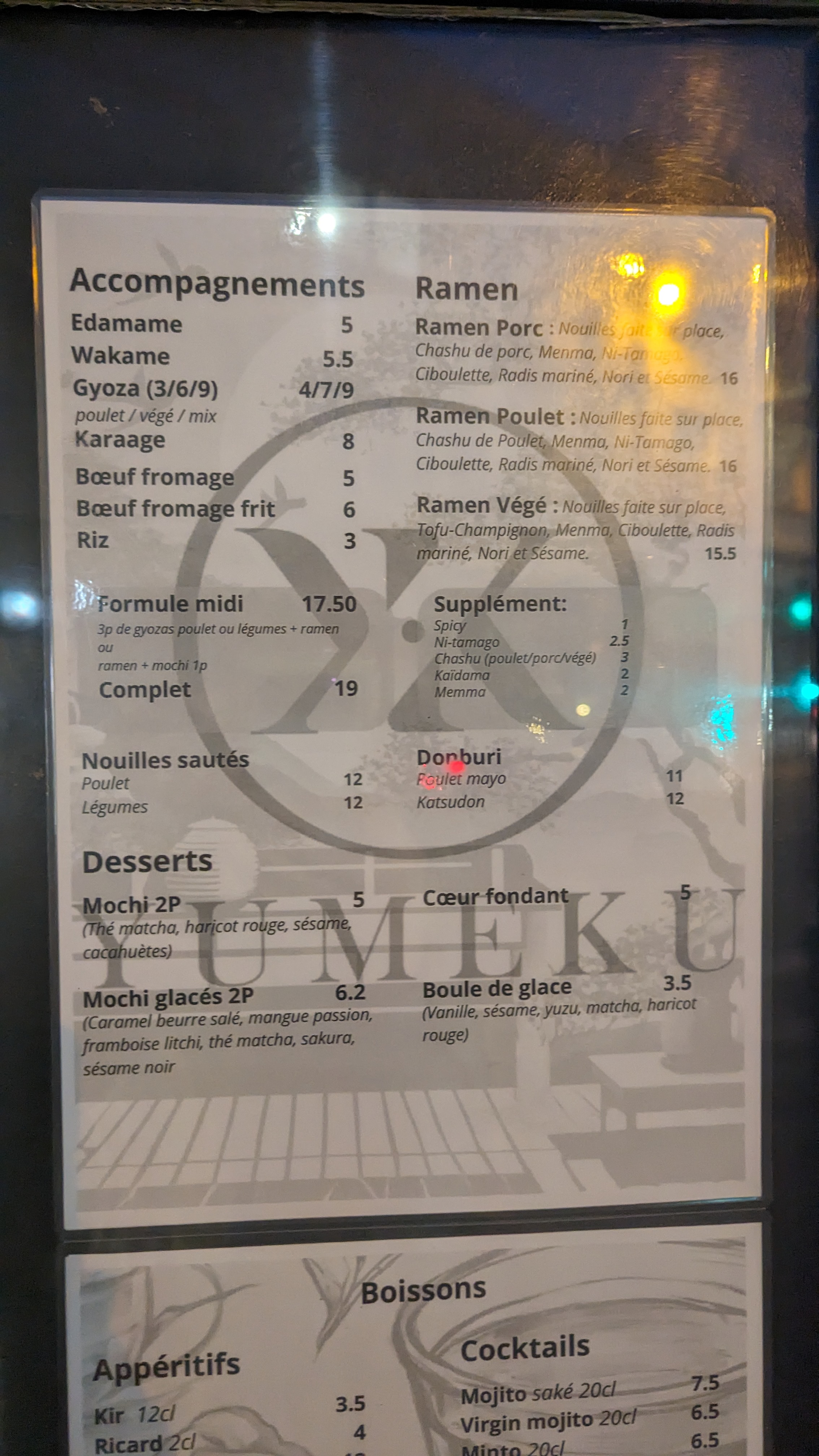 J'ai adoré manger à yumeku, un personnel gentil, une jolie déco avec des manga à disposition (de bon choix). La cuisine était de qualité, généreuse et délicieuse. Je vous conseille d'aller manger là-bas !