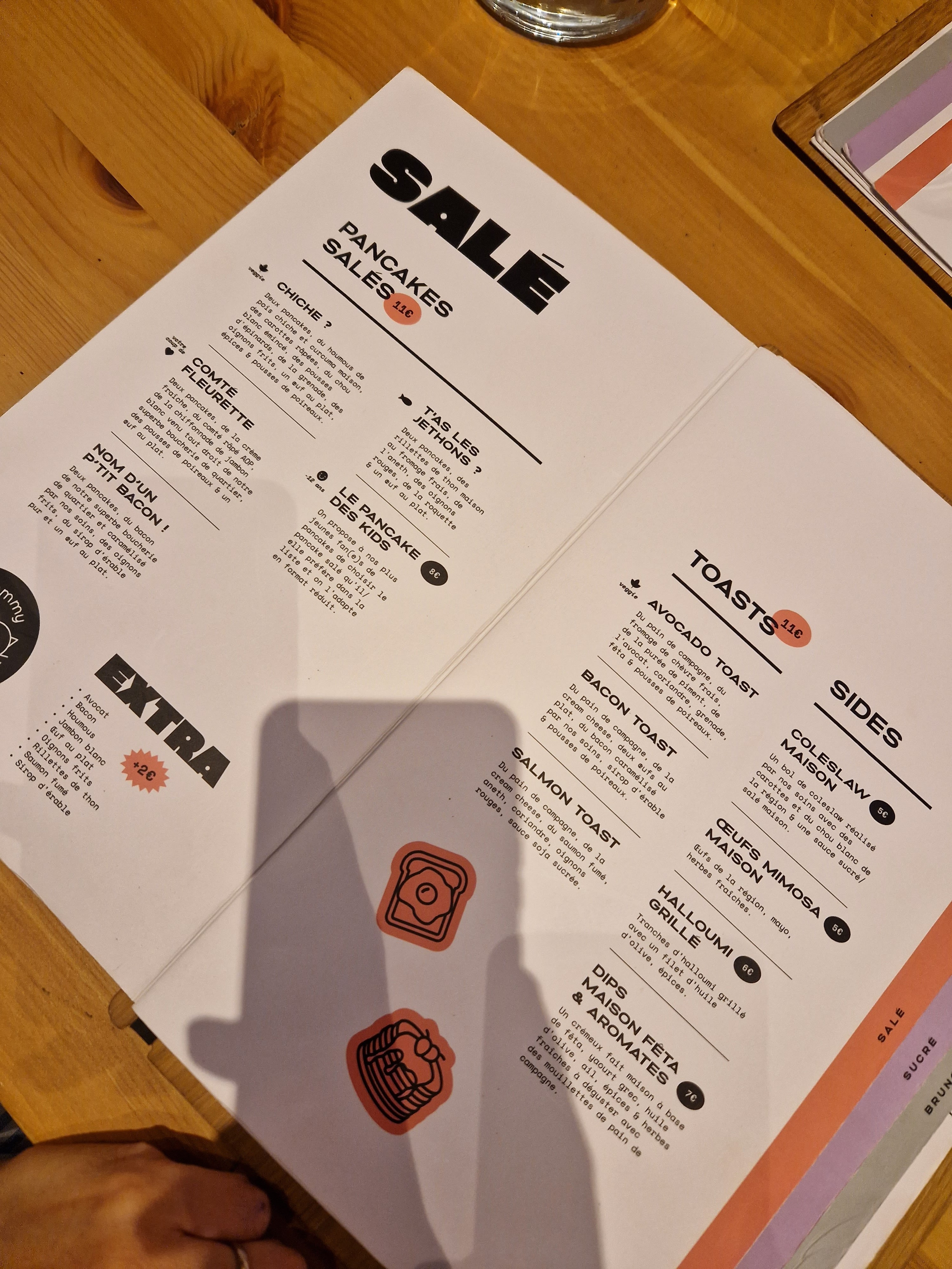 Deuxième fois que nous venions bruncher et quelle déception. (La première fois au mois de mai 2023, avait été parfaite). Ce jour, service catastrophique, 1h00 d'attente pour être servis de nos premiers pancakes + une serveuse désagréable, pas un sourire de tout le service, qui a passé son temps sur son téléphone (à manger devant les clients alors que le service venait tout juste de commencer) + après plusieurs demandes pour des couverts manquants, elle nous les a balancé sur la table (dont une fourchette qui était sale, et qui ne s'est pas excusée quand nous lui avons rapporté). Dommage car le reste de l'équipe avait l'air plus sympathique. Pas une seule fois on nous a demandé si le service se passait bien. Les pancakes sont toutefois très bons, coup de coeur pour le pancake à la pâte à tartiner noisettes et celui au comté (petite déception pour le pancake avocat qui pour moi n'était pas assez garni, préférez plutôt l'avocado toast). Le thé glacé au gingembre est très appréciable également. Le rapport qualité prix est parfait, mais le mauvais service de cette fois ne me donne pas envie de revenir. Dommage