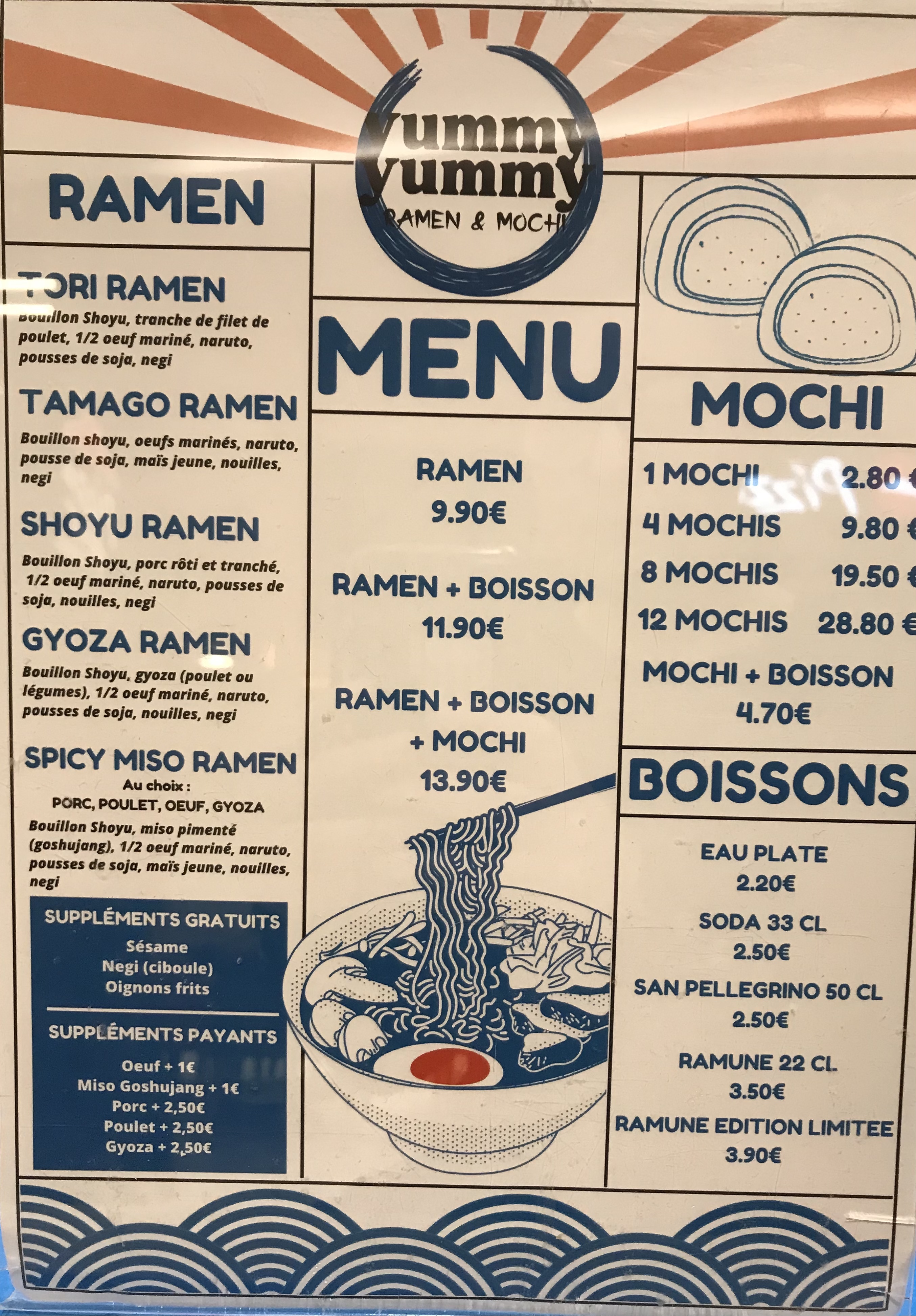 Pour autant leurs mochis sont bons et sont faits sous vos yeux mais les ramens sont immangeables vraiment et je pèse mes mots… Par où commencer : pas de porc chashu mais des tranches de roti froid, pas d’oeuf mollet mais des oeufs durs tout juste sorti du frigo encore froids, des gyozas a peine décongelés, un bouillon insipide composé d’eau et de sauce soja…. Le seul point positif à la rigueur : les nouilles. C’était un bon pari de proposer une offre de ramen car effectivement il n’y en a pas dans le coin mais il faut savoir s’en donner les moyens et utiliser des produits un minimum qualitatifs.. Sinon remplacer la mention « ramen » par « soupe de nouilles ». Vous n’avez que la possibilité de vous améliorer. L’équipe est agréable.