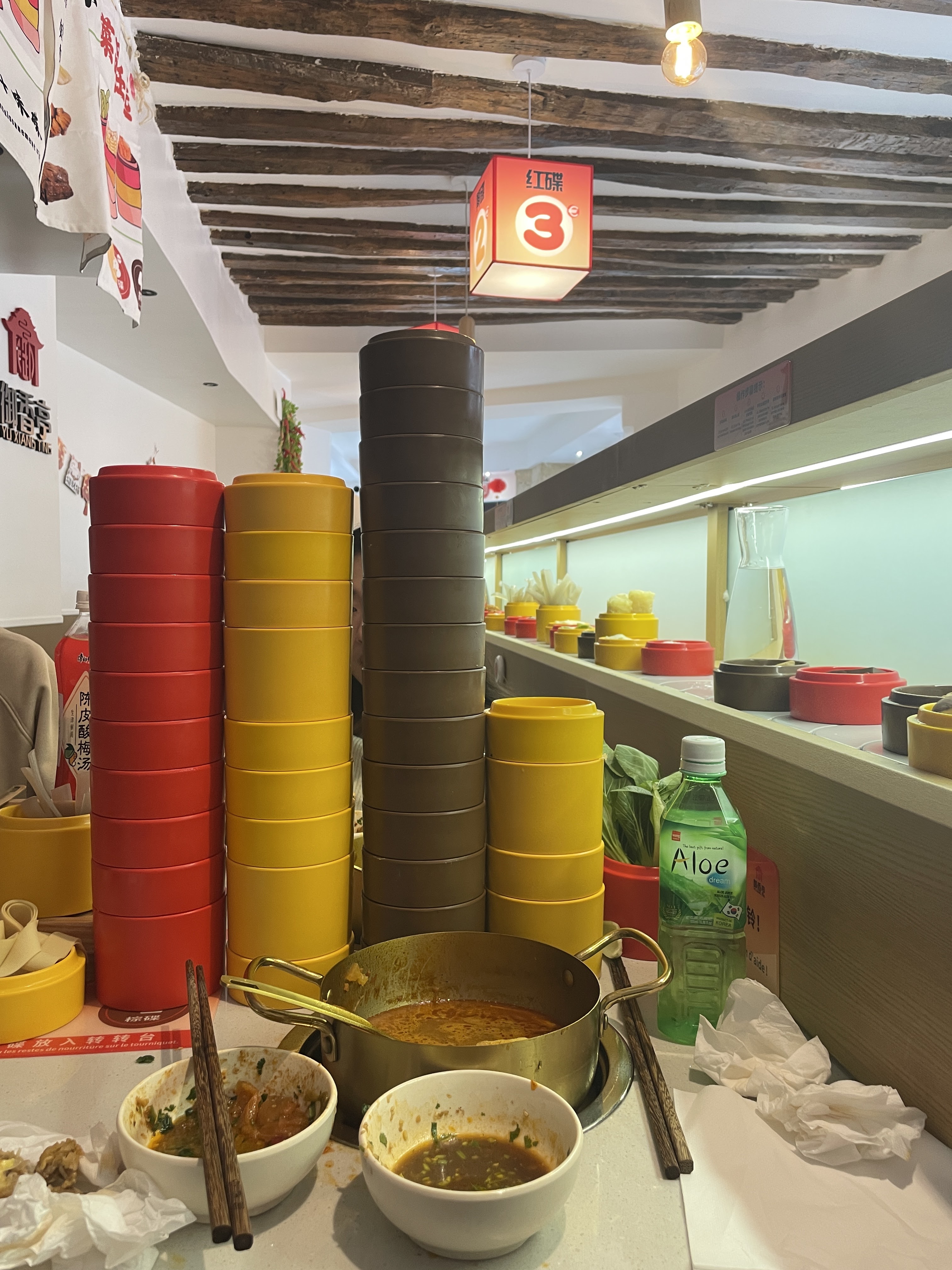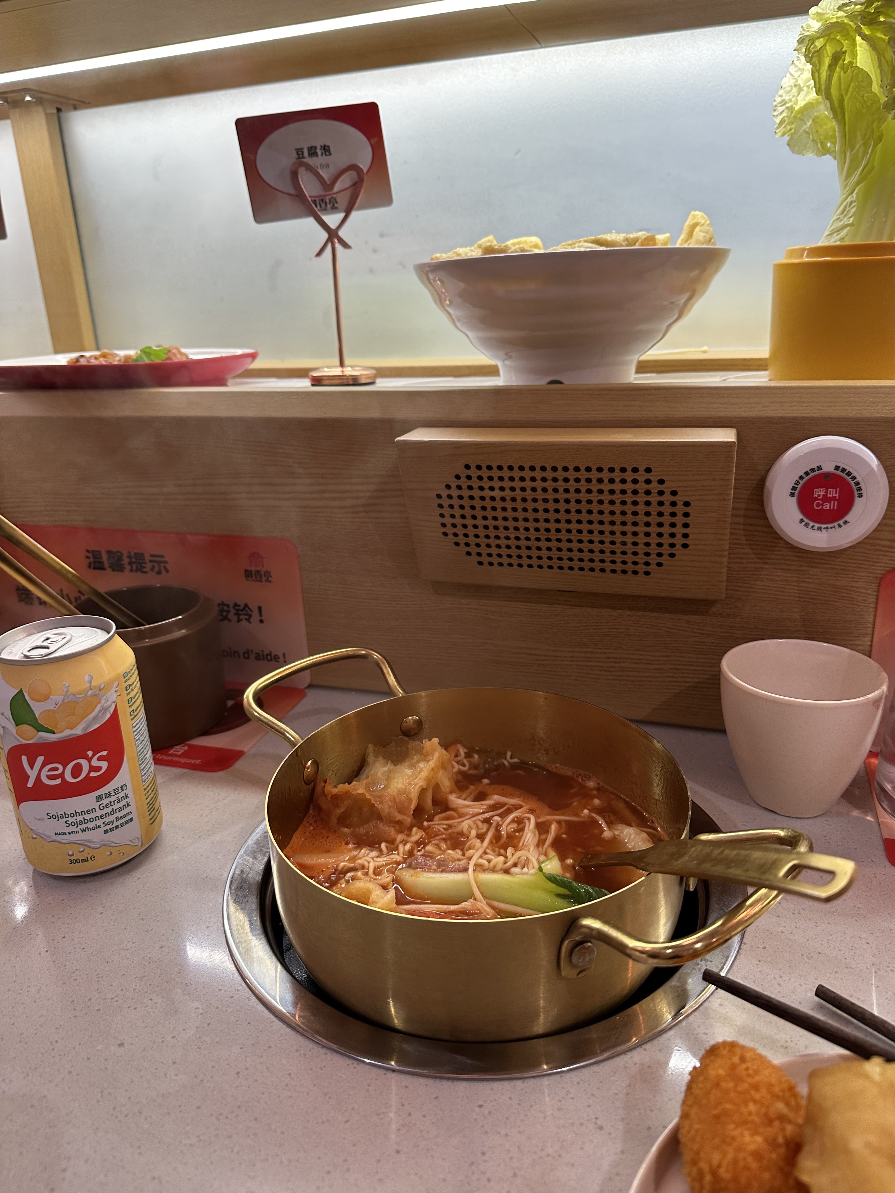 Ce petit restaurant vient d'ouvrir. Il est très sympa. Vous commandez votre bouillon et éventuellement des tranches de viande via un QR code en face de votre place. Le hot pot arrive en train (tchoutchou :-). Vous prenez une sauce au contoir des sauces puis vous prenez les pots d'ingrédients qui se déplacent sur un tapis devant vous et les rajoutez dans votre hot pot. Le prix dépend du nombre de pots et de leurs couleurs. Comptez 2,3 et 4 euros par plat en plus du bouillon à 7 euros. Si vous êtes vegetarien choississez le bouillon tomate comme moi. Plein à 19h donc mieux vaut y être à 18h30 ou 20h30. Je conseille d'y aller à 2 ou 3 pour avoir plus de chances d'avoir une place rapidement.