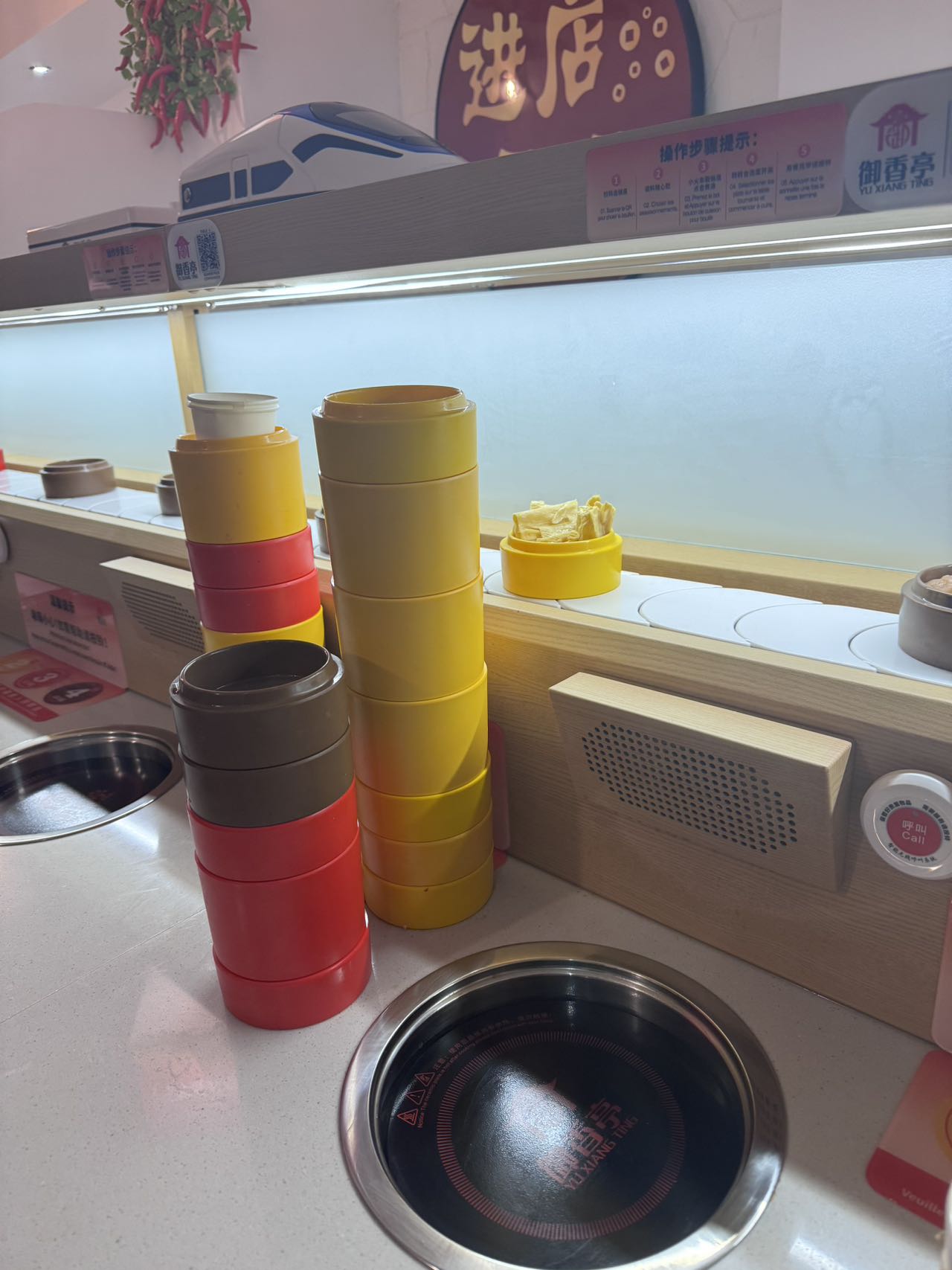 Depuis que j'ai appris que Paris avait ouvert une fondue tournante, j'avais hâte d'en faire l'expérience. L'ambiance est géniale. La base de soupe hot pot est livrée par petit train !Le prix est calculé en fonction de la couleur de l'assiette. Quand je compte les assiettes à la fin du repas, je ressens un sentiment d'accomplissement😌. Ci-joint une photo. Il y a quatre filles et un garçon à notre table. Les sliders de crevettes et le poulet secret sont fortement recommandés. Le poulet était tendre et mariné. Je pense qu'il y a beaucoup de choix. Au fur et à mesure que vous mangez, vous débloquerez plus de plats, comme des œufs au plat, du bœuf braisé, des raviolis, des tripes, des pommes de terre râpées, de la viande de déjeuner, des petites saucisses, etc. Très approprié pour une personne à manger.