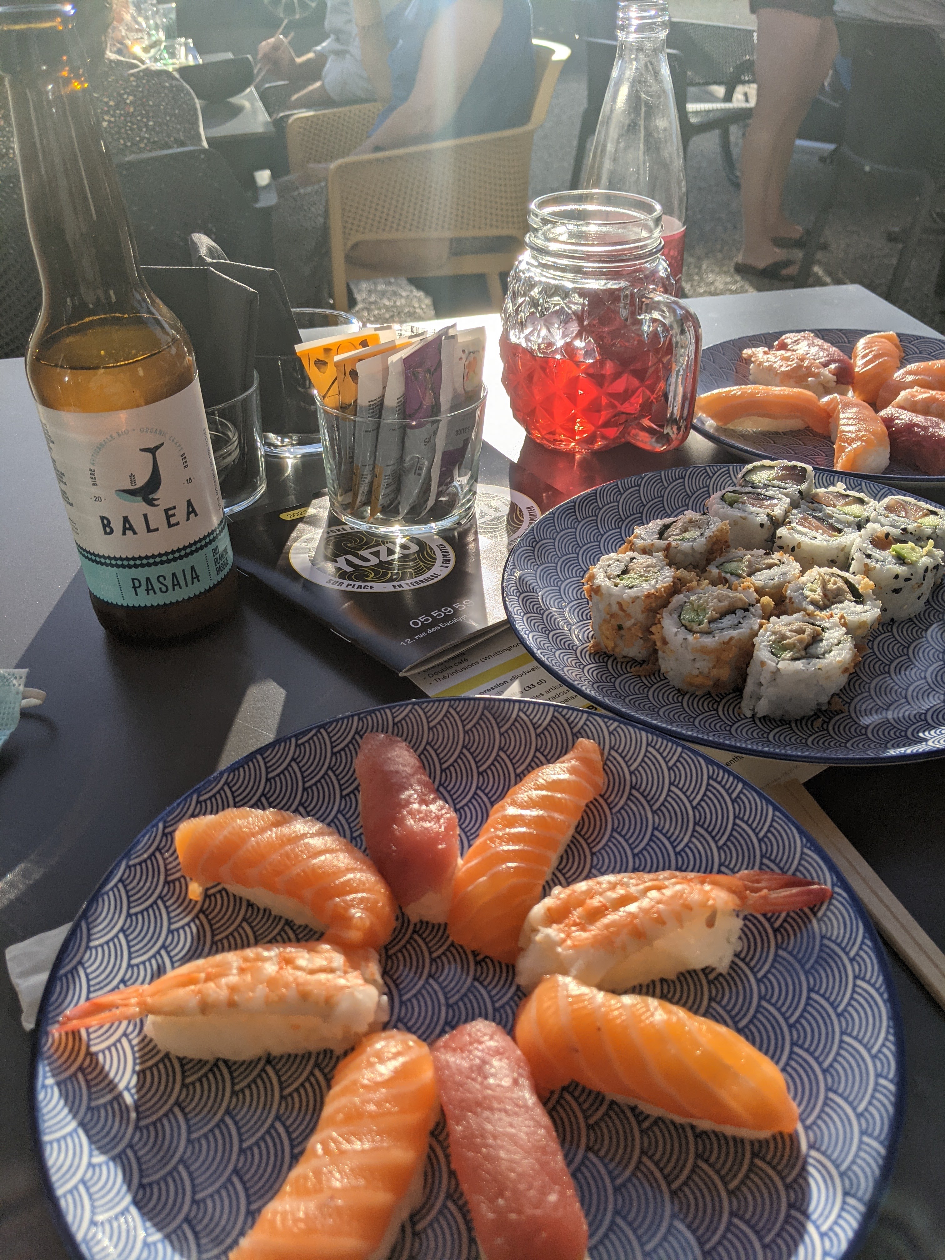 Les sushis sont fins et succulents, il y a la touche basque (sushi aux piquillos et fromage frais). Produit frais, Excellent, rapide et très sympa. Le petit moins, le tarif...