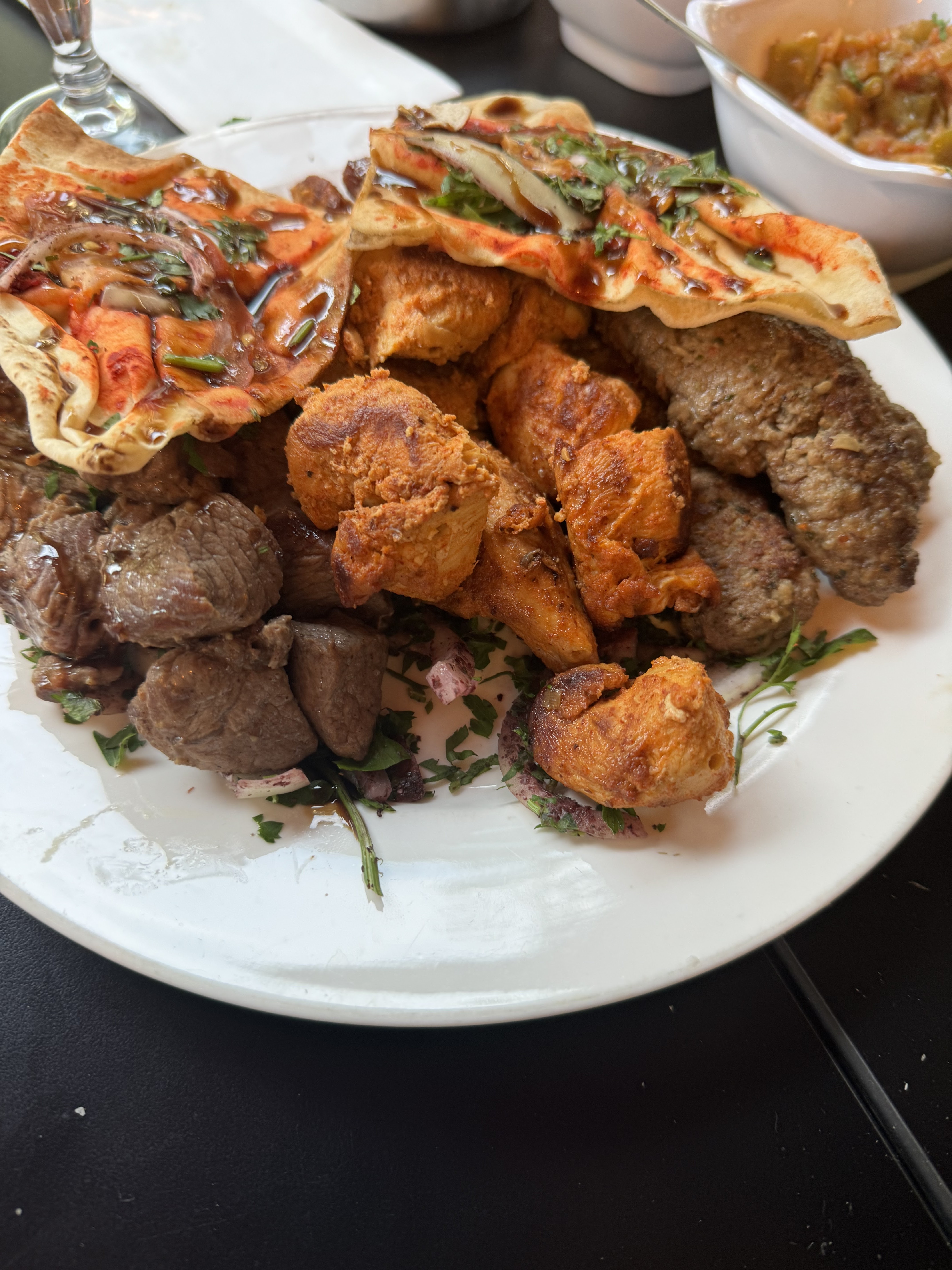 On a pris une assiette kefta, super garnie et excellente. Les baklava sont sublimes. Le cuisinier et la serveuse on été super sympas avec nos 2 filles. On recommande, tout était parfait.