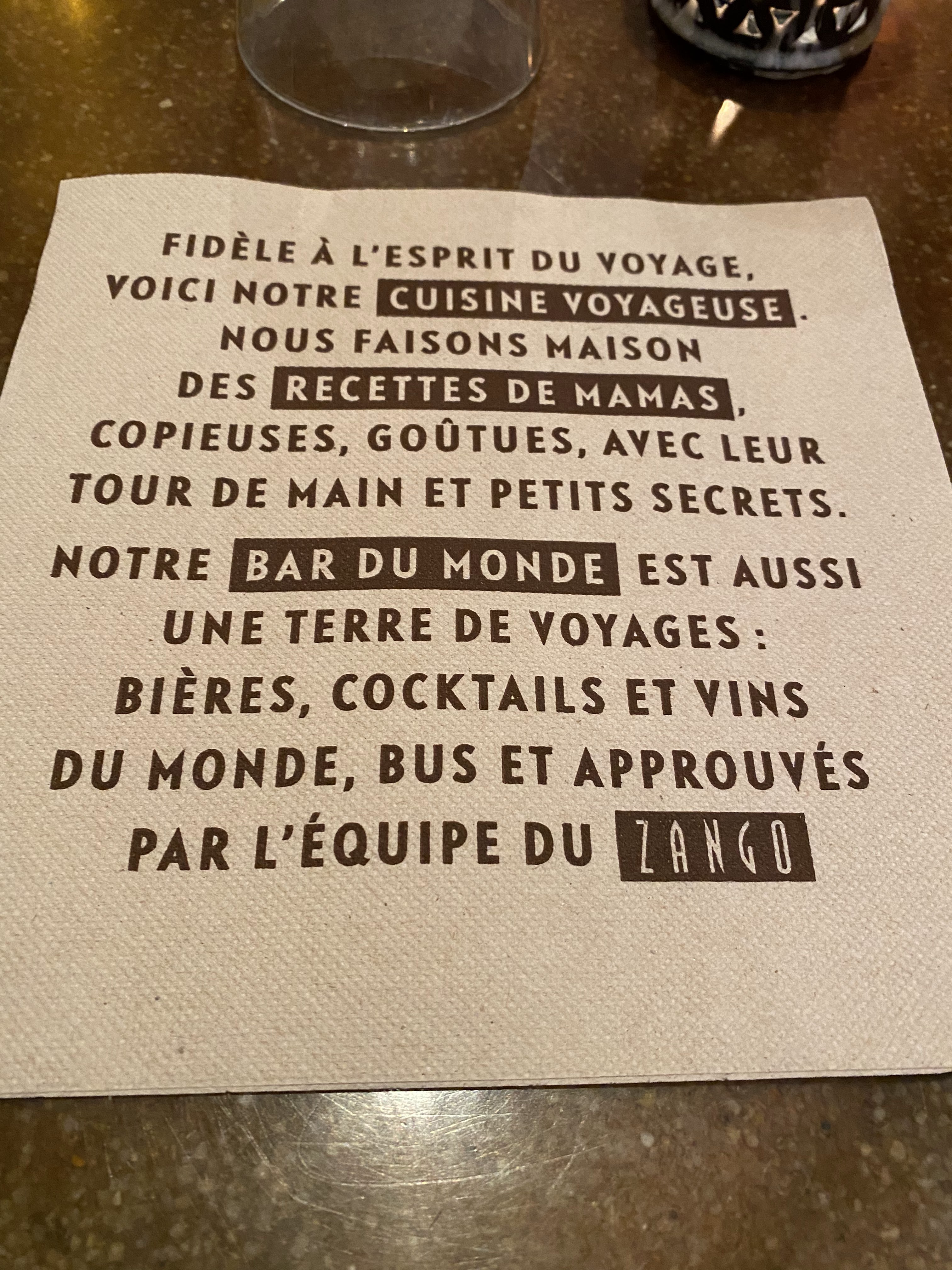 Je suis venue manger hier avec un ami au ZANGO, je vous le conseil pour l'équipe qui est très accueillante et agréable. On y mange très bien des plats avec des inspirations de tout les continents. J'ai apprécié également le décors original et chaleureux avec ses inspirations ethniques. Un bon moment passé là-bas, à refaire